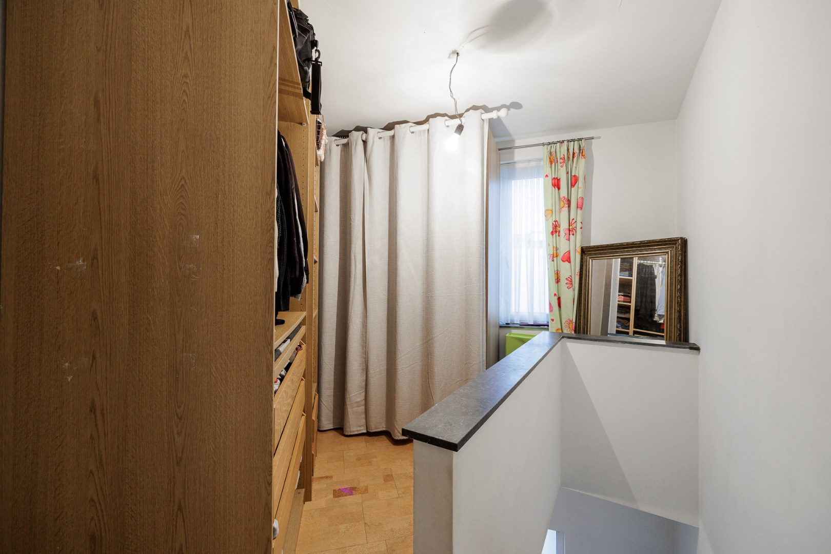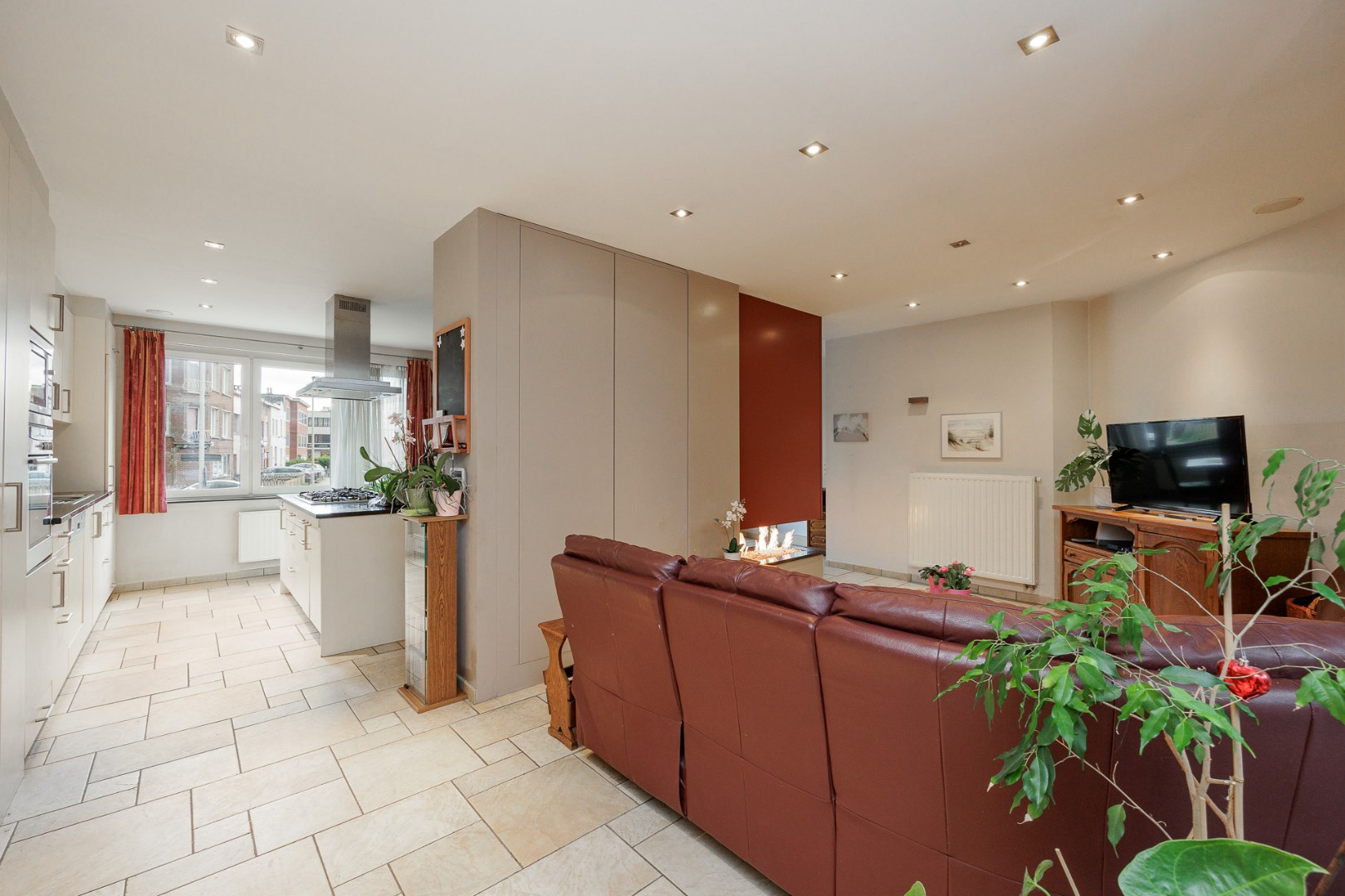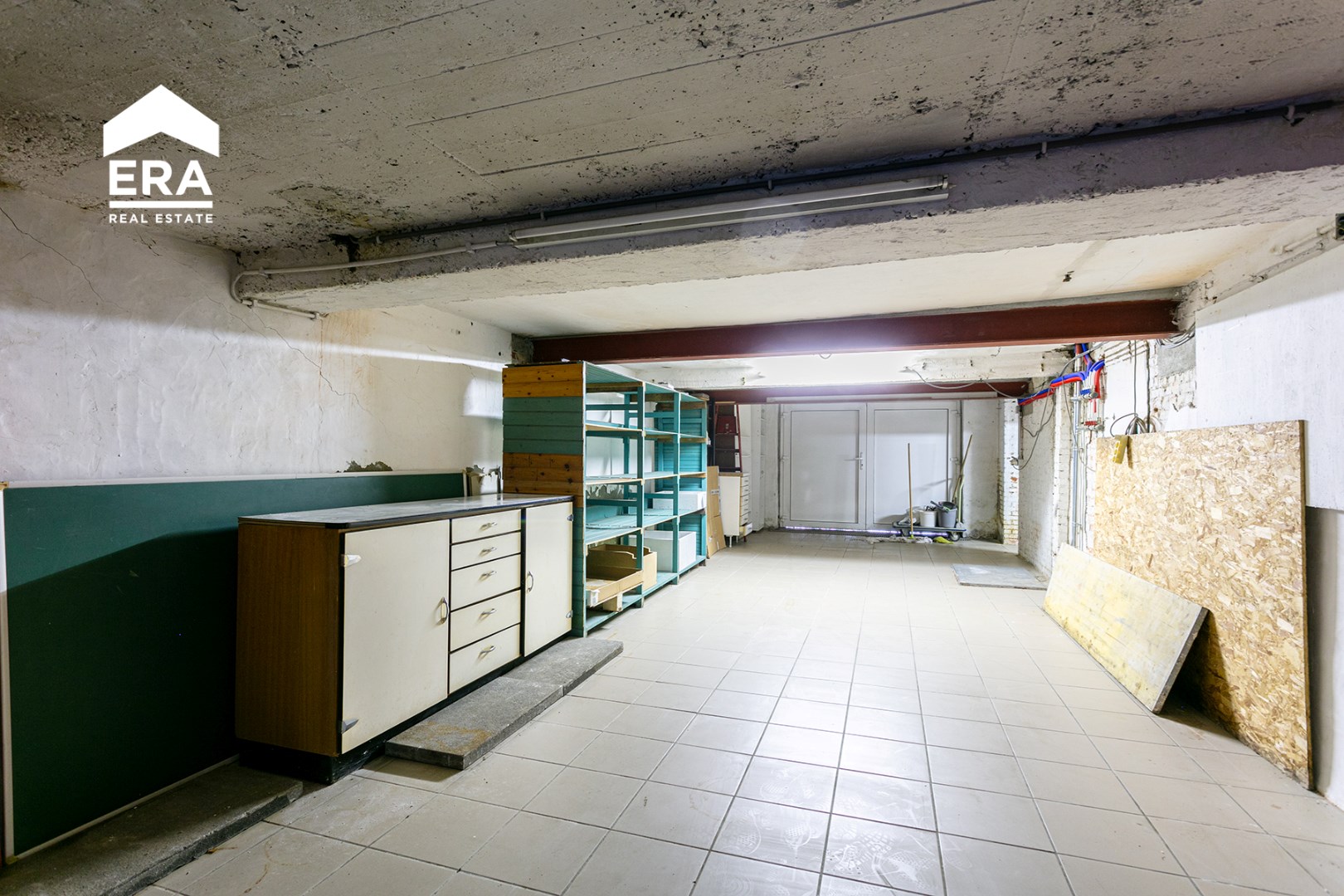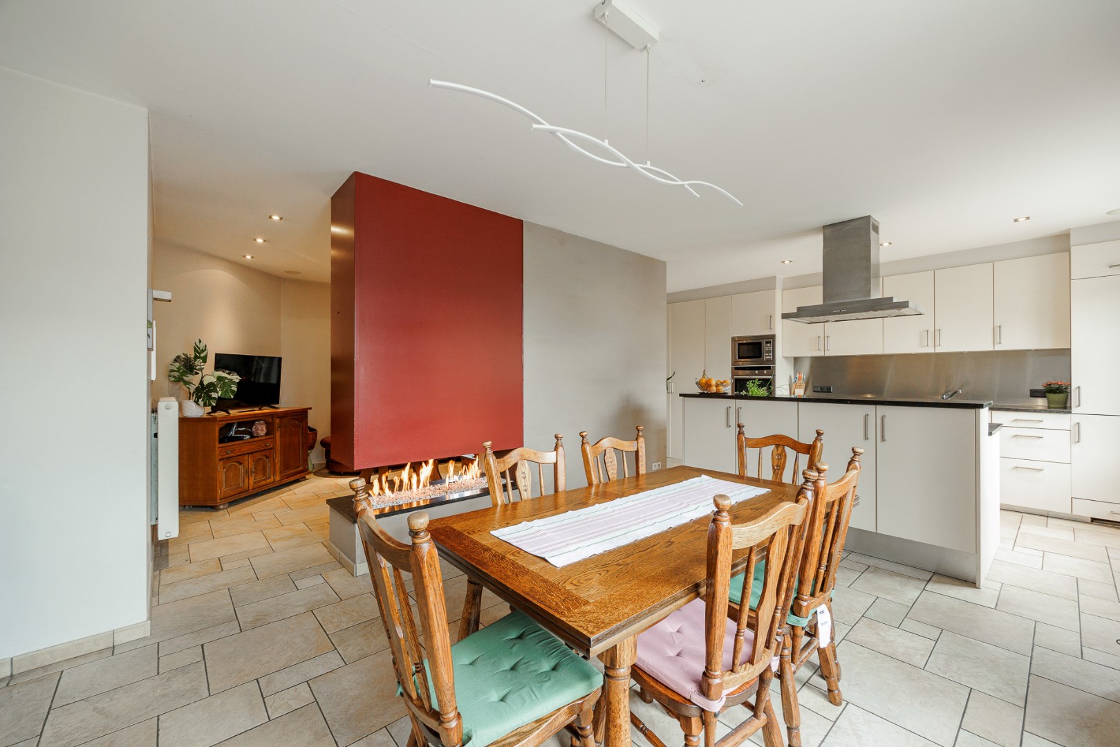 Gelijkvloers verdieping: Via de trap bereikt u de woning en komt u binnen in de inkomhal met vestiaire. Hier is er een apart gastentoilet voorzien en bevindt er zich de doorgang naar de -1 verdieping. De woonkamer (23m²) is gescheiden van de eetkamer (26m²) en open keuken door een gezellige open haard (gas). De keuken is volledig geïnstalleerd met een gaskookplaat (6-pits), een dampkap, een dubbele spoelbak, een geïntegreerde vaatwasser, een oven, een microgolfoven, een koelkast en een diepvriezer. Aanpalend is er de mooi onderhouden koer (13m²) met tuinhuis.