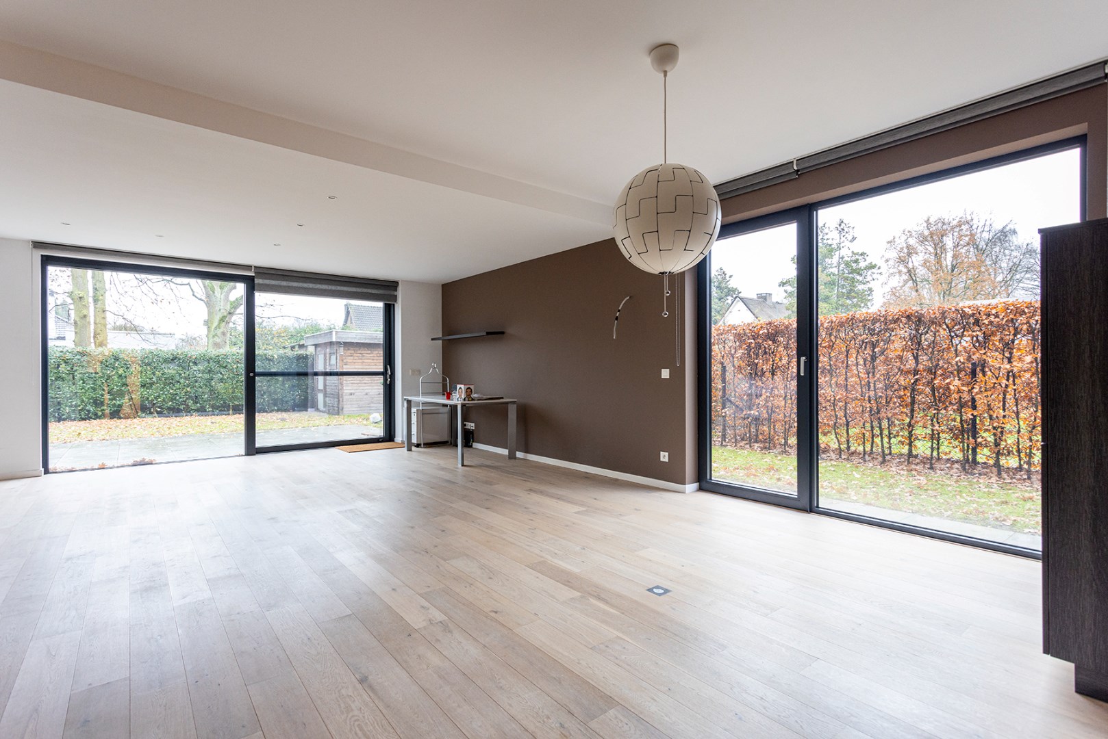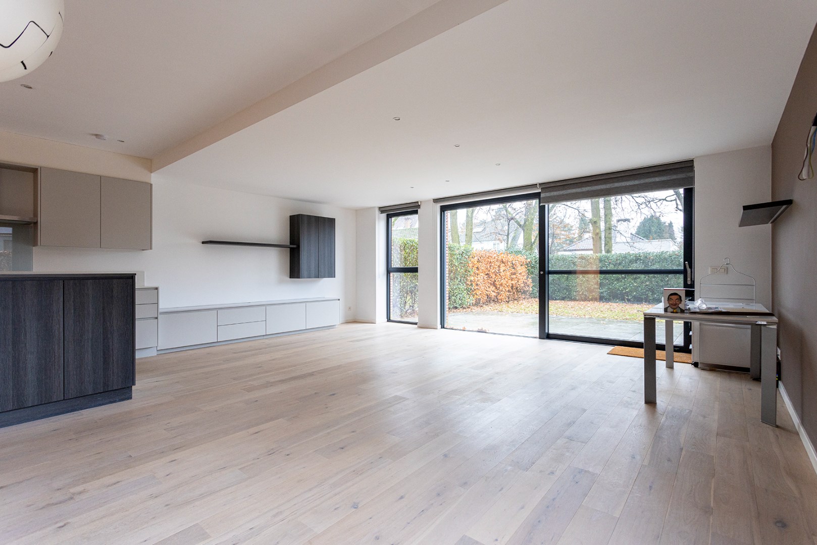 Lichtrijke leefruimte: Ruime woonkamer met grote raampartijen en een open, volledig uitgeruste keuken.