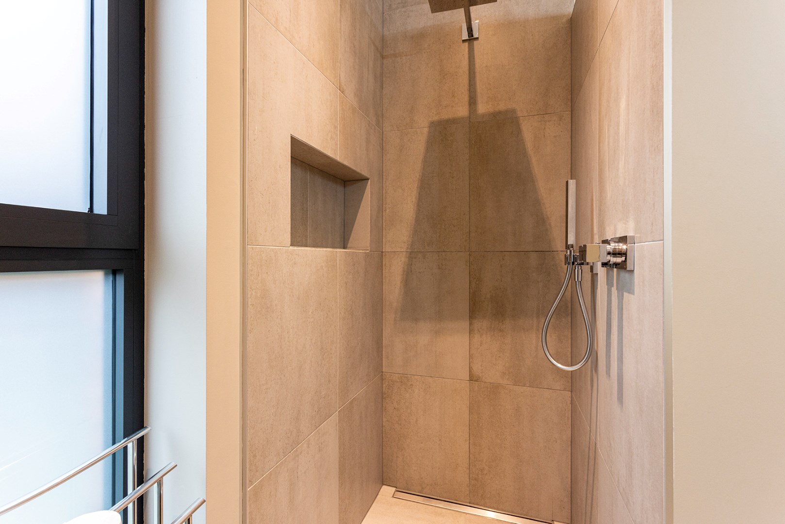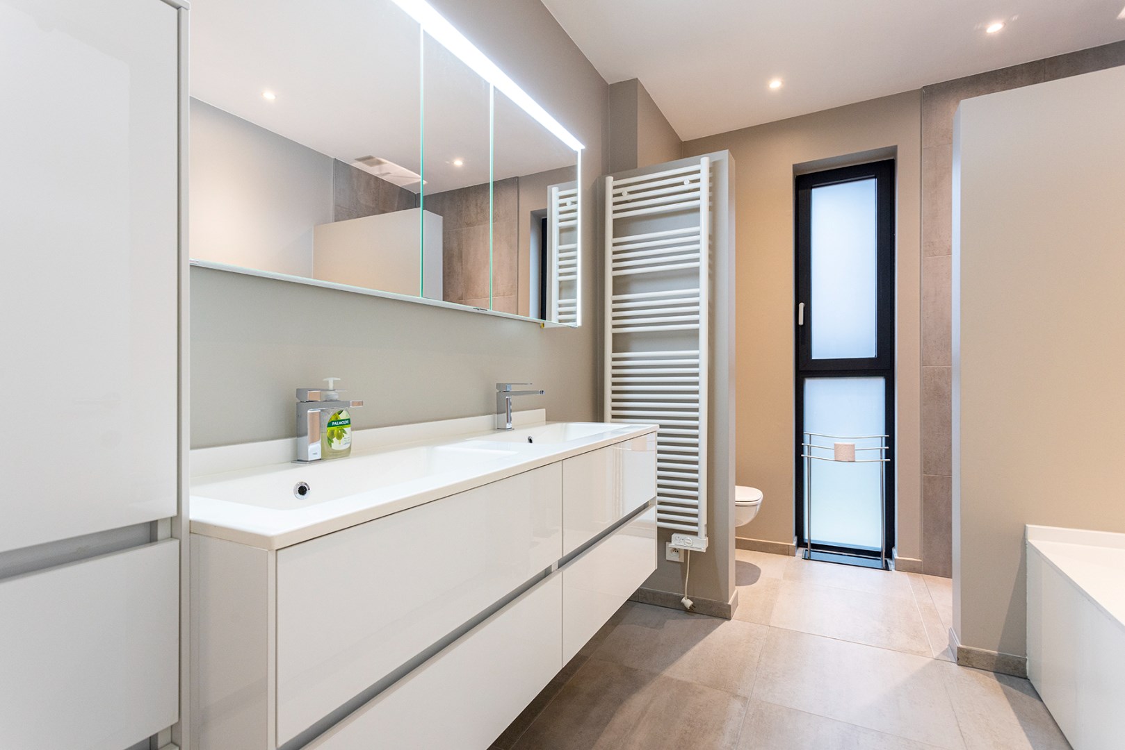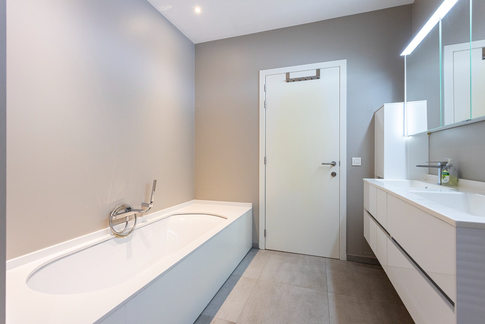 Badkamer & toilet: Moderne badkamer met dubbele lavabo, ligbad, toilet en een comfortabele inloopdouche. Apart toilet bereikbaar via de hal.