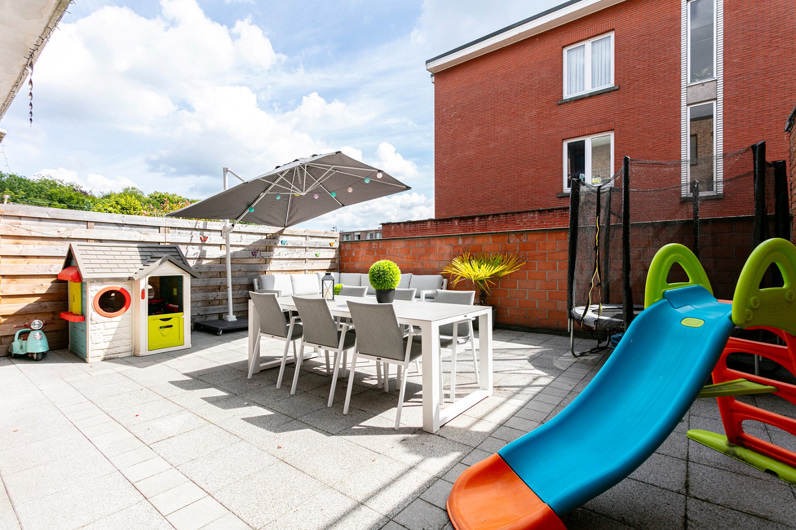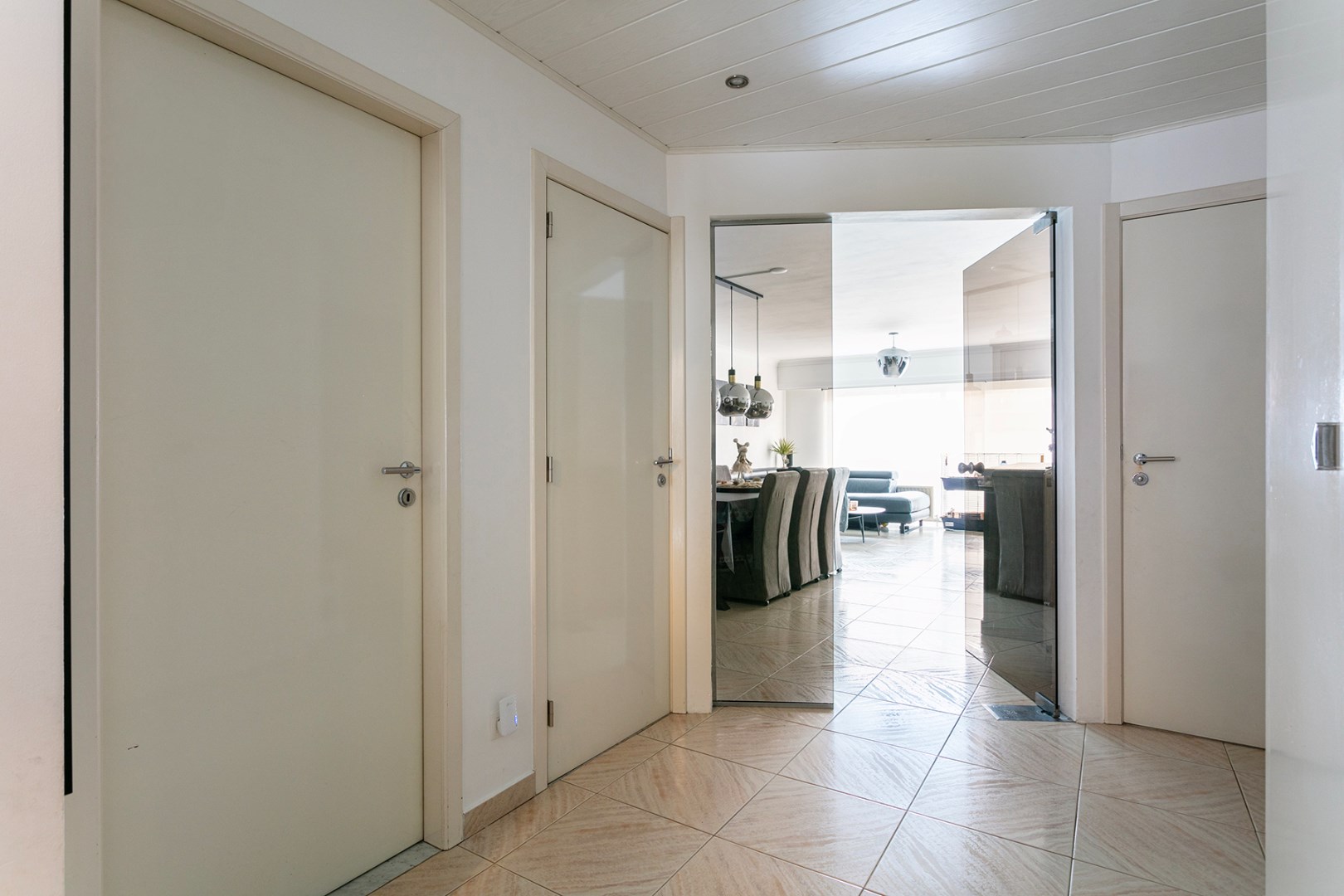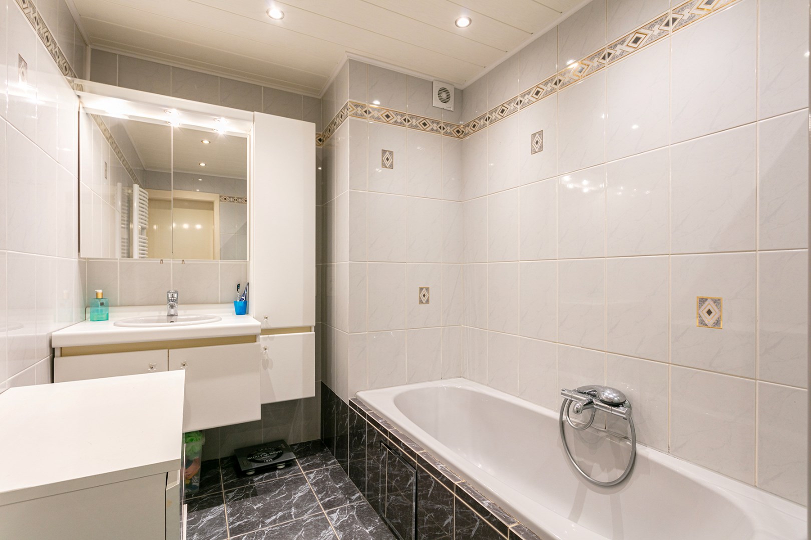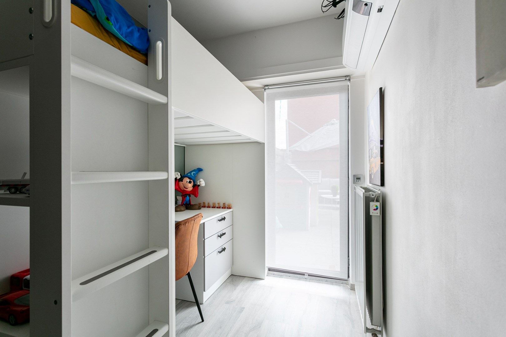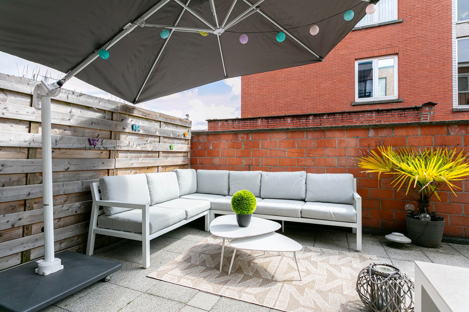 U komt binnen in de centraal gelegen inkomhal met apart toilet met handenwasser. Vanuit de inkomhal betreedt u de lichtrijke leefruimte met airco en aanpalend de volledig geïnstalleerde keuken. De keuken omvat: een dampkap, een kookplaat (Keramisch), een koelkast, een oven en een vaatwasser. Centraal is er nog de badkamer met ligbad, douche, handdoekradiator en een enkel lavabomeubel. Overigens zijn er nog drie slaapkamers. Deze beschikken over een airco en elektrische rolluiken met timer. Tot slot is er nog een zonovergoten, omheinde tuin en een ondergrondse garagebox dewelke verplicht is aan te kopen voor € 25.000.