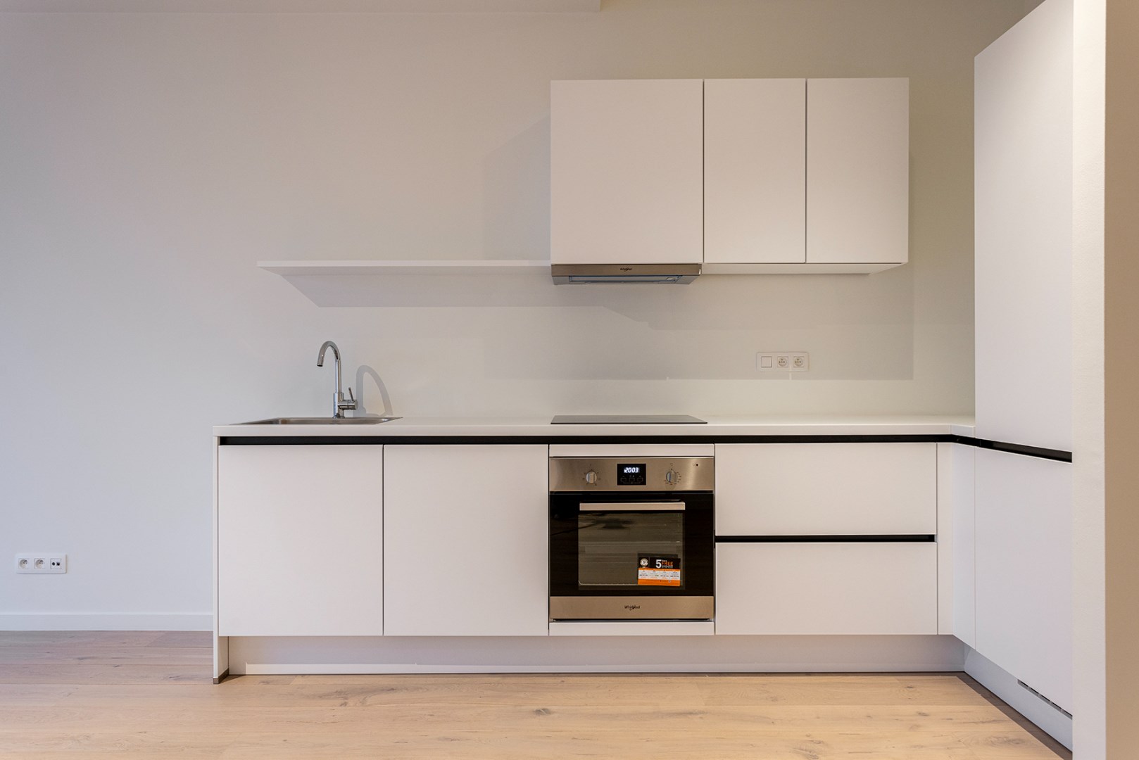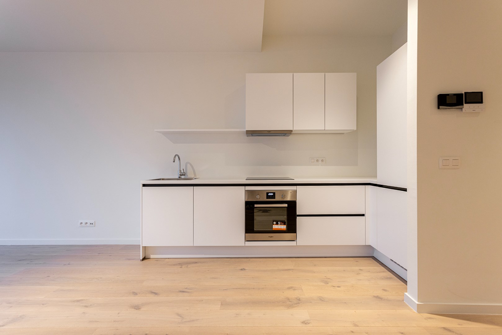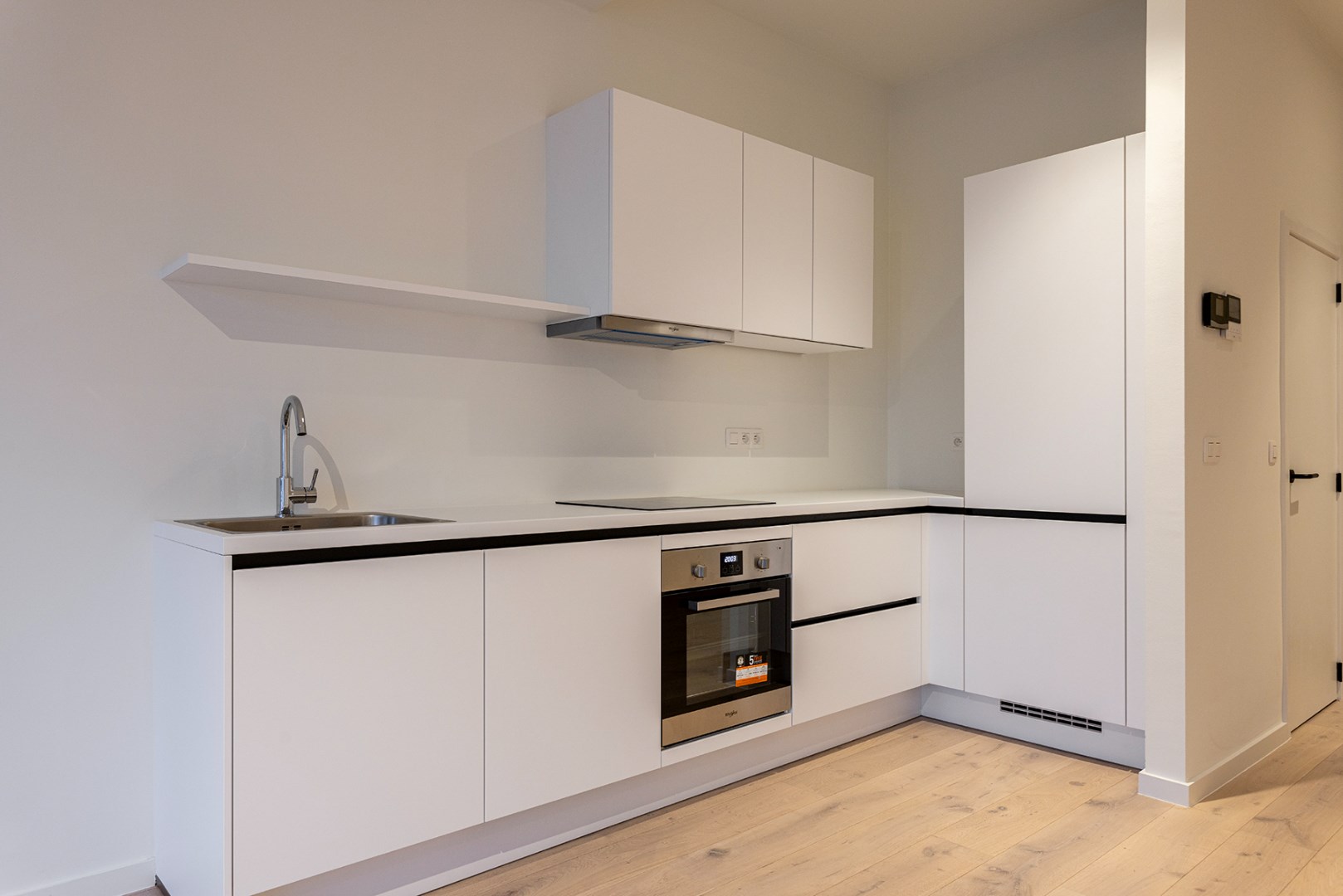 Bij binnenkomst stap je de ruime woonkamer in, die naadloos overgaat in de open keuken, voorzien van alle moderne gemakken. Denk aan een koelkast met vriesvak, inductiekookplaat, vaatwasser en oven – alles wat je nodig hebt om comfortabel te koken en te genieten.