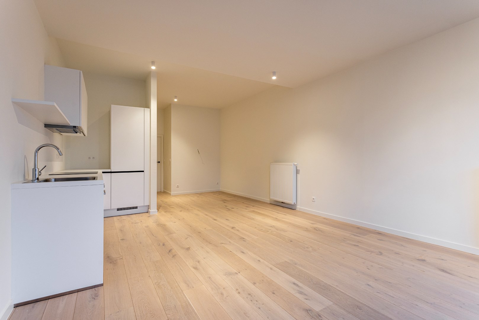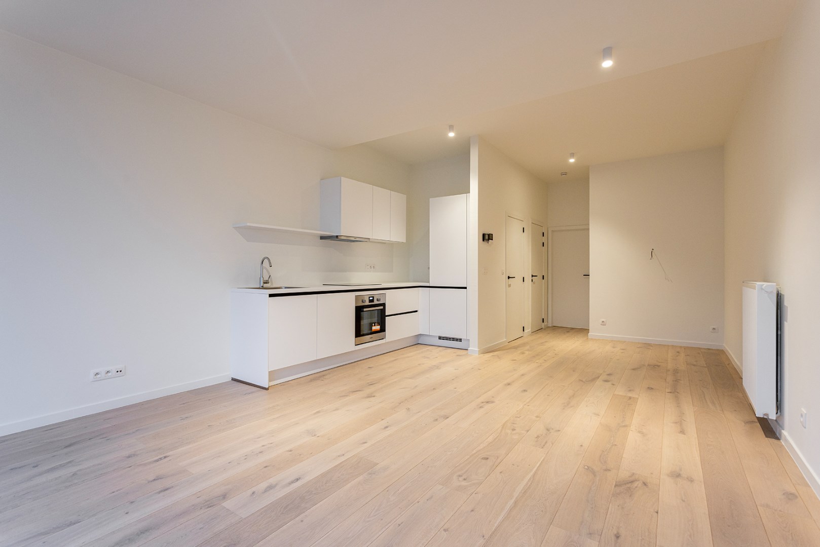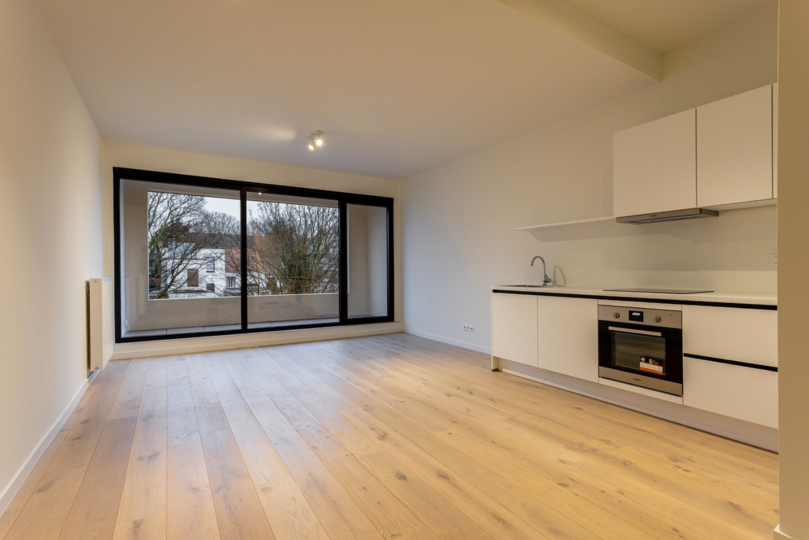 Bij binnenkomst stap je de ruime woonkamer in, die naadloos overgaat in de open keuken, voorzien van alle moderne gemakken. Denk aan een koelkast met vriesvak, inductiekookplaat, vaatwasser en oven – alles wat je nodig hebt om comfortabel te koken en te genieten.