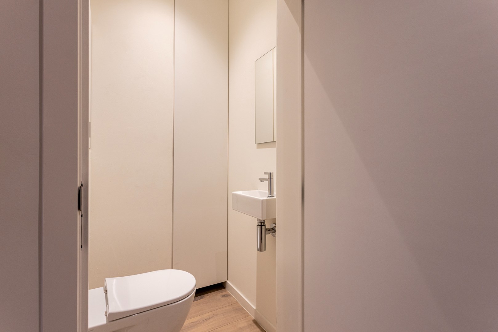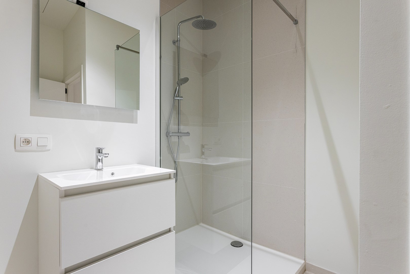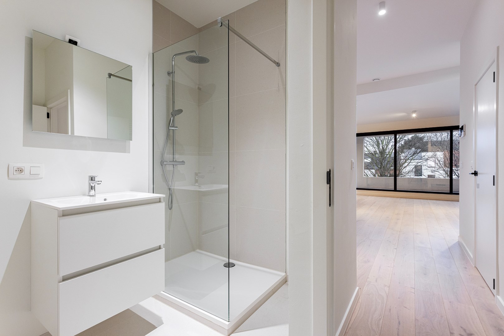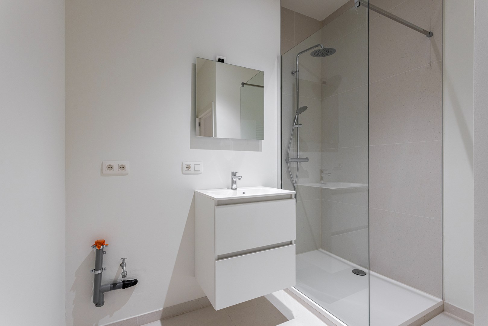 De woonkamer, die ook dienstdoet als slaapkamer, biedt toegang tot een apart toilet en een gezellig, ruim terras. Hier kun je in alle rust buiten genieten van de frisse lucht. Aan de andere kant van het appartement bevindt zich de moderne badkamer met een ruime inloopdouche, een mooi lavabomeubel, een handdoekradiator en aansluitingen voor een wasmachine en droogkast.