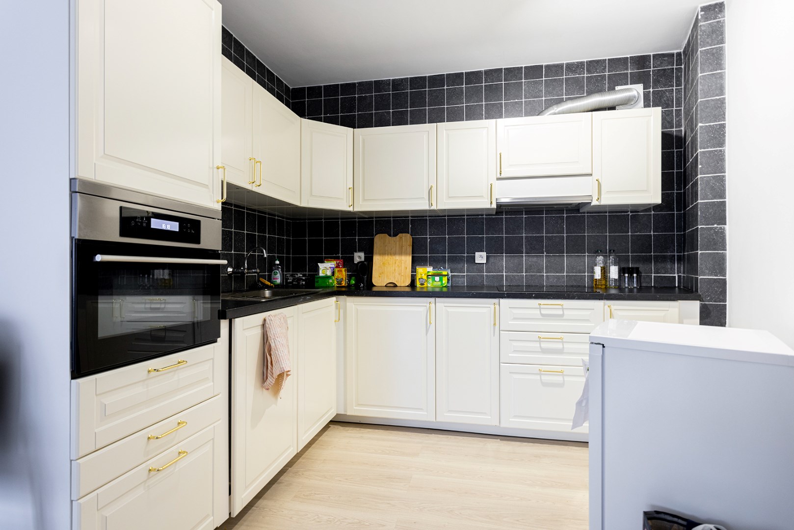 Via de hal kan u vooraan toegang nemen tot de lichtrijke woonkamer met open keuken. De keuken is onder meer voorzien van een oven, vaatwasser, enkele spoelbak, inductiekookplaat en dampkap.