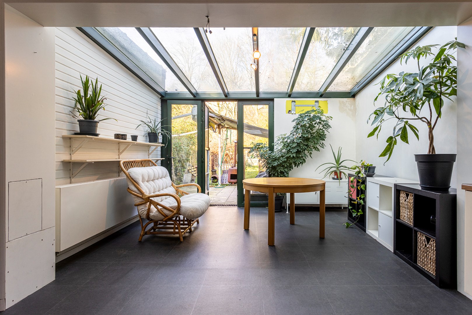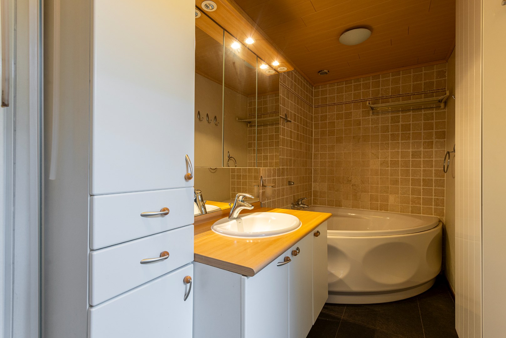 Via de inkomhal (3m²) komen we in de gezellige woonkamer (29m²). Verder is er de lichtrijke open keuken (16m²) met aansluitend de veranda (15m²) die zicht heeft op de tuin. Vanuit de keuken is er toegang naar het toilet, de wasplaats (2m²) en de badkamer (6m²) met wastafel enkel in meubel en hoekbad. De afgebeelde douchecabine is momenteel niet meer in gebruik.