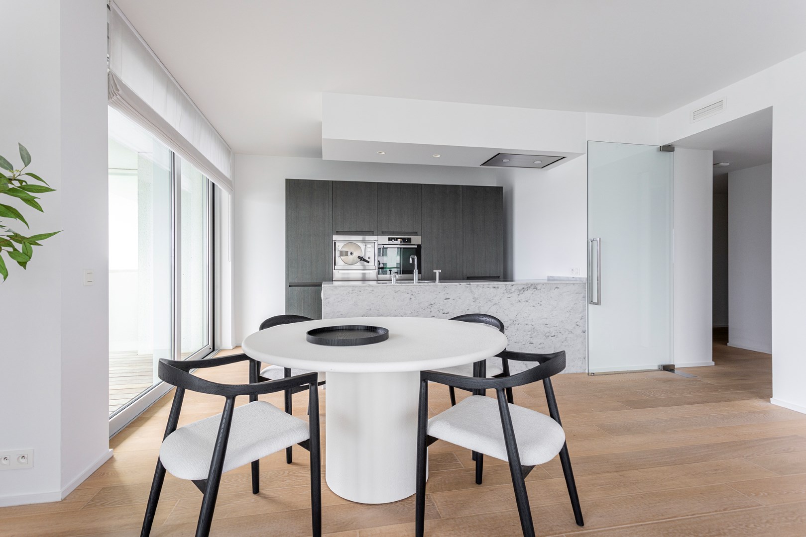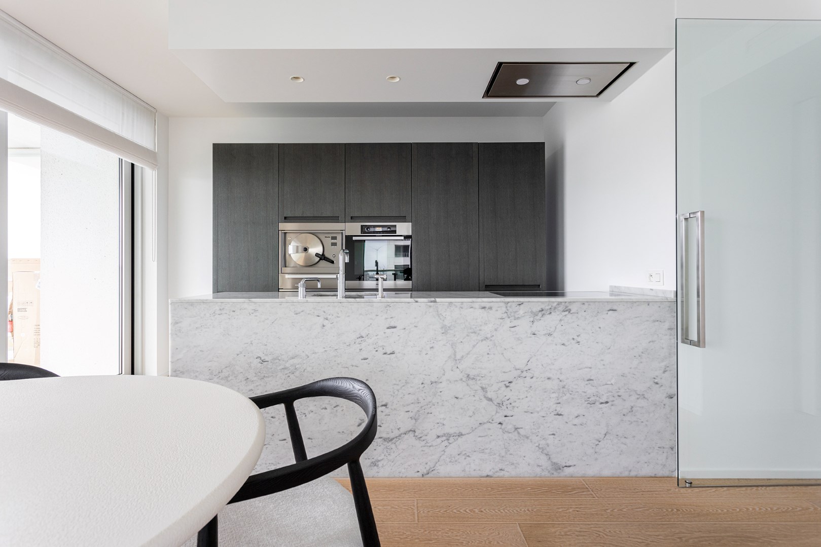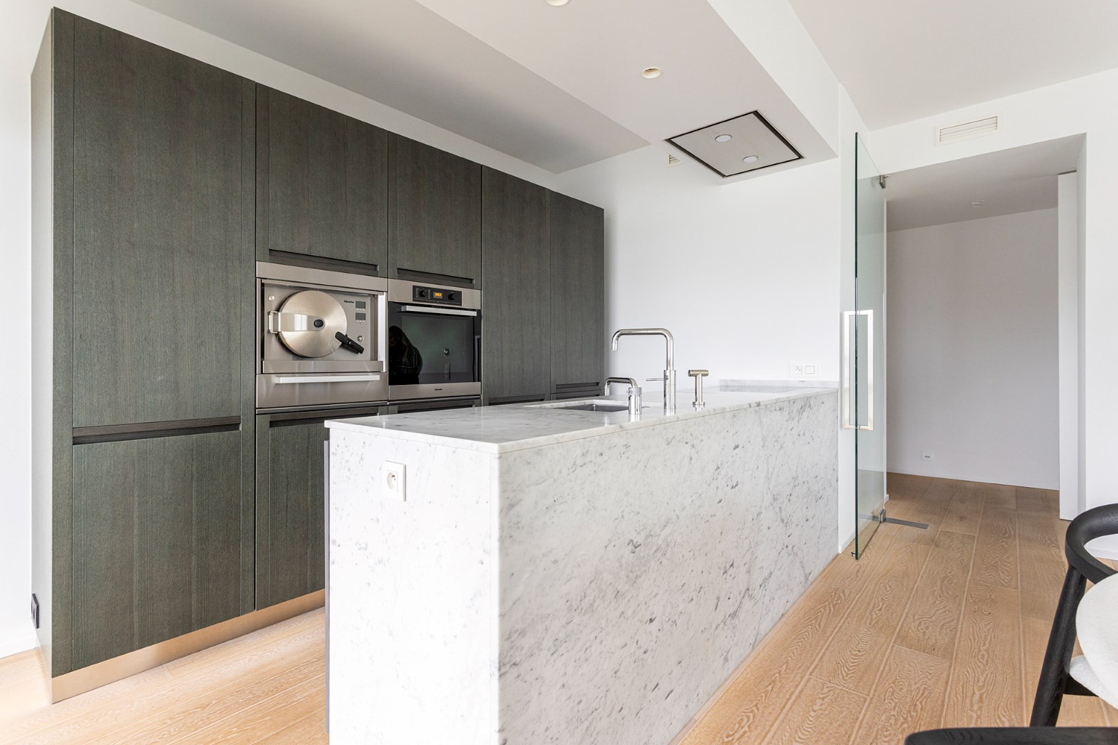 De open ‘BOFFI’ keuken in zwarte moeraseik werd naadloos geïntegreerd in de leefruimte en is uitgerust met kwaliteitsvolle toestellen: heteluchtoven, drukstoomoven, warmhoudlade, inductiekookplaat en vaatwasmachine van Miele, en koelkast en aparte diepvriezer van Liebherr. Het keukeneiland in carrara marmer bevat naast de kookplaat een grote spoelbak, uitgerust met een vaste mengkraan, een kraan met flexibele slang, en een Quooker.
