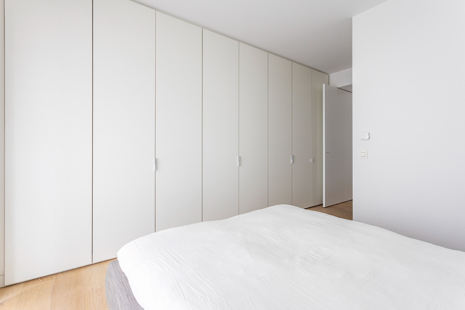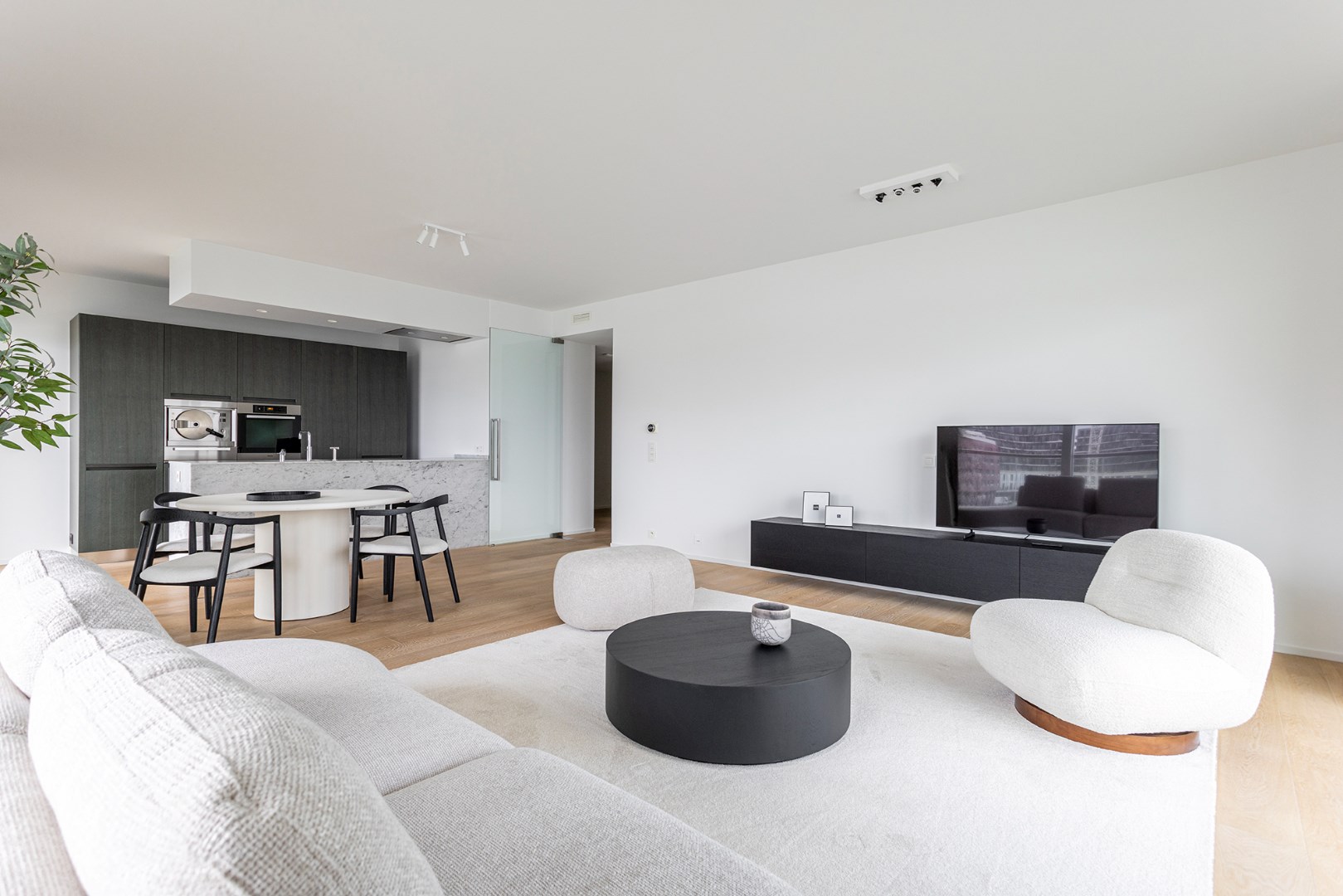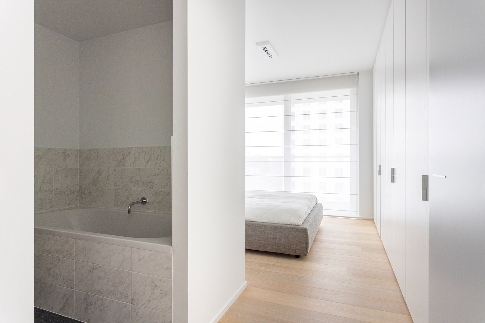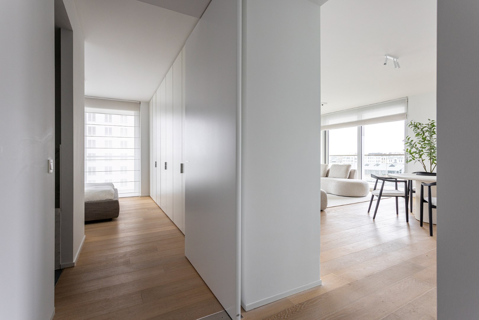 Dit ruime éénslaapkamerappartement met een bewoonbare oppervlakte van 94 m2 heeft een zeer hoogwaardige afwerking: doorheen het appartement, met uitzondering van de natte ruimtes waar geopteerd werd voor een stijlvolle tegelvloer, ligt een mooie eiken parketvloer. Binnendeuren tot plafondhoogte, verzonken scharnieren en designdeurklinken versterken de indruk van ruimte en openheid.