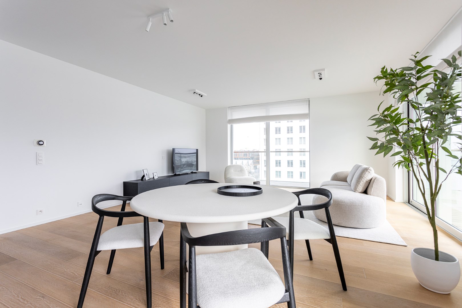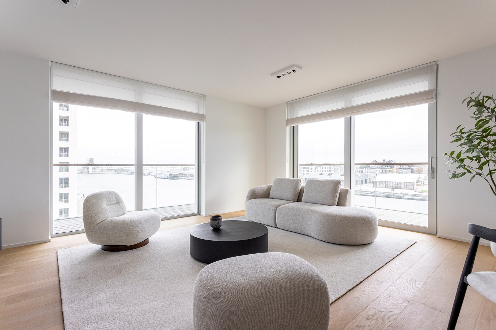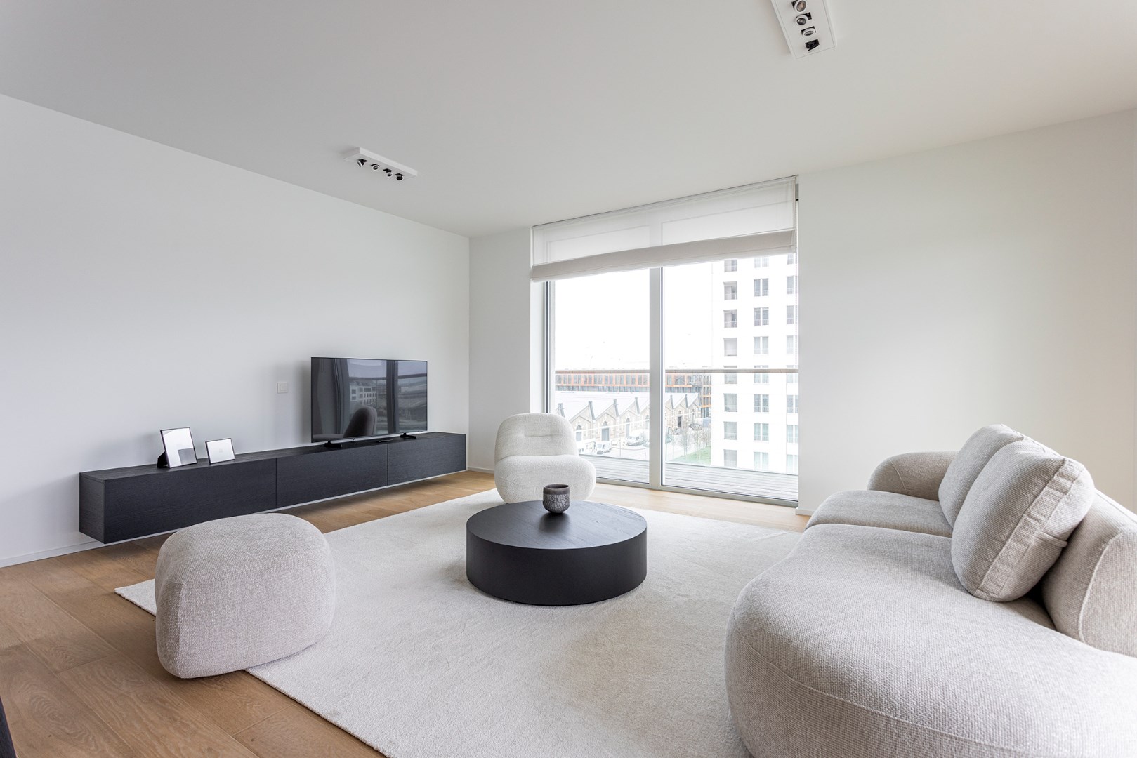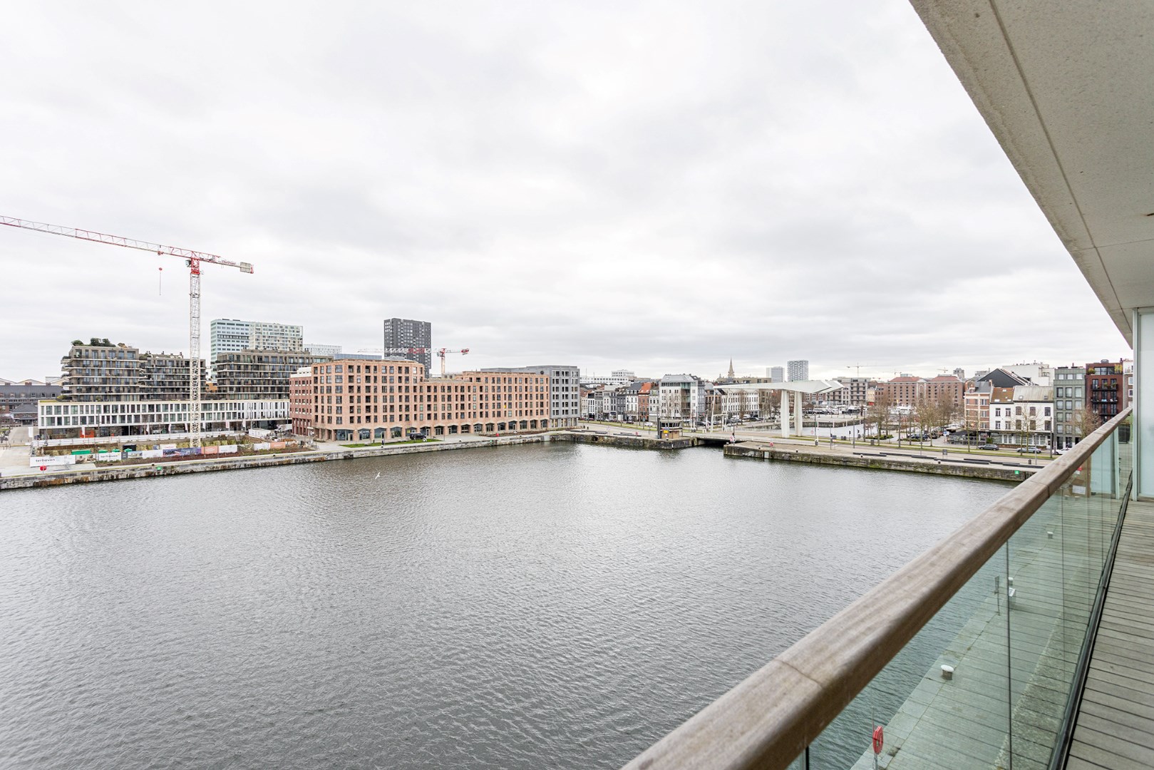 Geen gebrek aan licht en zicht in dit zalig appartement op het Eilandje, op de vierde verdieping in de derde toren aan het Kattendijkdok-Westkaai. De grote ramen, van plafond tot vloer, samen met het overdekte buitenterras van 34 m2, geven een heerlijk gevoel van ‘wonen op het water’, vlakbij de vernieuwde tramlijn, winkels, restaurants en groene zones.