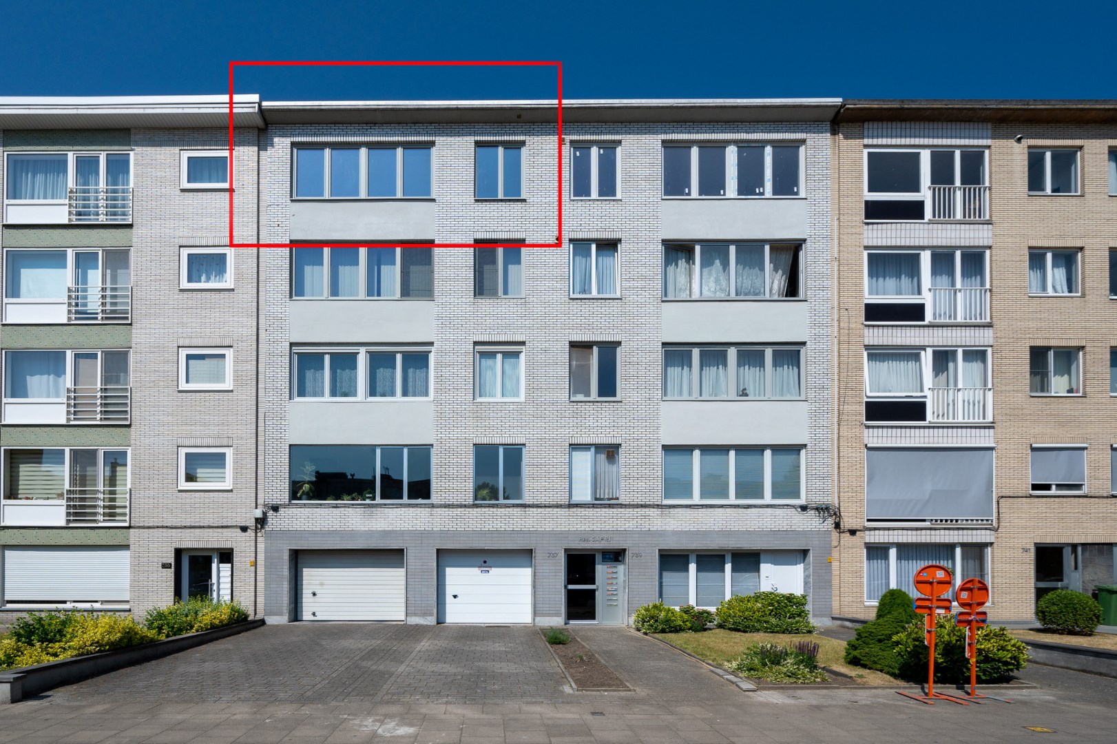 Het appartement is uitgerust met een privatieve kelderberging nr. 8 en de garagebox nr. 6. Deze laatste is optioneel aan te kopen voor € 22.000.