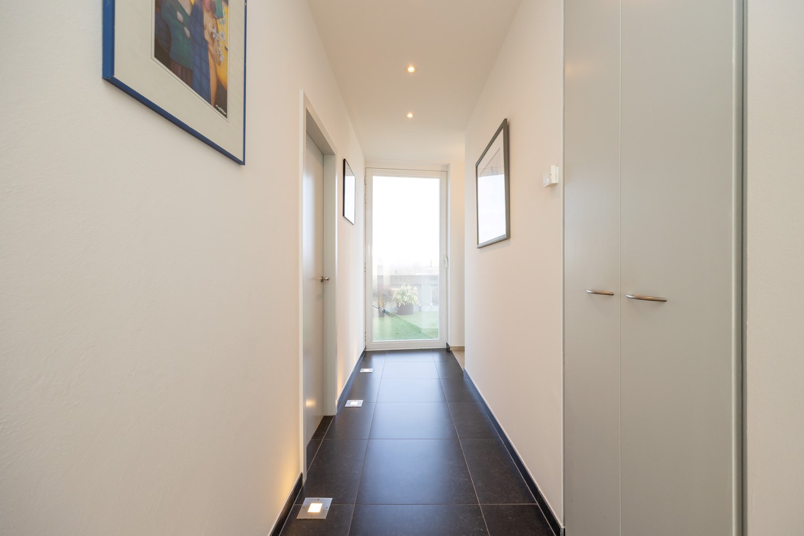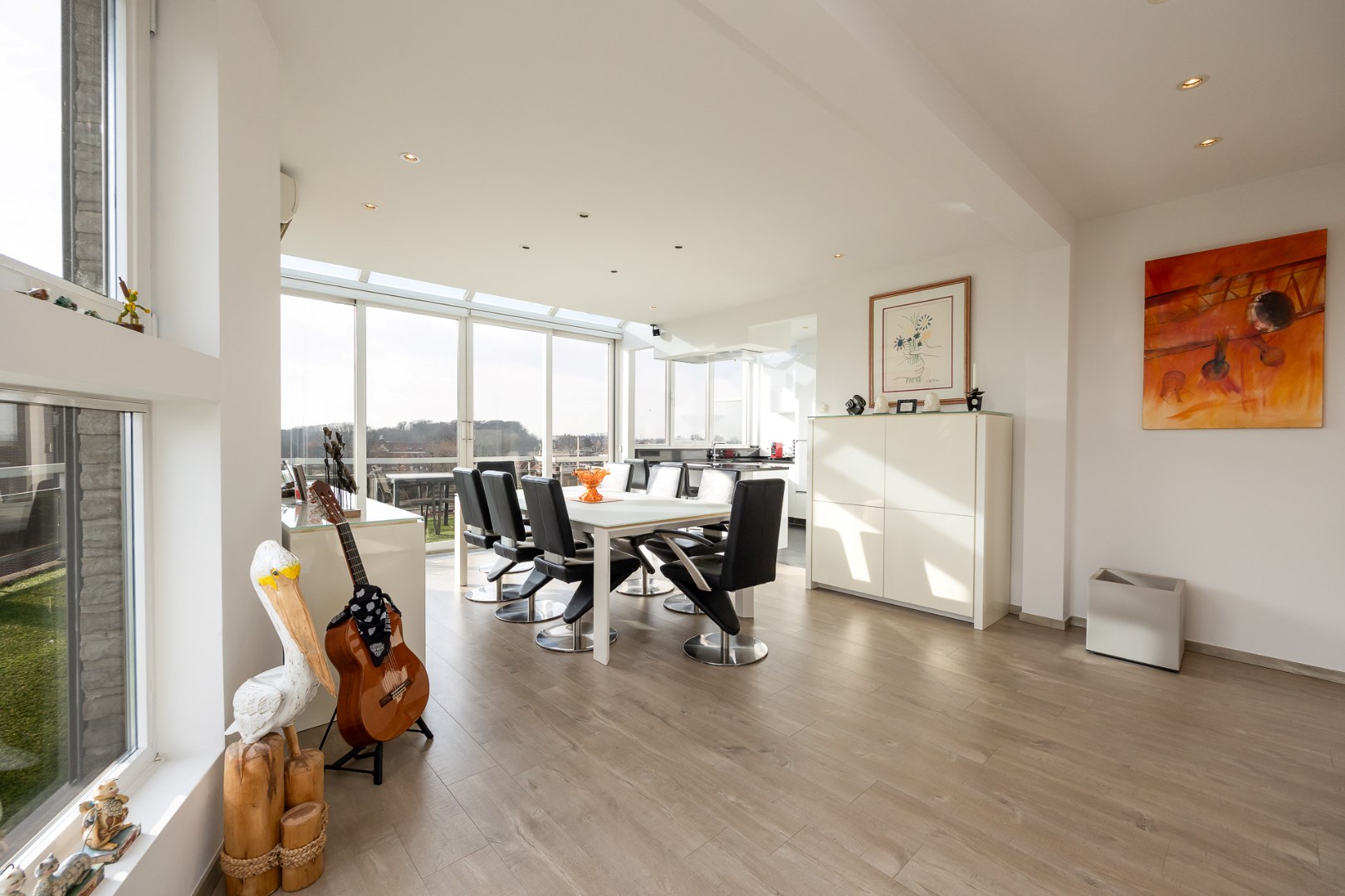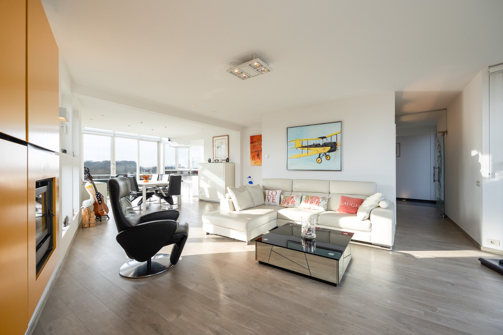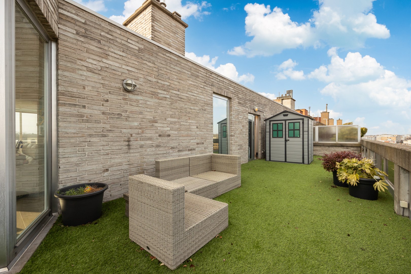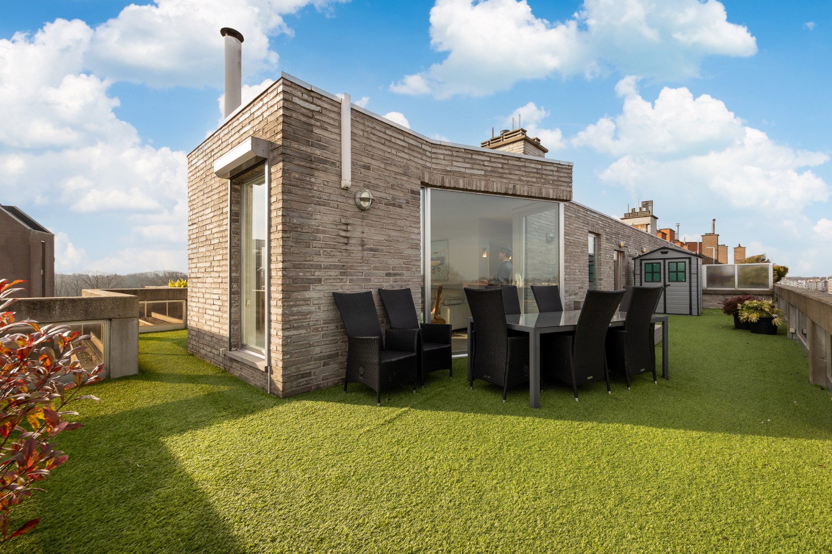 Bij binnenkomst leidt de inkomhal u naar de ruime, modern ingerichte leefruimte met een open keuken en veel natuurlijke lichtinval. Verder vindt u een handige wasplaats, gastentoilet en een hal met ingebouwde kasten. De penthouse beschikt over drie volwaardige slaapkamers, waarvan de masterbedroom een ensuite dressing en rechtstreekse toegang tot de badkamer heeft. Alle slaapkamers bieden bovendien directe toegang tot het terras, dat is aangelegd met onderhoudsvriendelijk kunstgras. Dankzij de hoekligging geniet u van een panoramisch uitzicht in drie windrichtingen.