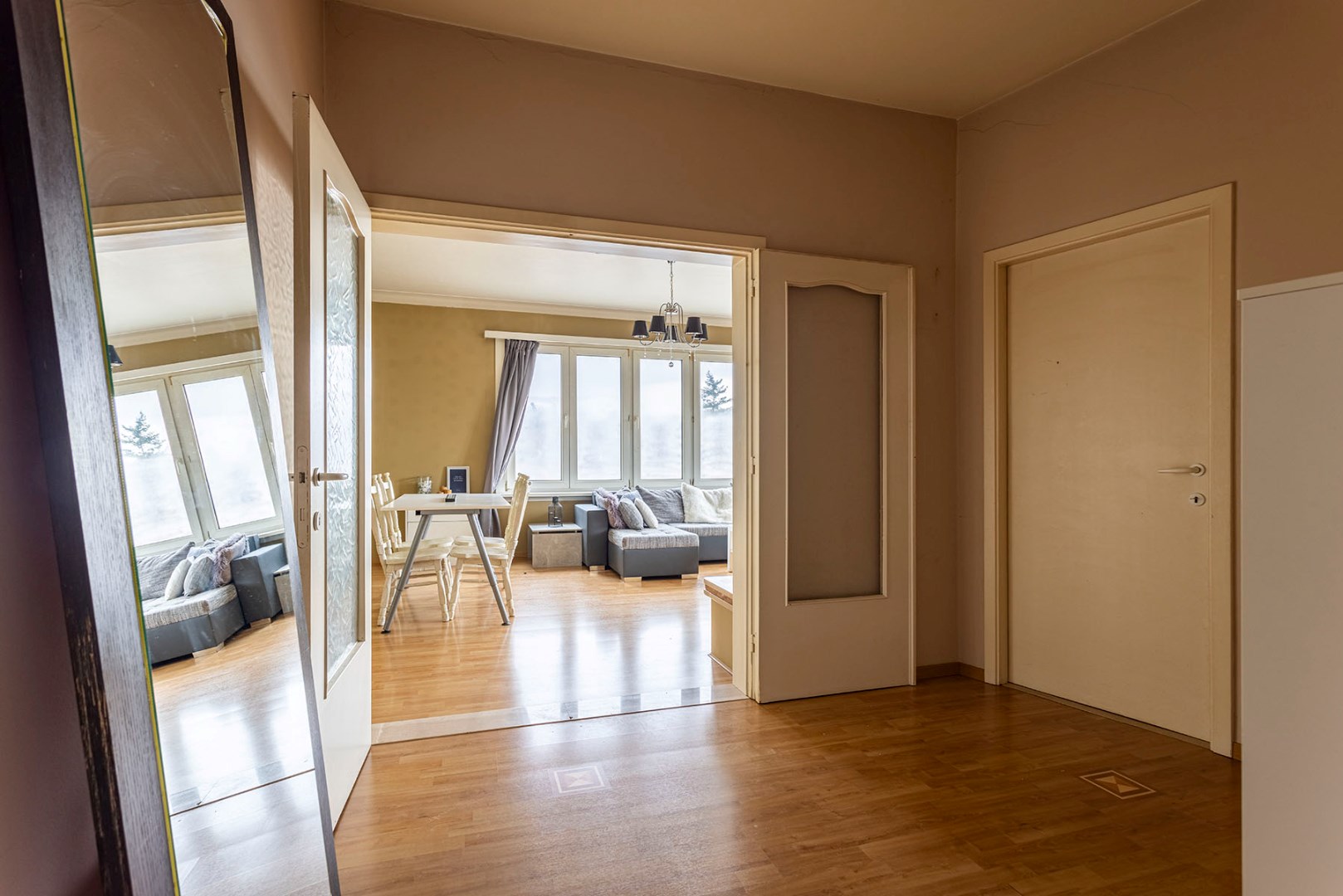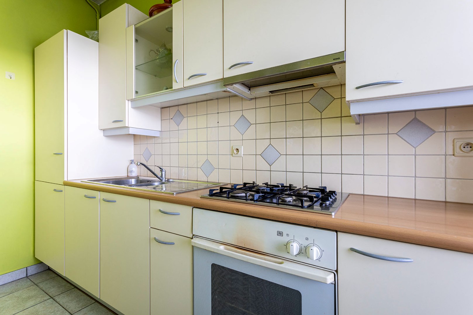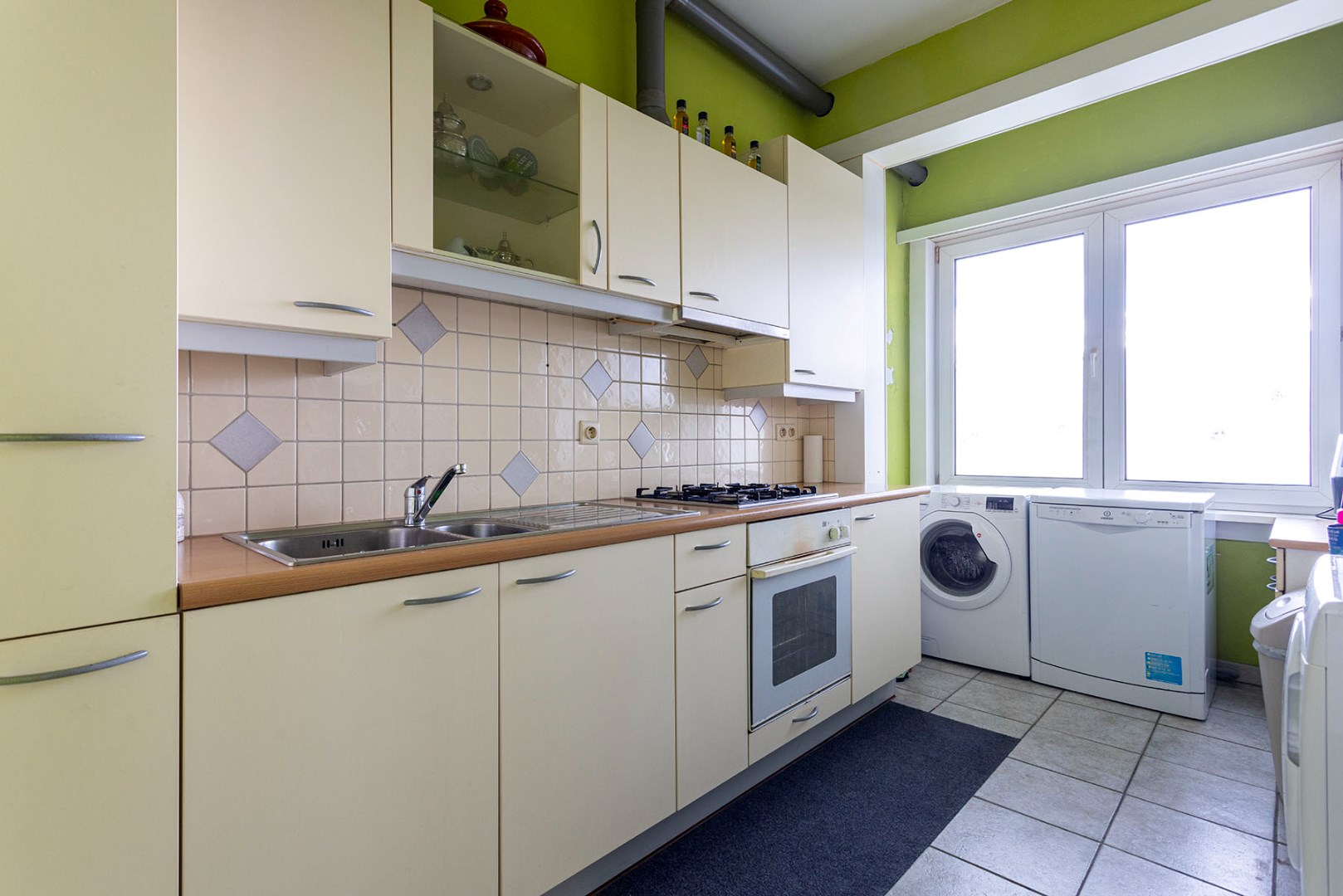 U komt binnen via de centrale hal die doorgang geeft aan de meeste ruimtes. Via de hal heb je toegang tot de 2 slaapkamers en badkamer. Via deze hal kom je ook in de leefruimte terecht, aangezien het een hoekappartement is, heeft u veel lichtinval. Via het leefgedeelte waar plaats is voor een salon en eetkamer heb je toegang tot de keuken die is voorzien van een gasvuur, oven, dampkap, dubbele spoelbak, ingebouwde koelkast en diepvries. Tevens is in de keuken ook een aansluiting voorzien voor een wasmachine en droogkast. Vanuit de hal heb je tevens toegang tot de 2 slaapkamers (12.9m² en 10m²). De badkamer is voorzien van een enkele lavabeau in meubel, douche en toilet. Verder beschikt het appartement over 2 kelders, ideaal voor het opbergen van spullen, zoals kerstversiering, valiezen,... Kortom, dit appartement in Merksem is ideaal voor starters of als opbrengst.