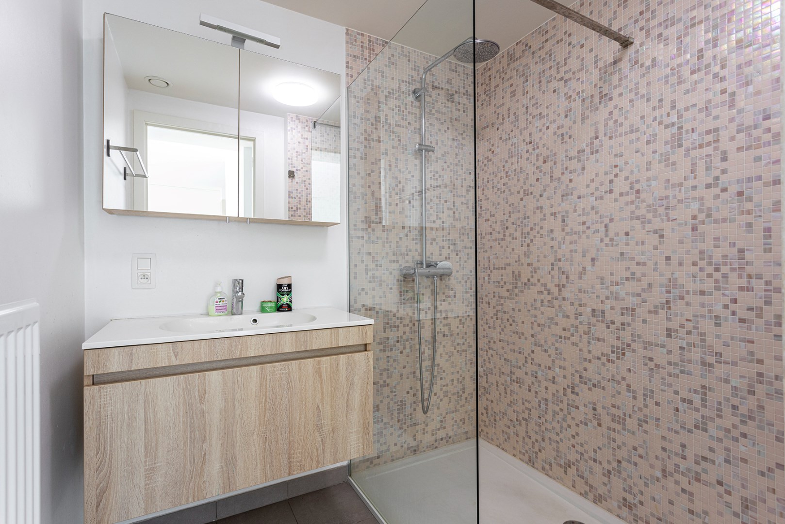 U betreedt dit prachtige appartement via de inkomhal, die toegang geeft tot het aparte toilet en de badkamer met inloopdouche en enkele lavabo.