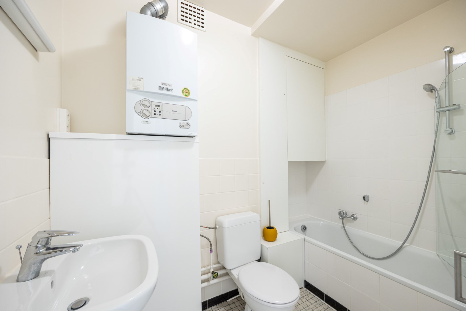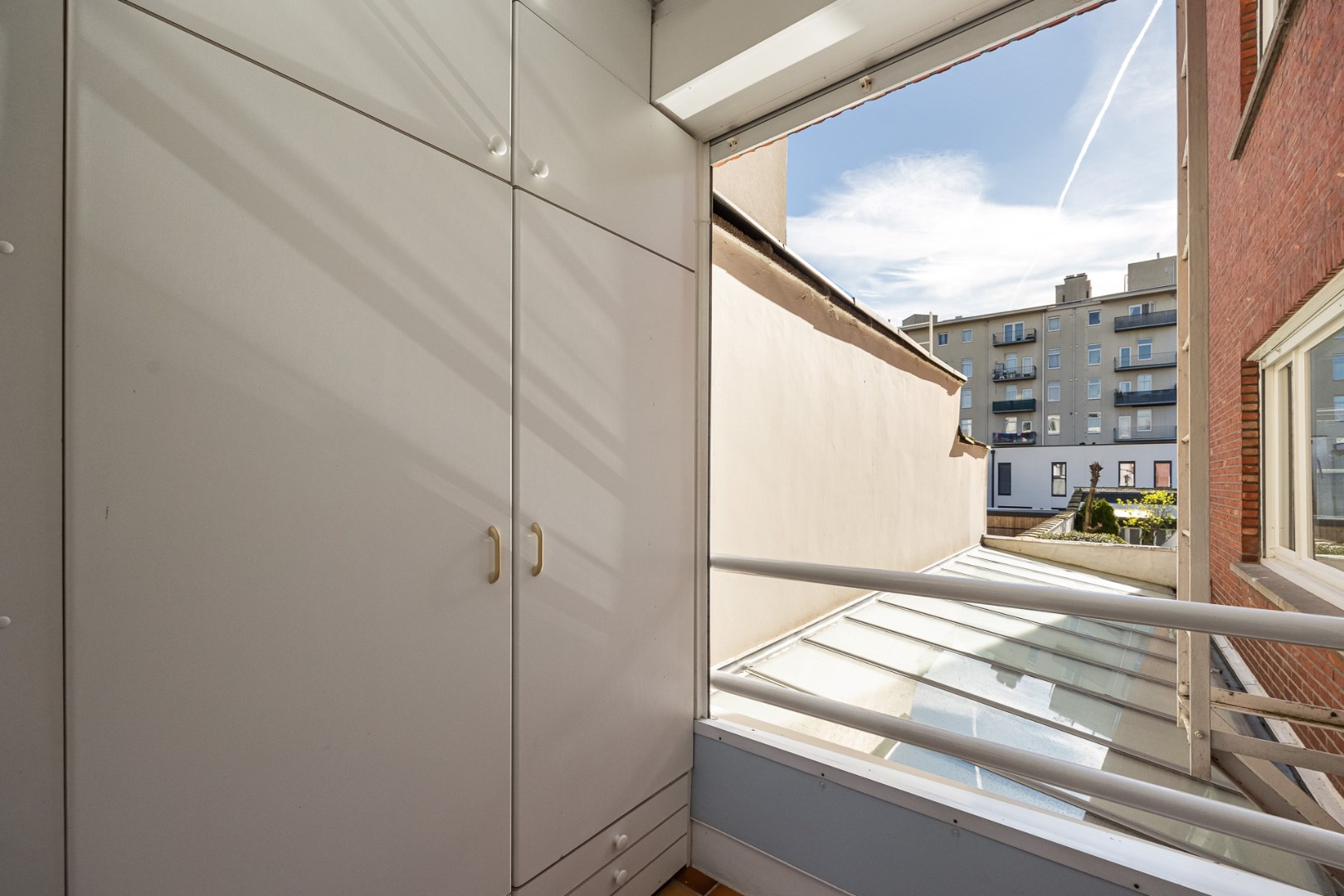 U betreedt het appartement via de afgescheiden inkomhal met vestiairekast, waarin ook de wasmachine verwerkt zit.