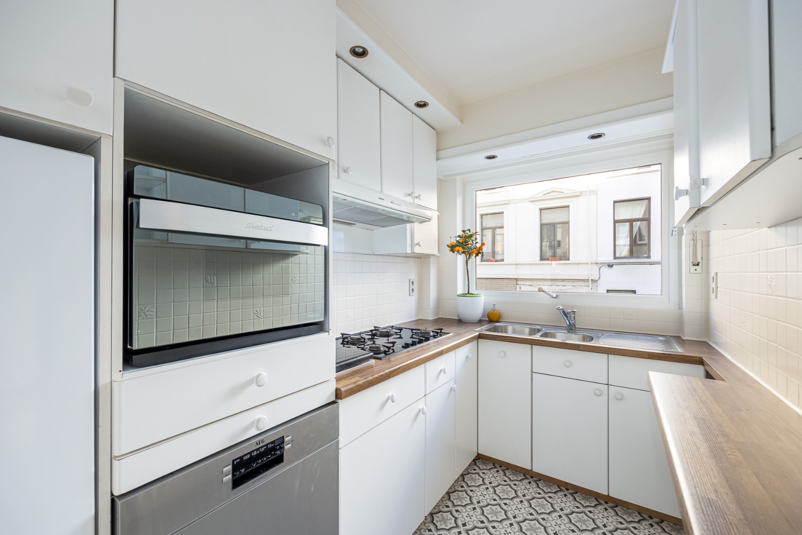 Vervolgens bereikt u de lichtrijke en ruime woonkamer, die achteraan beschikt over een gezellig terras en vooraan verbonden is met de afgescheiden keuken. Deze laatste beschikt onder andere over een gaskookplaat, dampkap, vaatwasser en koelkast-diepvries combinatie.