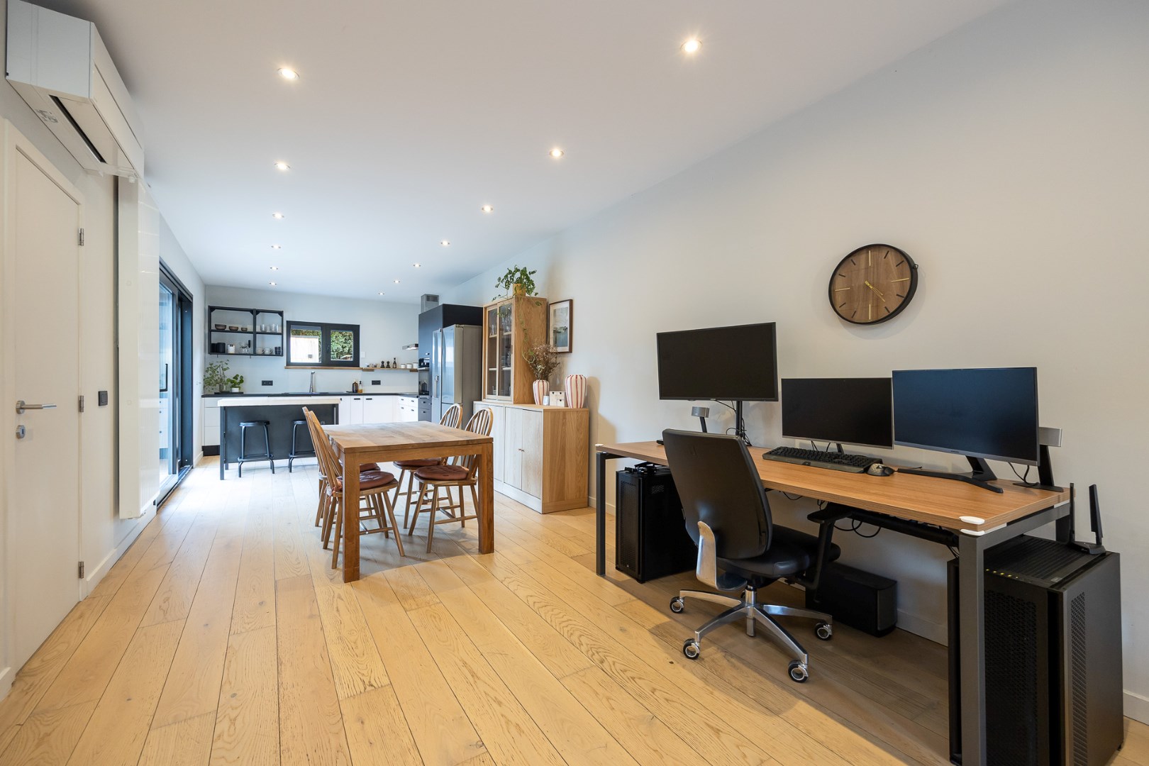 GLV: de inkomhal geeft toegang tot de lichtrijke woonkamer met aansluitend de ingerichte open keuken. Van hieruit heeft u toegang naar het terras en de tuin met achteraan een grote opslagruimte. Verder is er beneden nog een apart toilet en de bergruimte met aansluiting voor wasmachine.