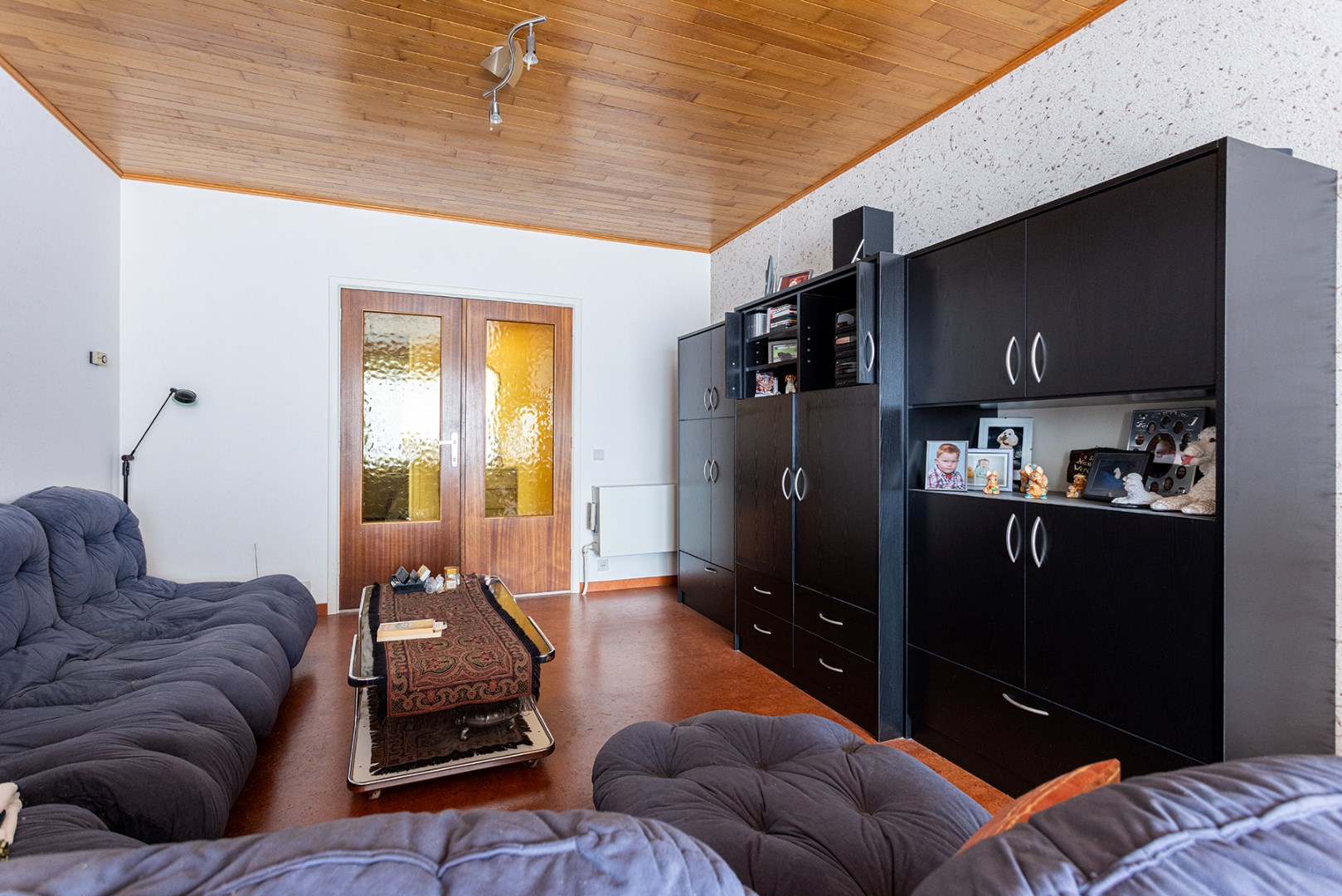 Via de centrale inkomhal betreedt u de meeste ruimtes. Vooraan is er de woonkamer (30m²) met aansluitende de gesloten keuken (8m²) die voorzien is van een dubbele spoelbak, keramisch vuur en dampkap. Achteraan zijn er twee slaapkamers (14,5m² en 9m²), waarvan de kleinste slaapkamer doorgang geeft aan de tuin. Verder is er een technische ruimte, een apart toilet en de badkamer. De badkamer is gerenoveerd met een inloopdouche, enkele lavabo, handdoekradiator en een aansluiting voor een wasmachine. Via de tuin kan u de eerste garagebox bereiken die voorzien is van een manuele poort en waar er elektriciteit aanwezig is.