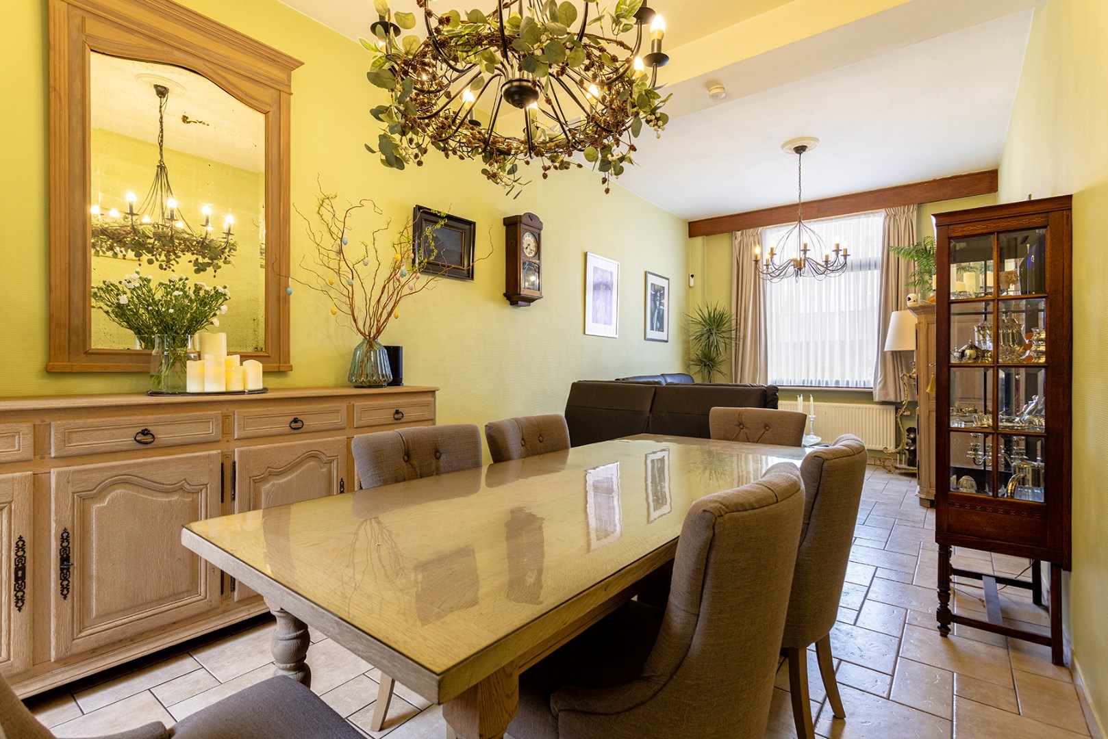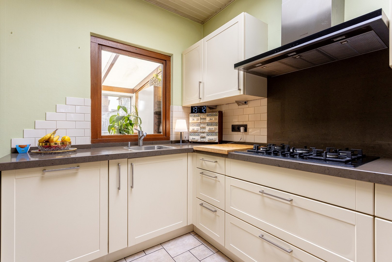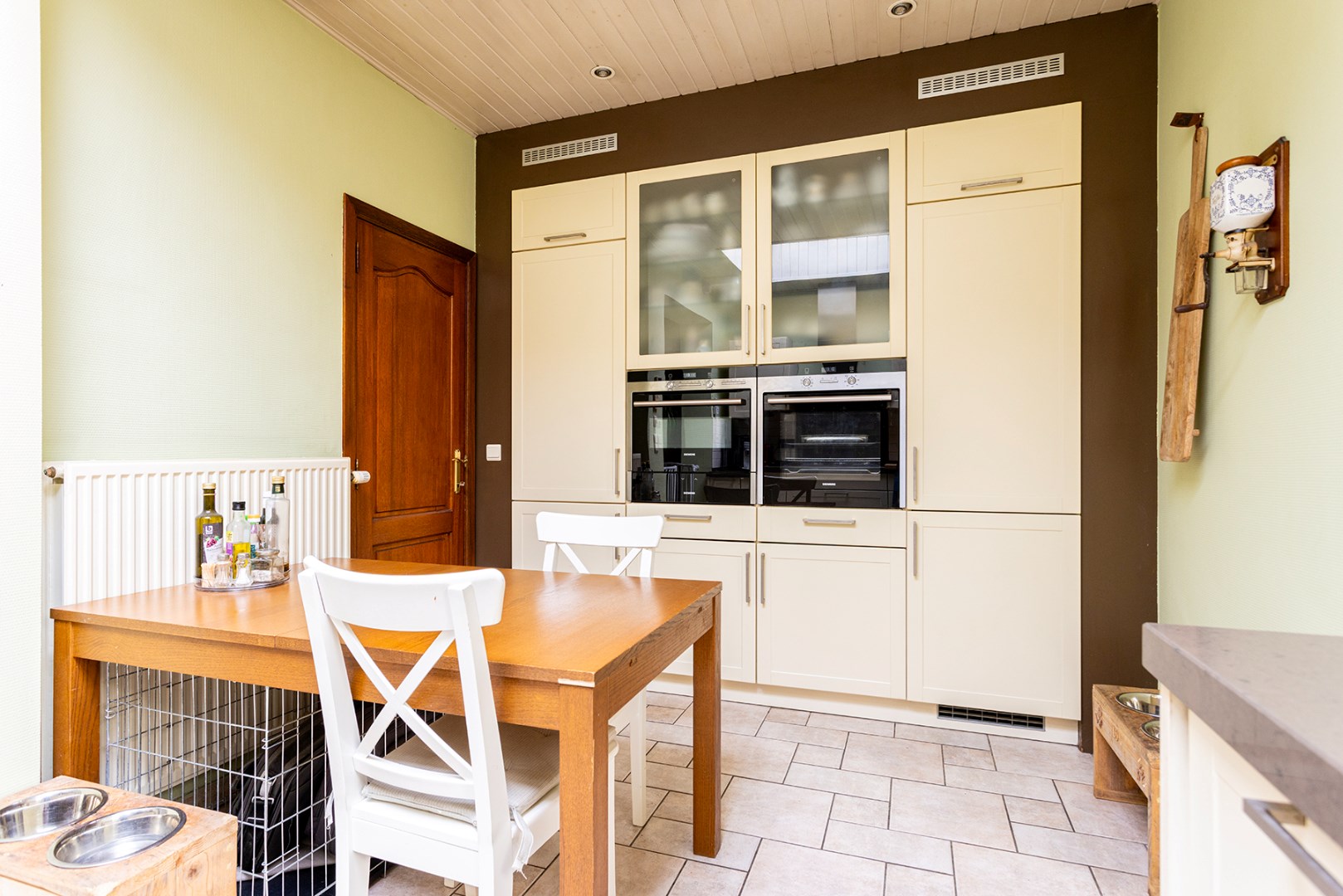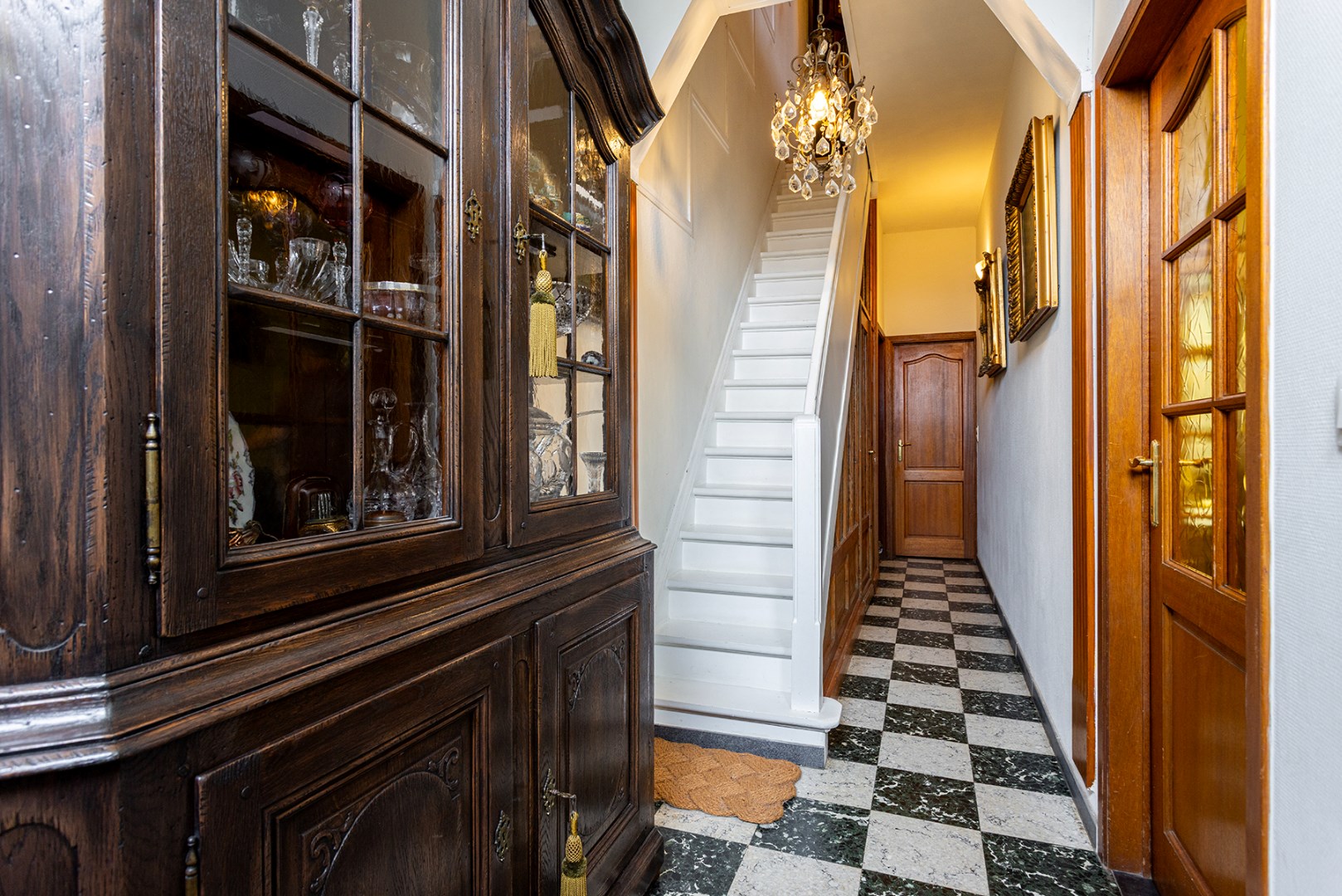 U komt binnen via de authentieke inkomhal die doorgang geeft aan de woonkamer (24m²) vooraan en de keuken (11,5m²) achteraan. De woonkamer straalt gezelligheid uit en is voorzien van een airconditioning. Aanpalend is er de ruime gerenoveerde keuken die voorzien is van toestellen van Siemens (koelkast, diepvriezer, warmhoudlade, oven, combioven, spoelbak, vaatwasser, dampkap en 5 pits gaskookplaat). Verder is er de badkamer (6m²) met dubbele lavabo, toilet en douche. Via de veranda (waar er een aansluiting is voorzien voor een wasmachine) kan u de onderhoudsvriendelijke zuid gerichte stadstuin (25,5m²) met tuinhuis en vijver bereiken.