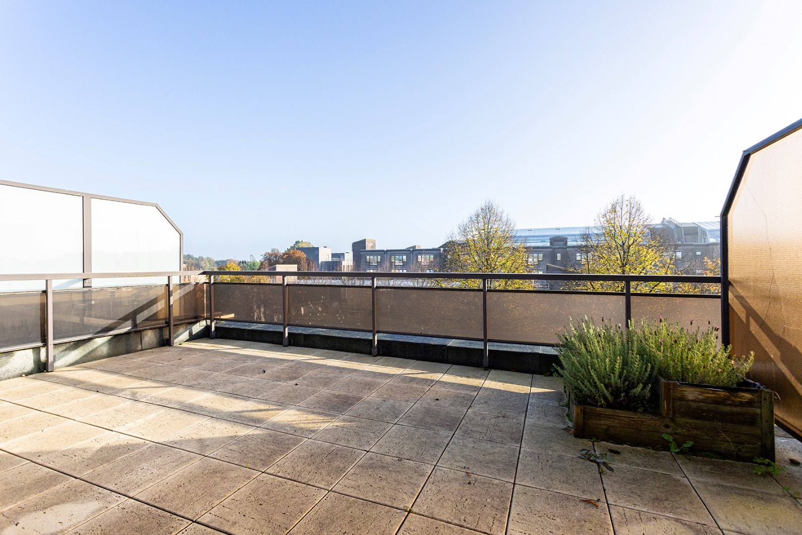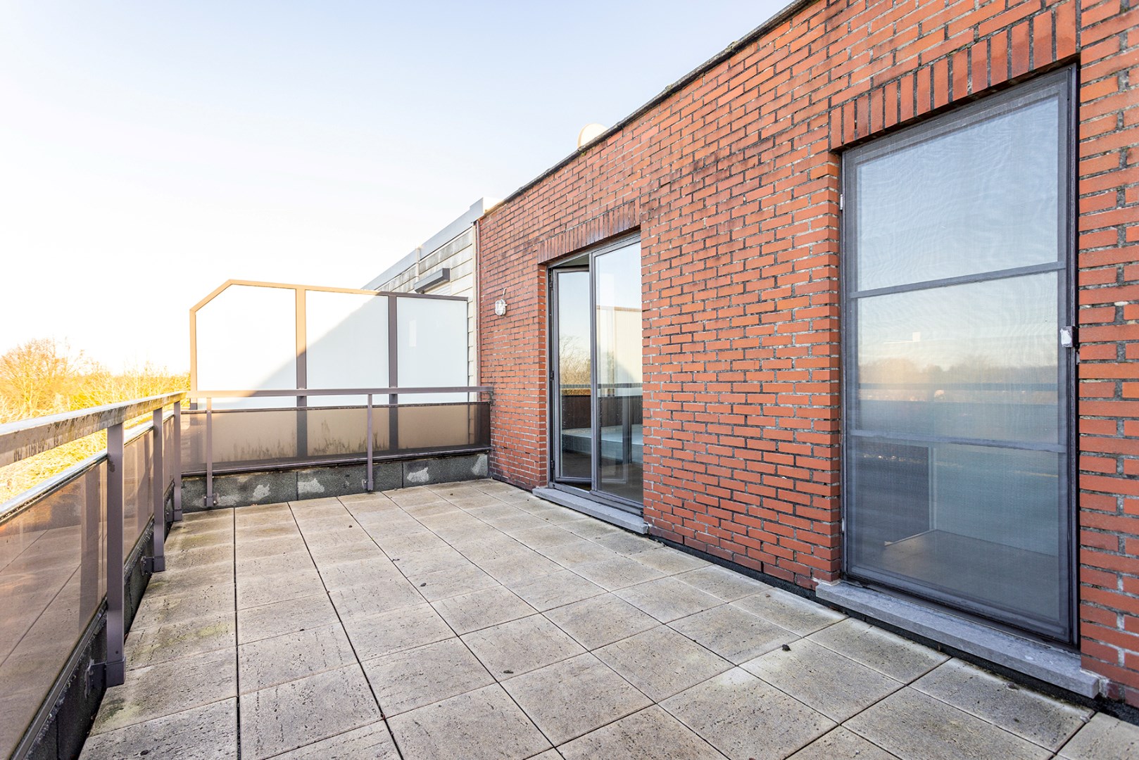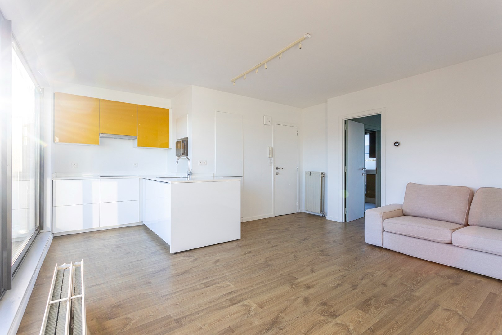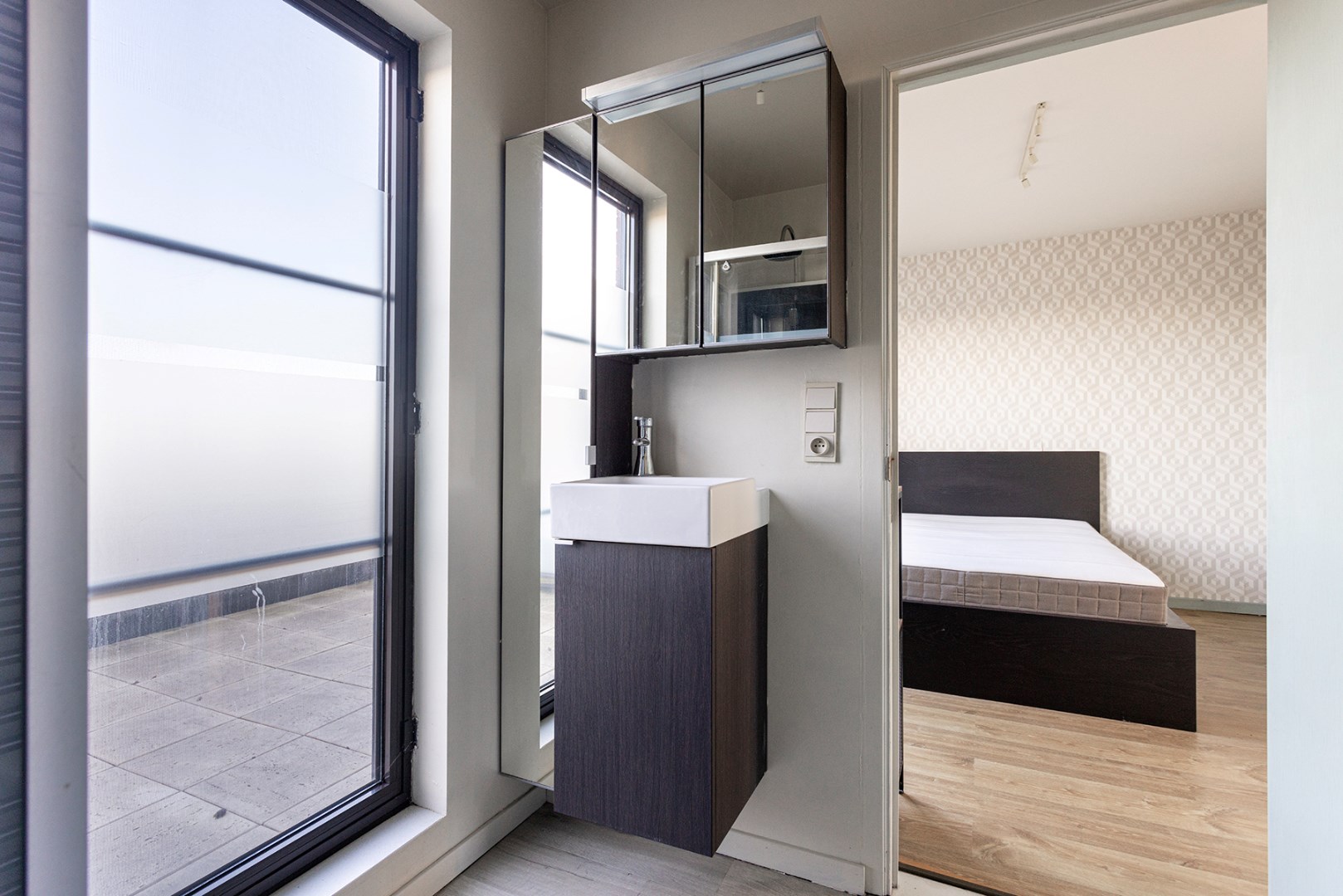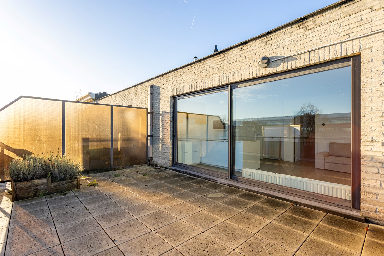 U komt binnen in de lichtrijke leefruimte met de open, volledig geïnstalleerde keuken. Deze omvat: een koelkast, diepvries, dampkap, kookplaat, combi-oven, enkele spoelbak en een vaatwasser. Via de schuifraam heeft u toegang tot het zonovergoten dakterras.