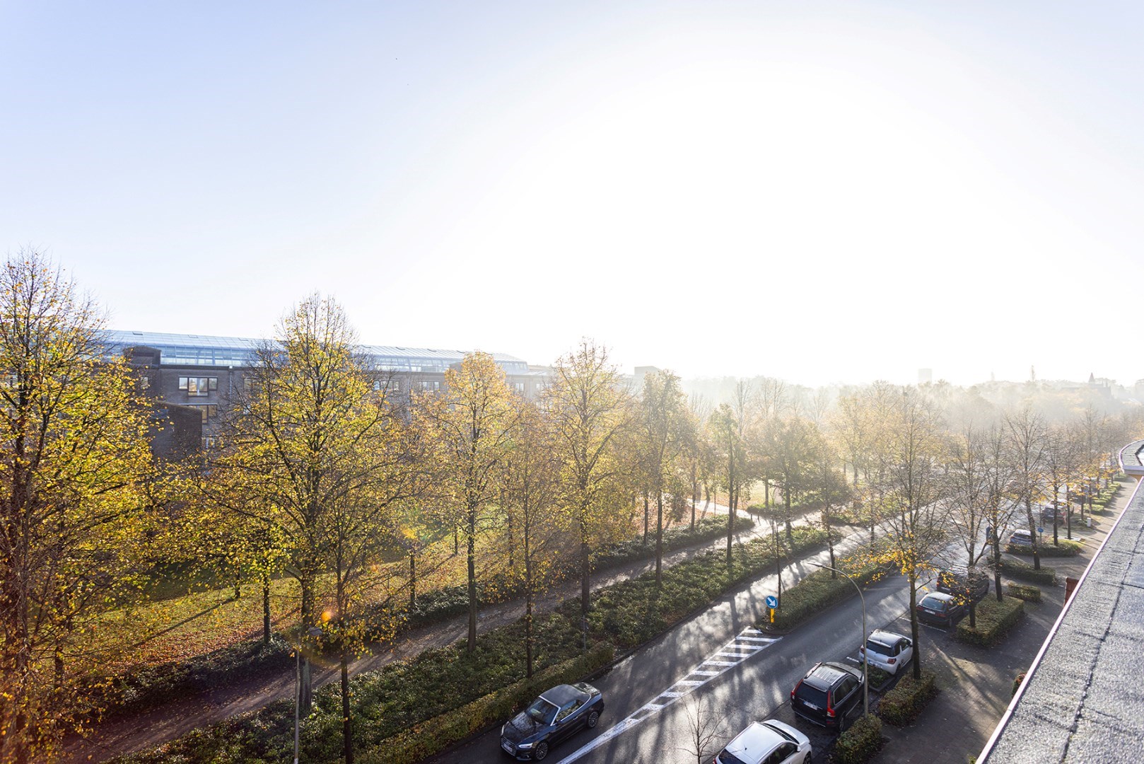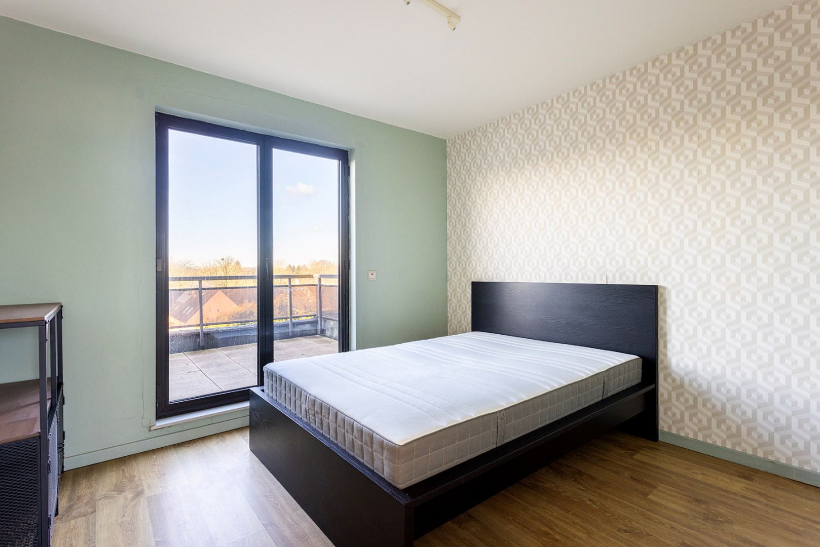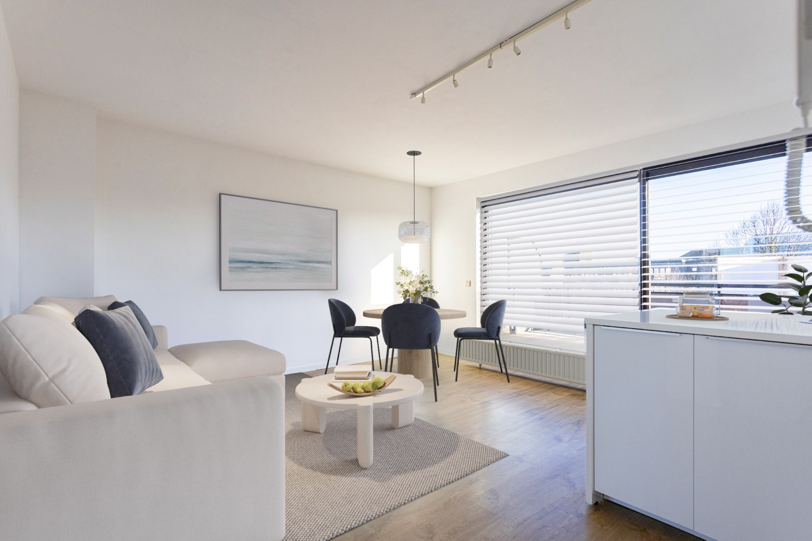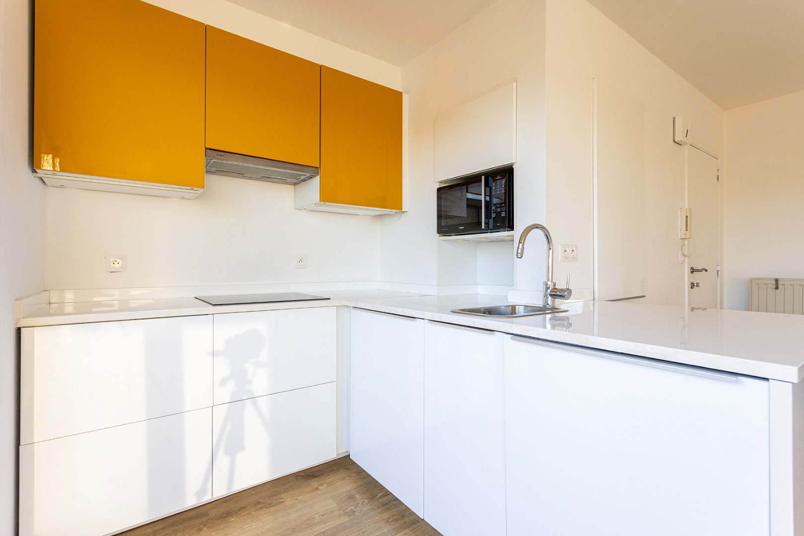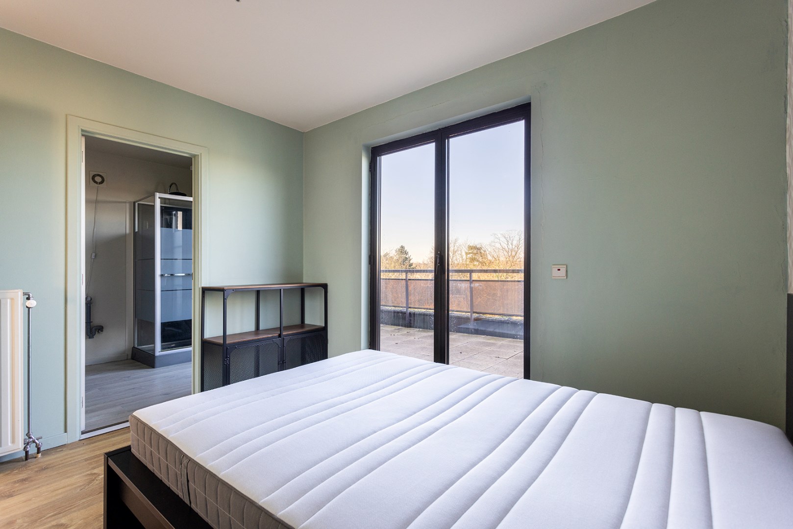 U komt binnen in de lichtrijke leefruimte met de open, volledig geïnstalleerde keuken. Deze omvat: een koelkast, diepvries, dampkap, kookplaat, combi-oven, enkele spoelbak en een vaatwasser. Via de schuifraam heeft u toegang tot het zonovergoten dakterras.