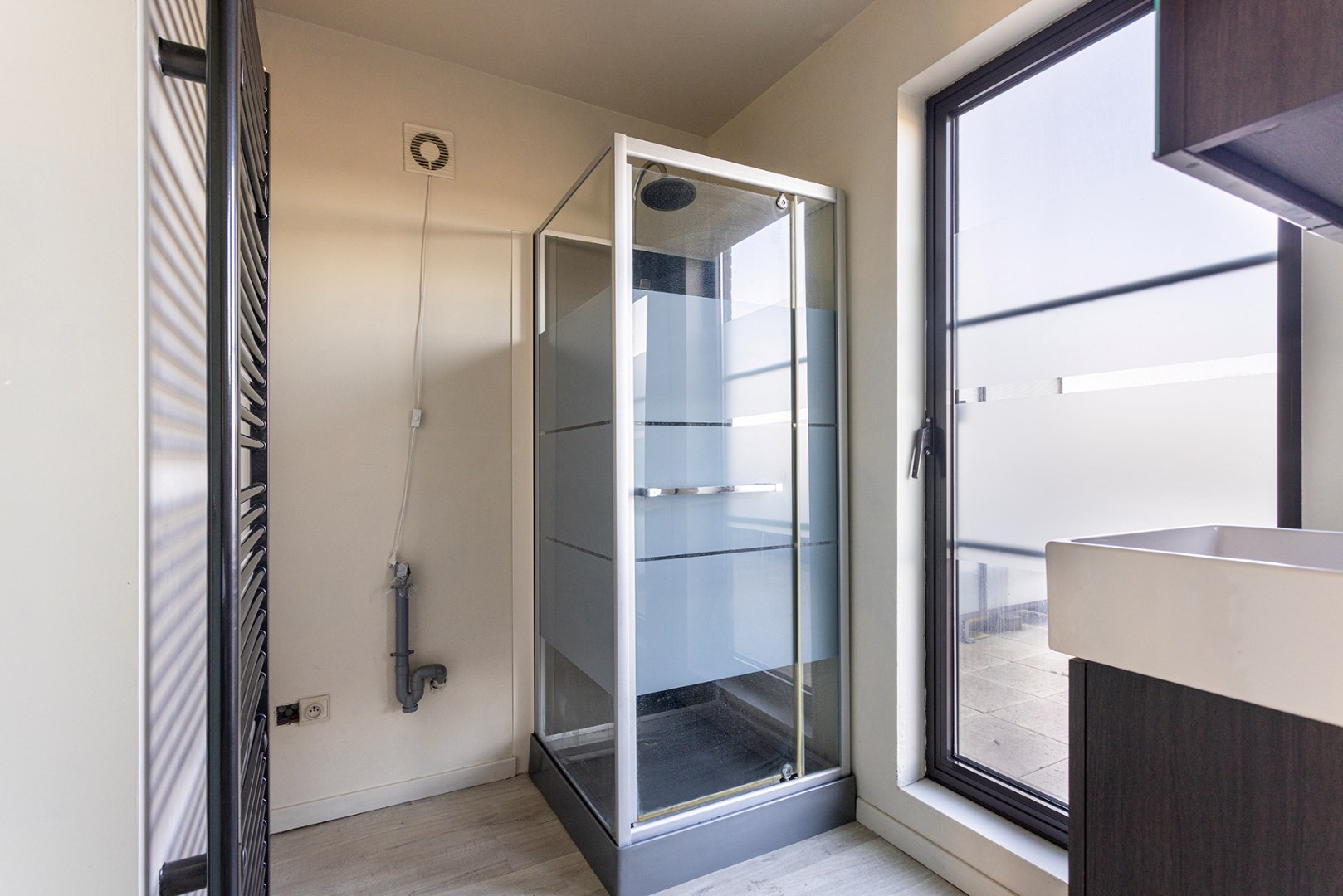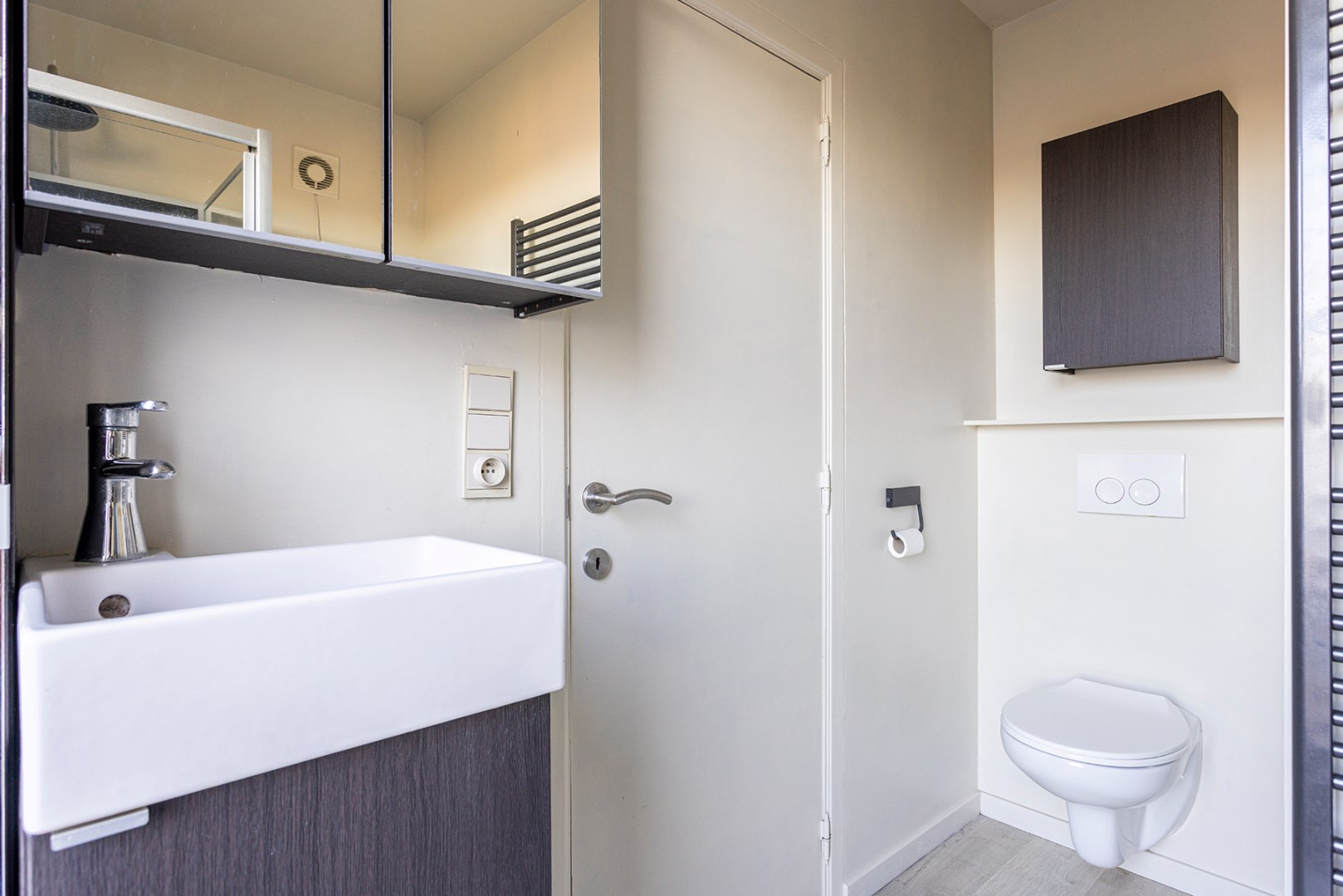Verder is er nog de slaapkamer met aansluitend de badkamer. Deze is voorzien van een douche, toilet en enkel lavabomeubel. Tevens bevinden zich hier ook de aansluitingen voor wasmachine en droogkast. Via de slaapkamer heeft u toegang tot het tweede terras achteraan.