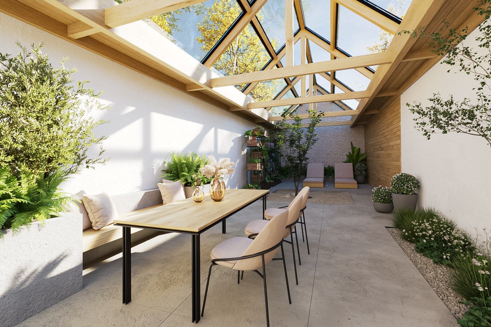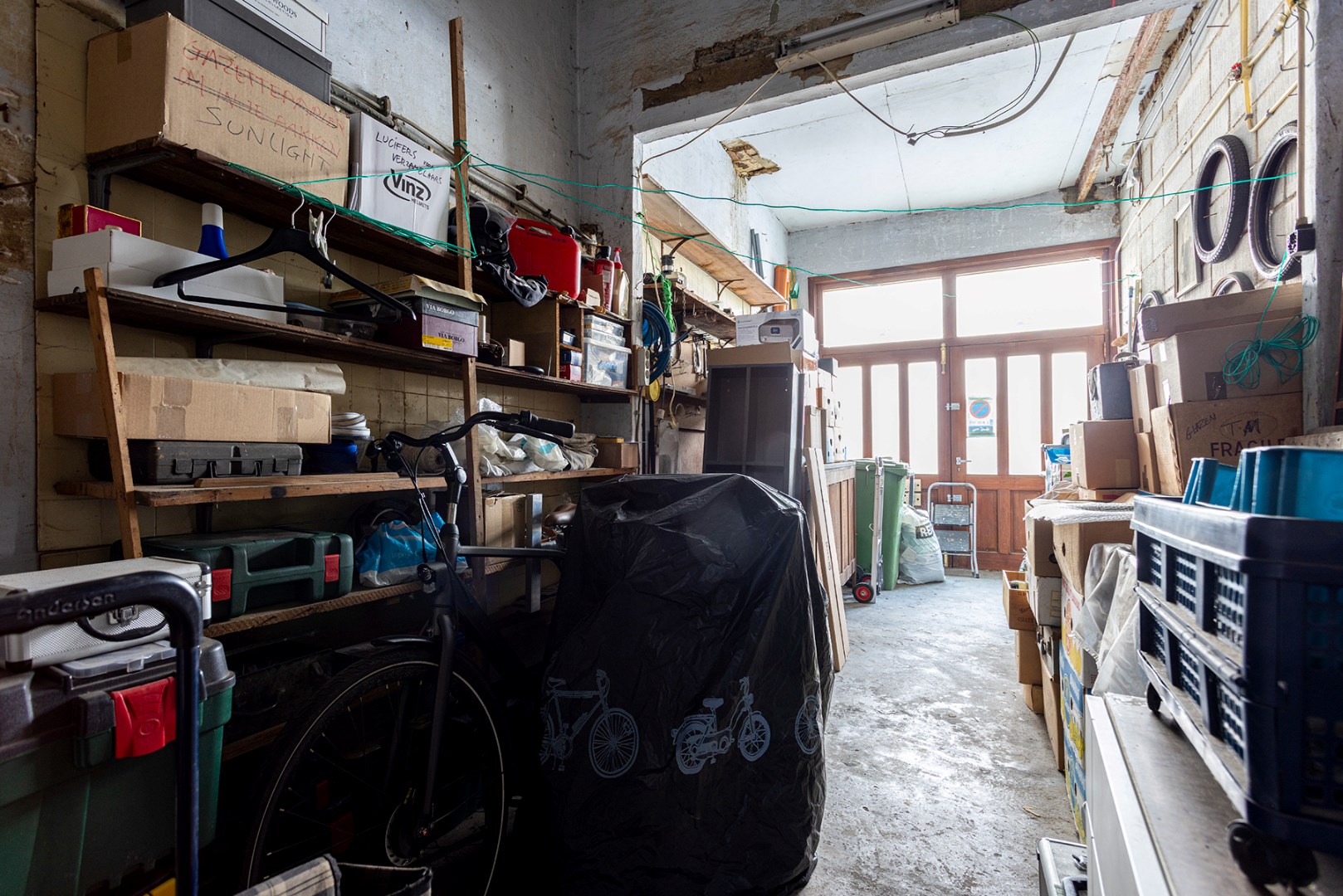Het gelijkvloers bestaat uit een garage die voldoende hoog is om een camionette binnen te plaatsen. Ideaal dus voor een kleine zelfstandige die ruimte wenst en een opslagplaats zoekt of op zoek is naar een atelier. Tevens kan deze ruimte gebruikt worden voor een vrij beroep, ook kan deze als leefruimte of binnentuin dienstdoen. Met andere woorden, dit kan nog ingevuld worden zoals gewenst.