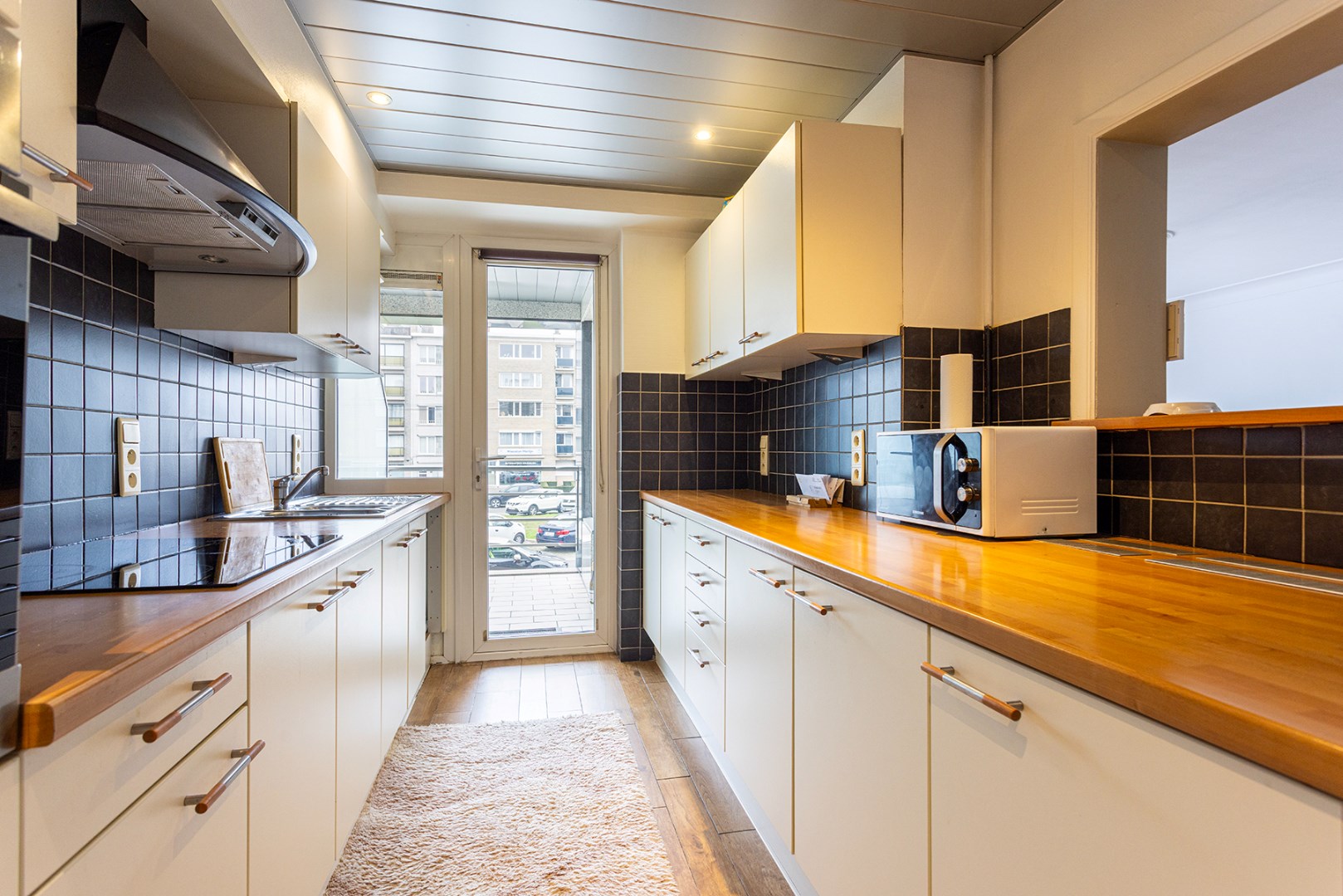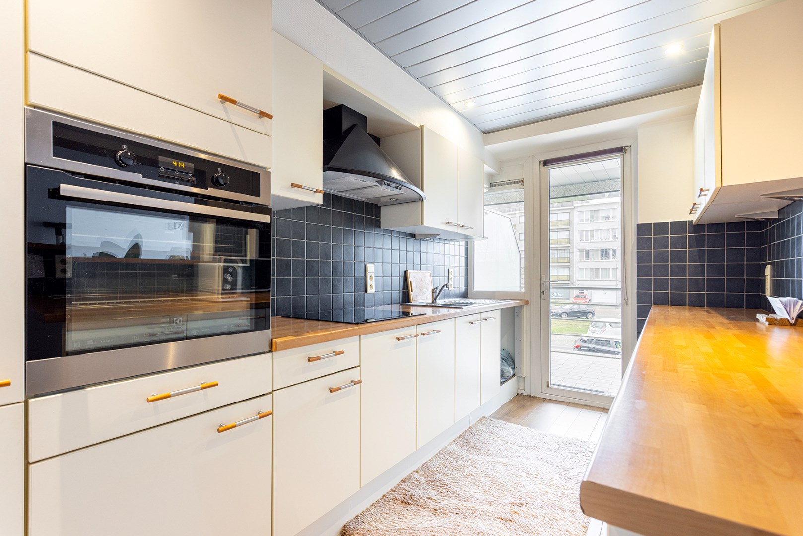 U betreedt het appartement via de centrale inkomhal die toegang geeft aan de meeste ruimtes. De hal heeft een vestiaire en een opbergkast. Vooraan is er de grote leefruimte (34m²) met aanpalend de open ingerichte keuken (11m²) die voorzien is van een keramische kookplaat, dampkap, dubbele spoelbak en oven. U kan het terras (4m²) bereiken via de keuken of de leefruimte.