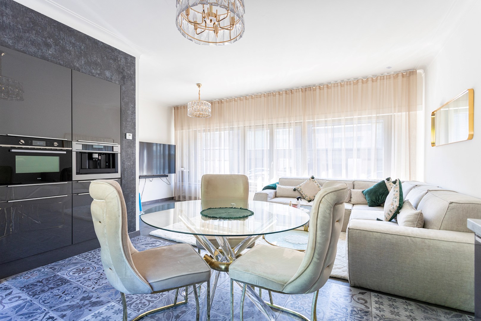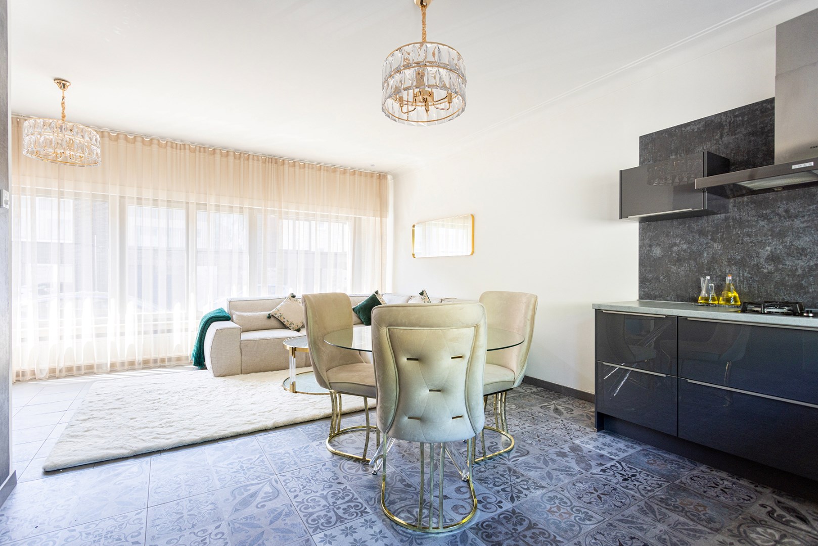 U betreedt het appartement via een inkomhal die op haar beurt doorgang geeft aan een apart toilet met handenwasser en de woonkamer. In de L-vormige, ruime woonkamer (31m²) vindt u een open keuken voorzien van een kookplaat op gas, een dampkap, een vaatwasser, een Amerikaanse koelkast, combi-oven en een ingebouwd koffiemachine. Langs de keuken kan u de stadstuin betreden.