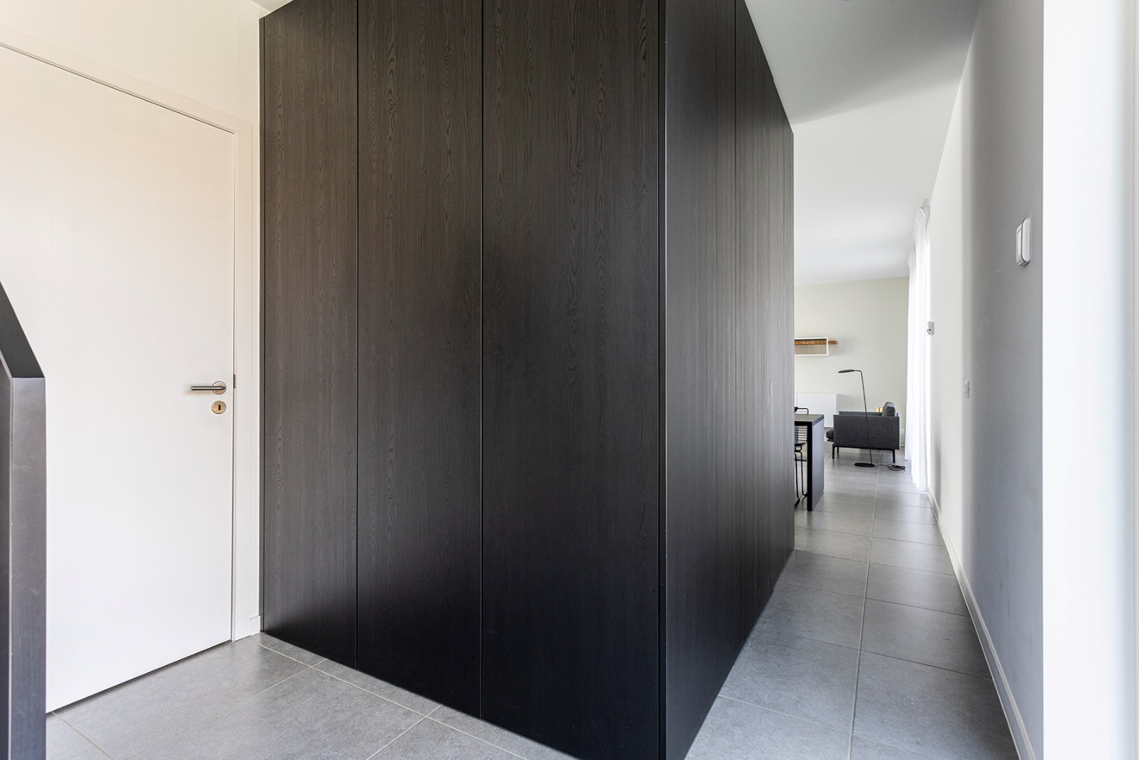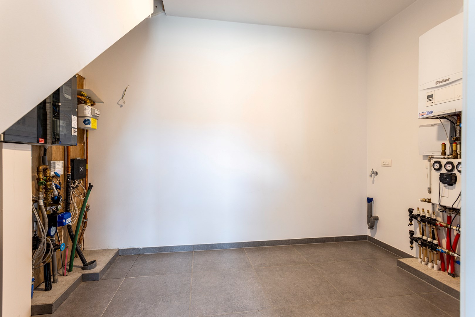 Op het gelijkvloers is er een bergruimte met voorzieningen voor wasmachine en droogkast. De hal met ingemaakte vestiaire kasten beschikt ook nog over een apart toilet met handenwasser.