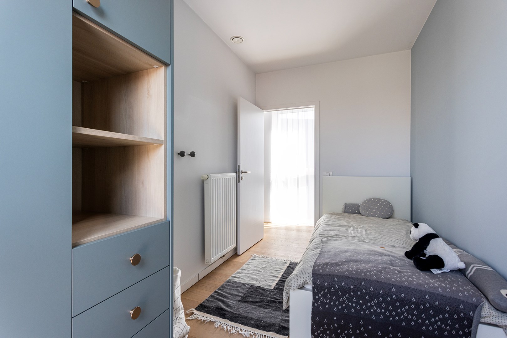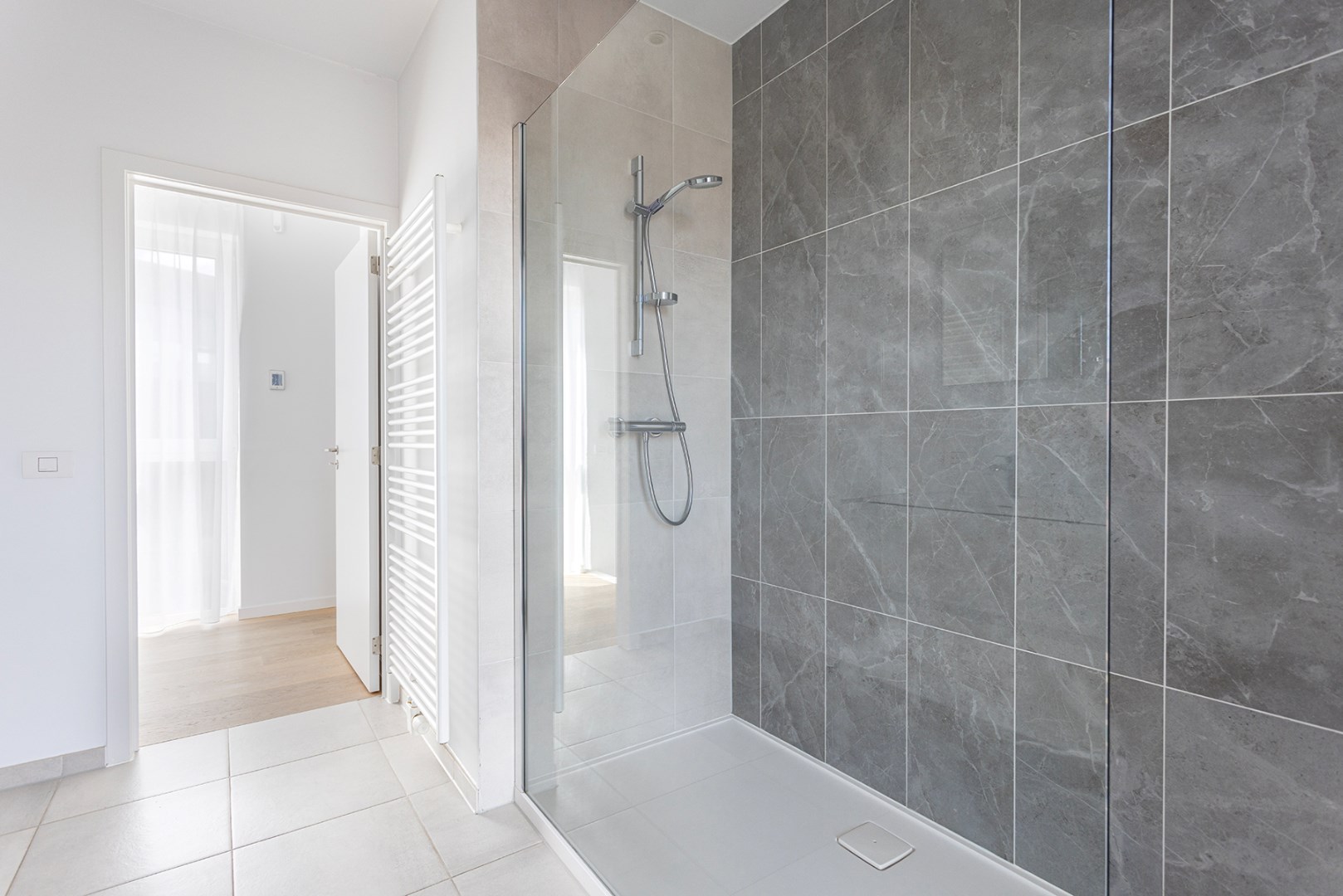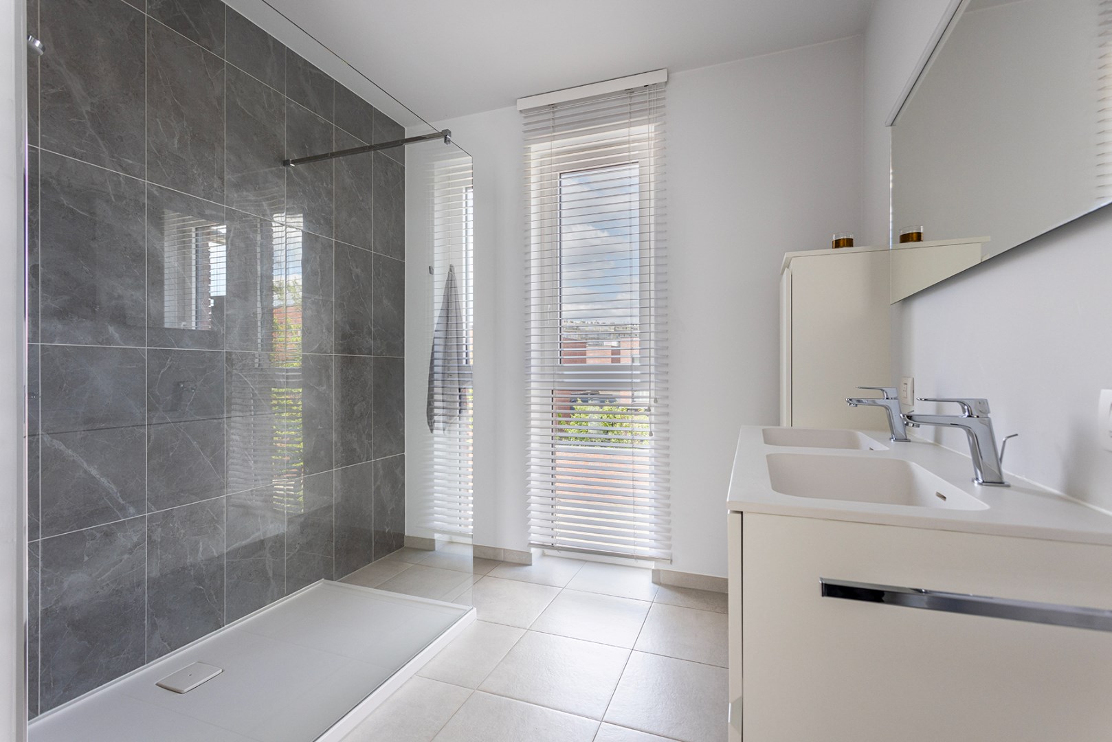 Deze moderne gezinswoning beschikt over drie slaapkamers en een volledige uitgeruste badkamer. De badkamer omvat: een handdoekradiator, een inloopdouche en een dubbel lavabomeubel.