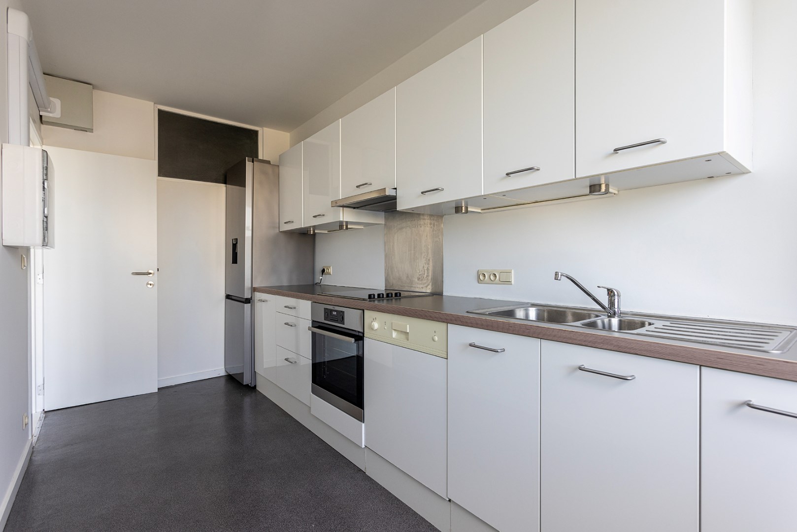Het appartement beschikt over een grote en lichtrijke woonkamer, die vooraan toegang geeft tot de gesloten keuken, die voorzien is van een koelkast, diepvries, keramische kookplaat, oven, afwasmachine en dubbele spoelbak.