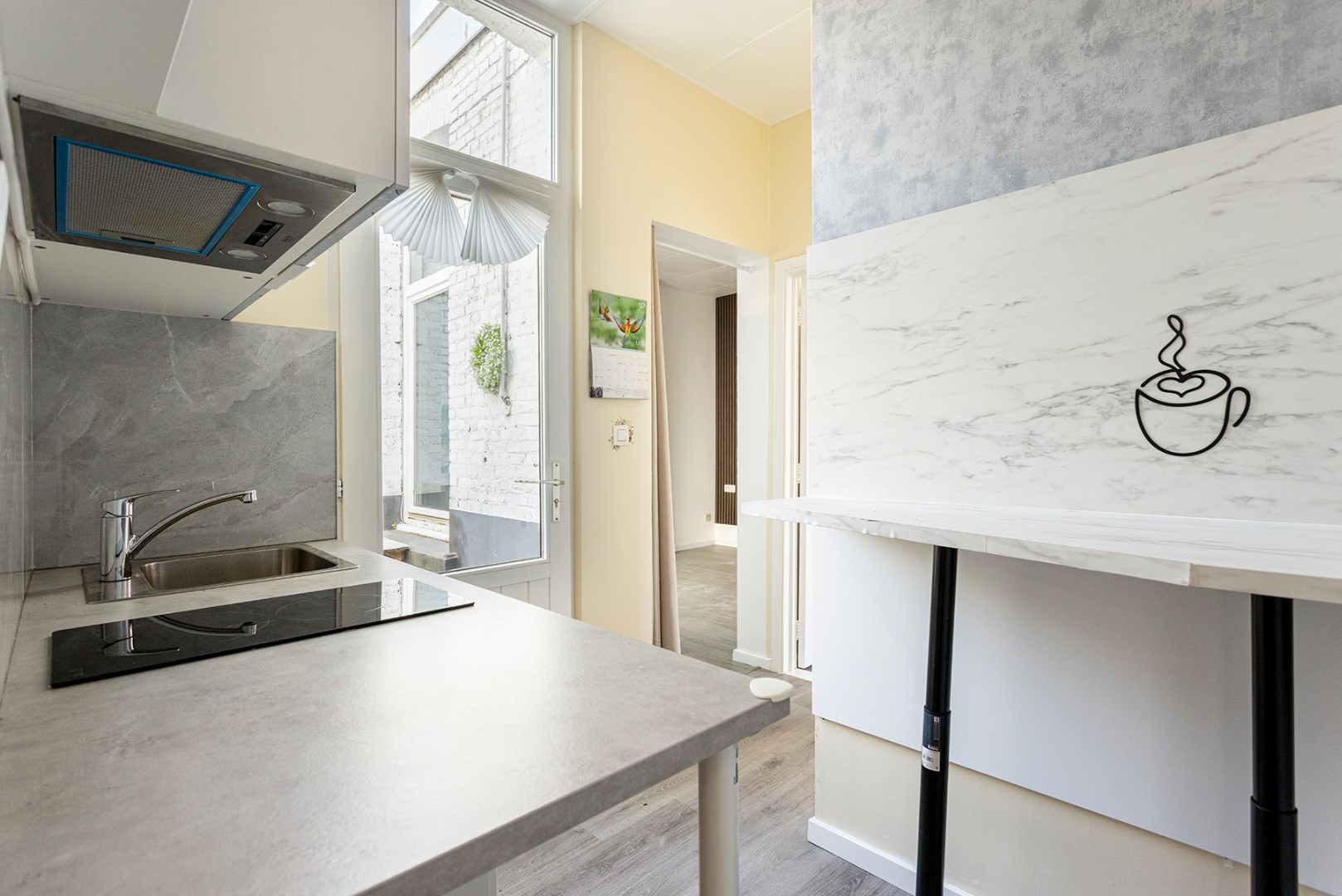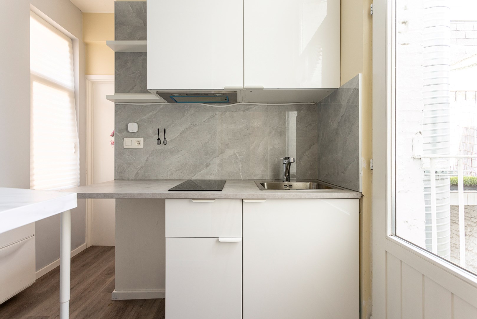 De studio omvat een lichtrijke leefruimte en een open keuken met zithoek. De keuken beschikt over: een dampkap met kookplaat, spoelbak, aansluiting wasmachine.