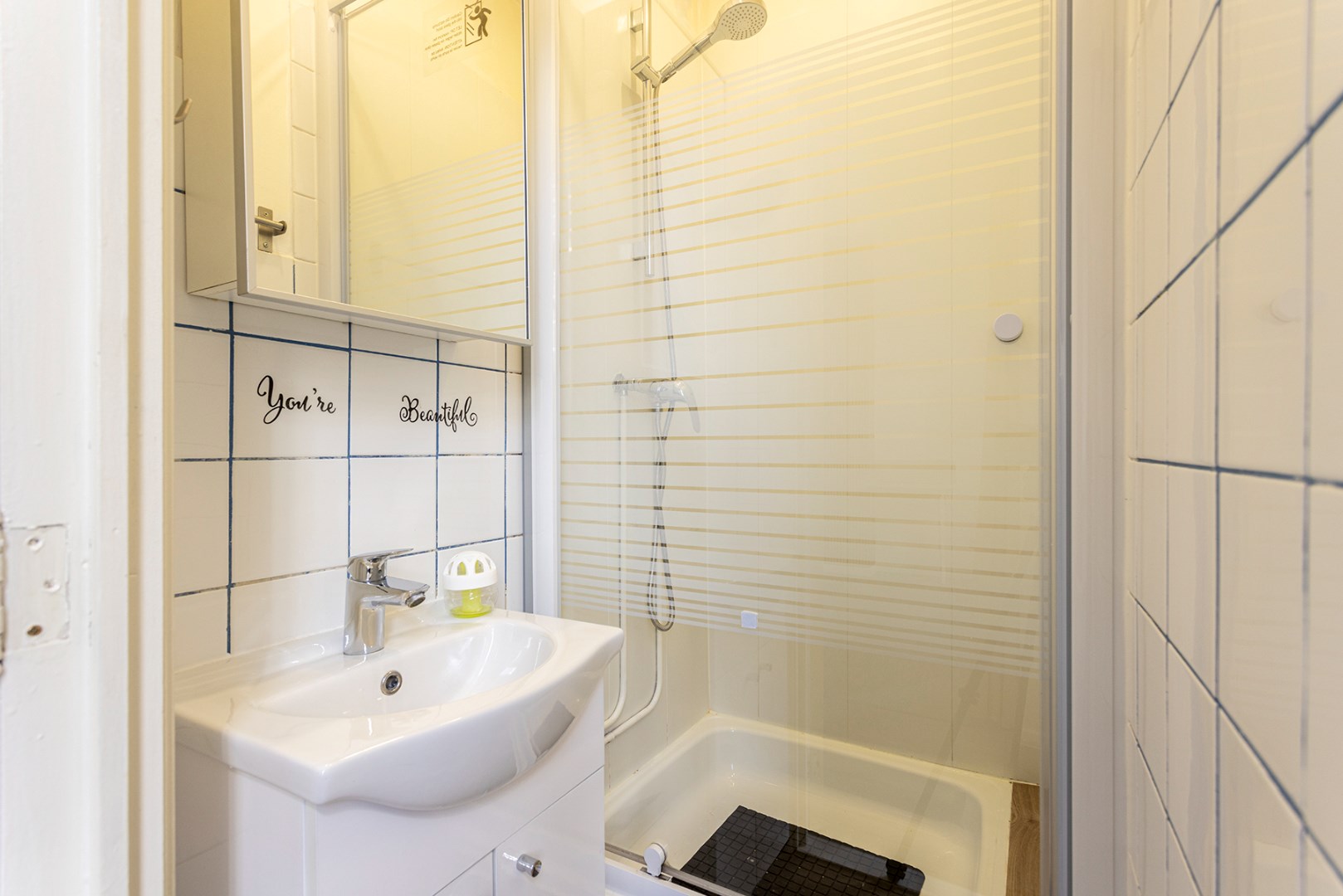 Verder is er nog een aparte slaapkamer en een badkamer met douche en enkel lavabomeubel.