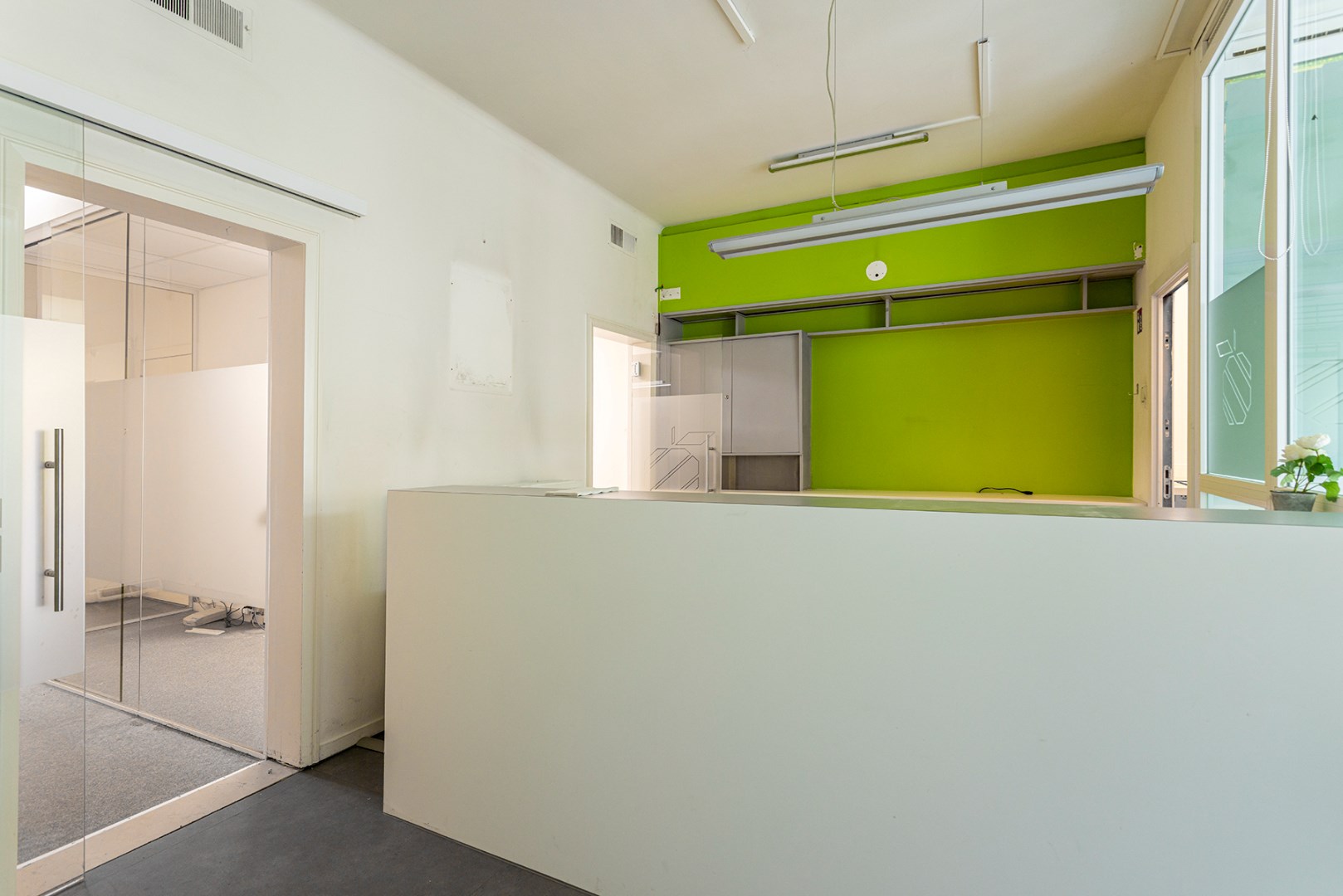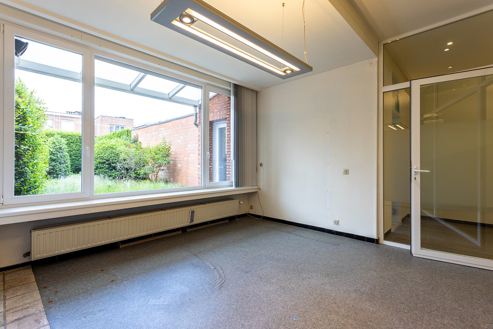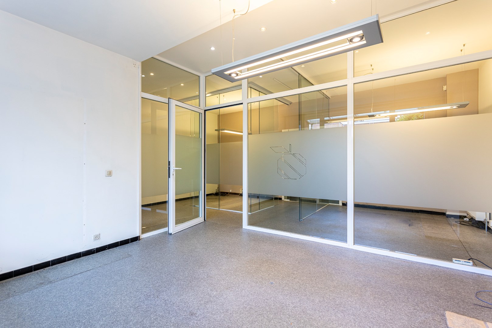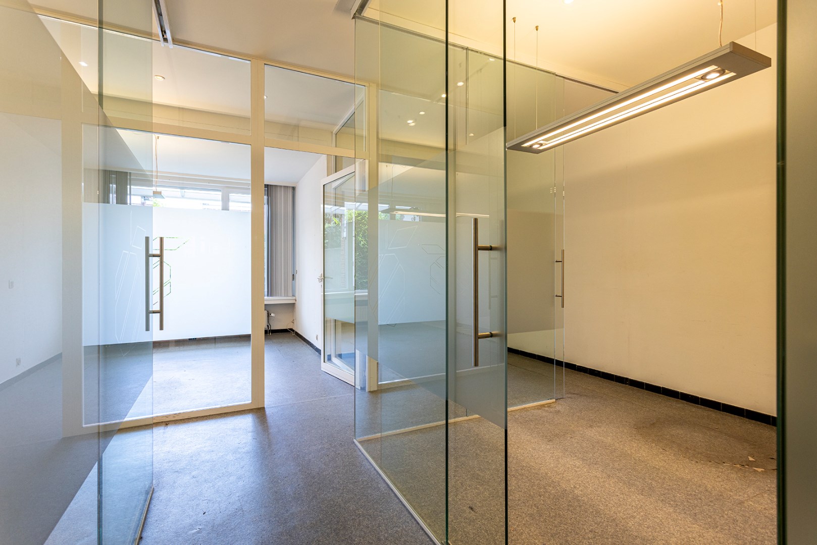Vooraan is er een ontvangstruimte die doorgang geeft aan de receptie met aanpalend een berging. Achteraan zijn er verschillende kantoorruimtes die van elkaar afgescheiden zijn door glas. Achteraan is er een keuken en een toilet. Verder is er een grote tuin.