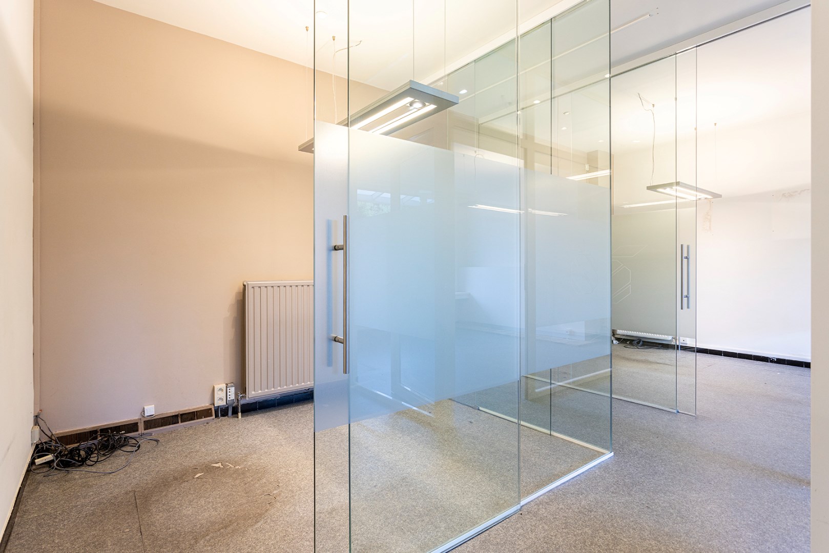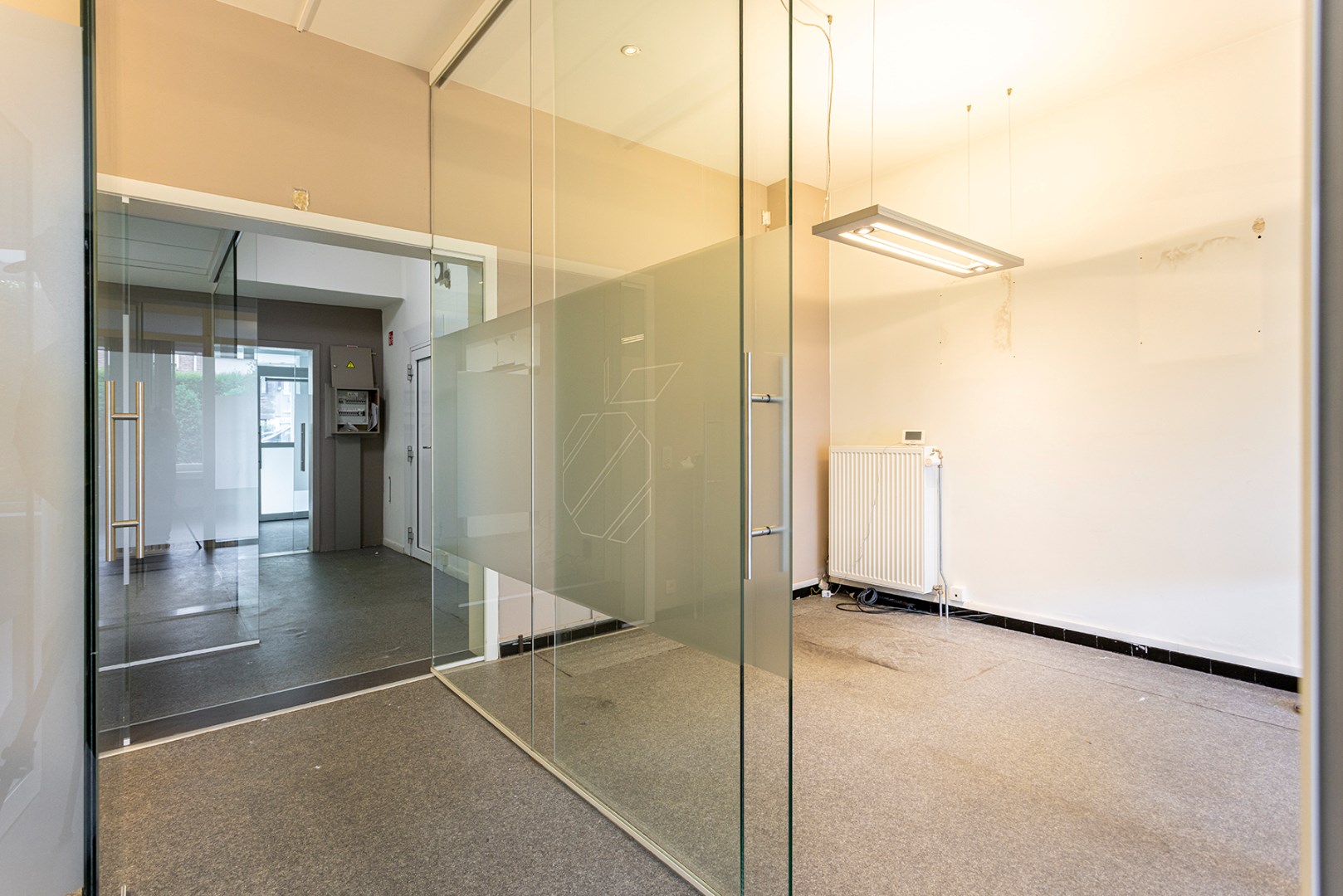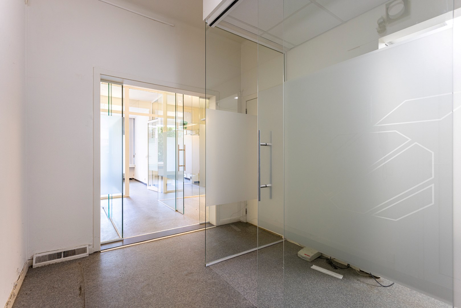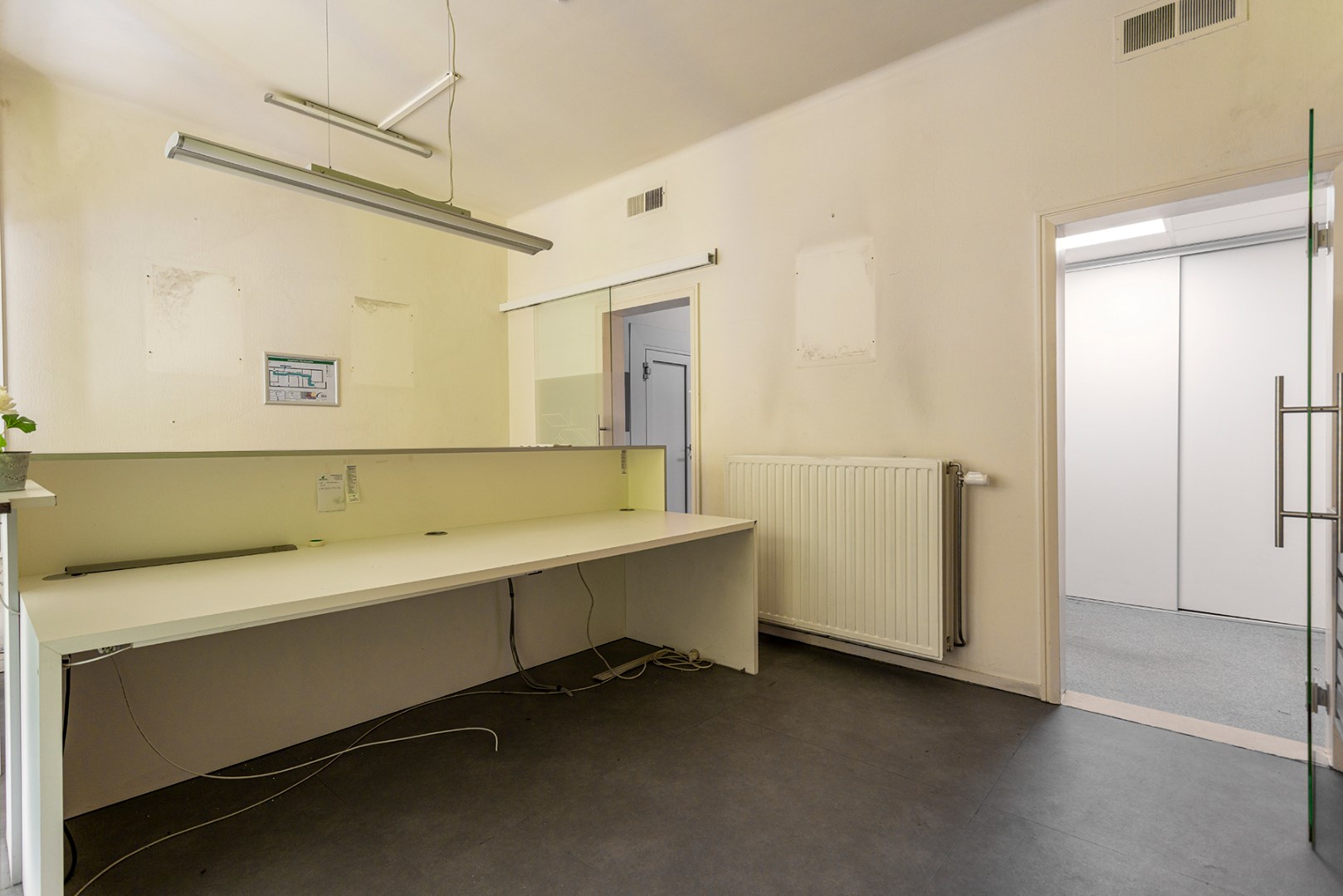 Vooraan is er een ontvangstruimte die doorgang geeft aan de receptie met aanpalend een berging. Achteraan zijn er verschillende kantoorruimtes die van elkaar afgescheiden zijn door glas. Achteraan is er een keuken en een toilet. Verder is er een grote tuin.