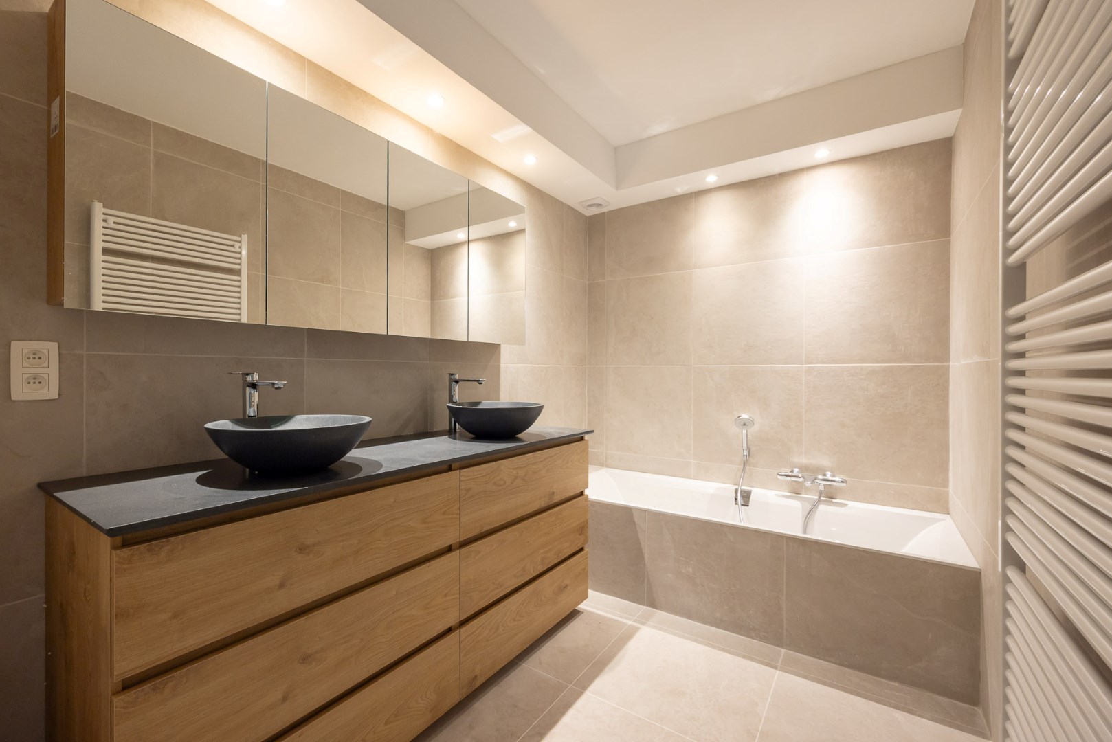 Indeling: de inkomhal (13m²) met vestiaire geeft toegang naar de ruime woonkamer (30m²) met aansluitend de nieuwe open keuken (22m²) voorzien van alle nodige toestellen. Van hieruit heeft u ook toegang naar het terras. Verder is er een bureauruimte (9m²) met natuurlijk lichtinval, een apart gastentoilet en de wasplaats (5m²). Badkamer 1 (7m²) heeft een ligbad en wastafel dubbel in meubel en badkamer 2 (4m²) werd ingericht met douche, toilet en wastafel enkel in meubel. Tenslotte is er de nachthal (12m²) met ingemaakte kasten en toegang tot de 3 slaapkamers (18+15+13m²).