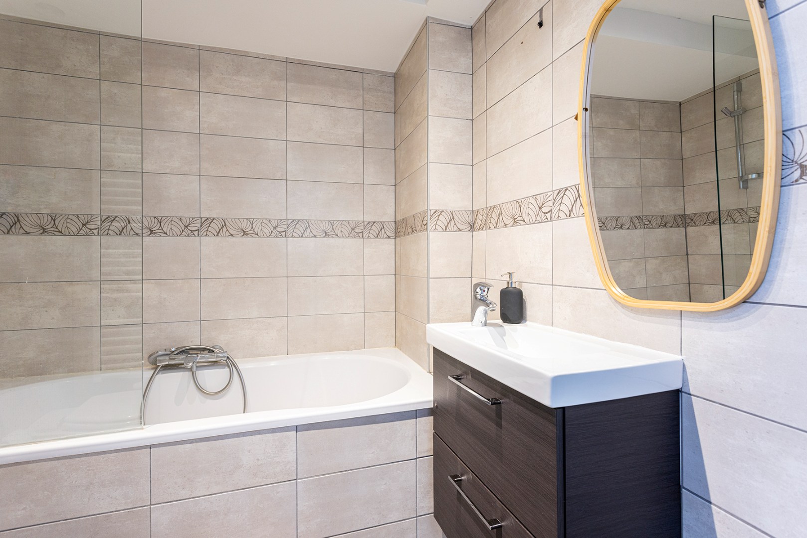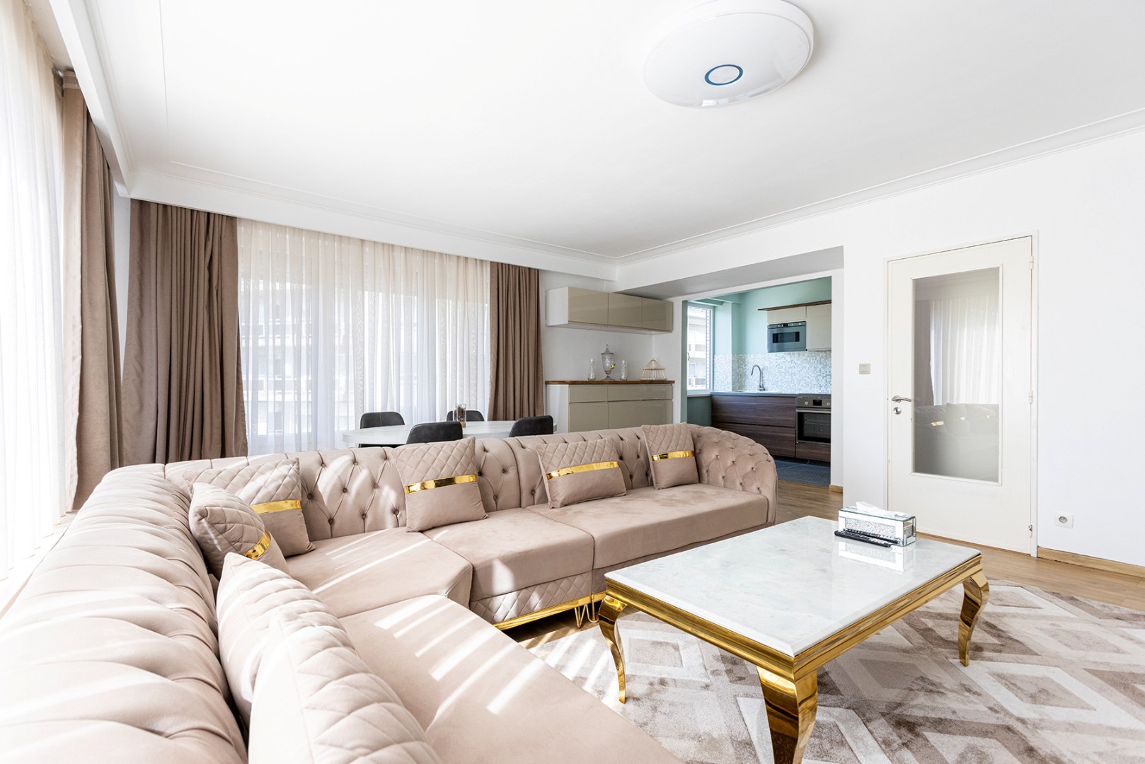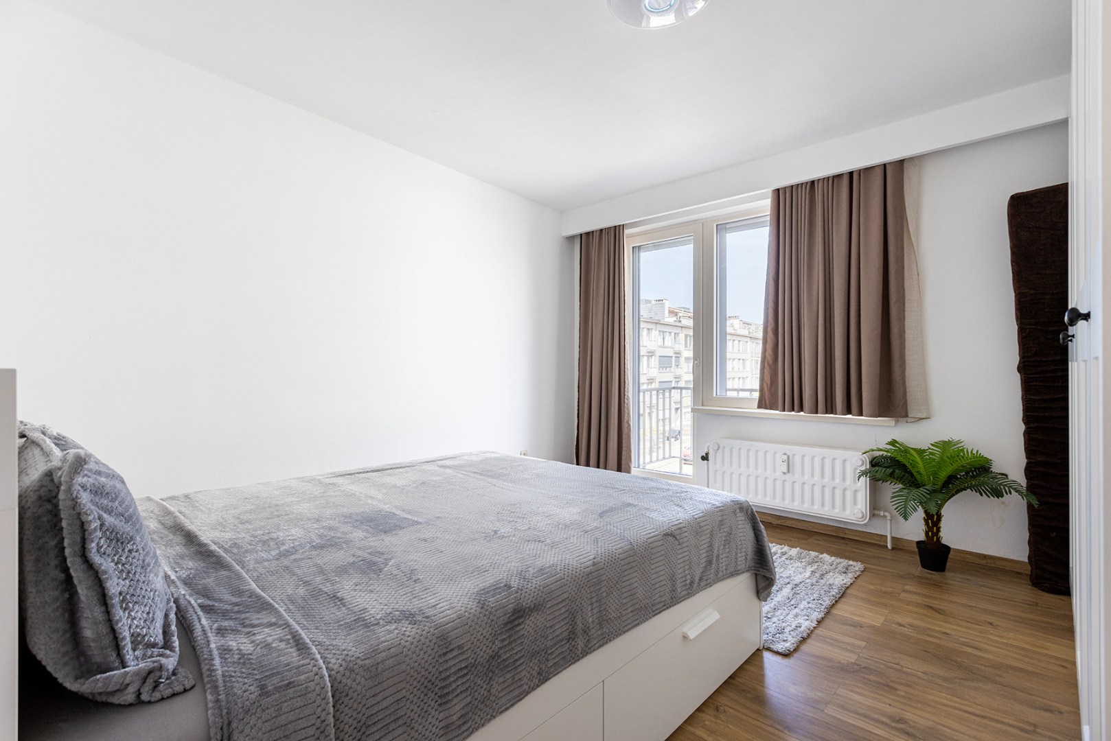 U komt binnen in de centrale hal die doorgang geeft aan de meeste ruimtes. Vooraan is er de woonkamer (33m²) met veel lichtinval, doordat het appartement gelegen is op een hoek. Aanpalend is er de gerenoveerde keuken (6m²) die voorzien is van een inductie kookplaat, dampkap, microgolfoven en enkele spoelbak. De badkamer (3,5m²) heeft een ligbad met douchefunctie, enkele lavabo en een toilet. Achteraan zijn er nog twee slaapkamers (15m² en 7m²), waarvan de grootste slaapkamer doorgang geeft aan het terras (3m²) met ingemaakte kast.