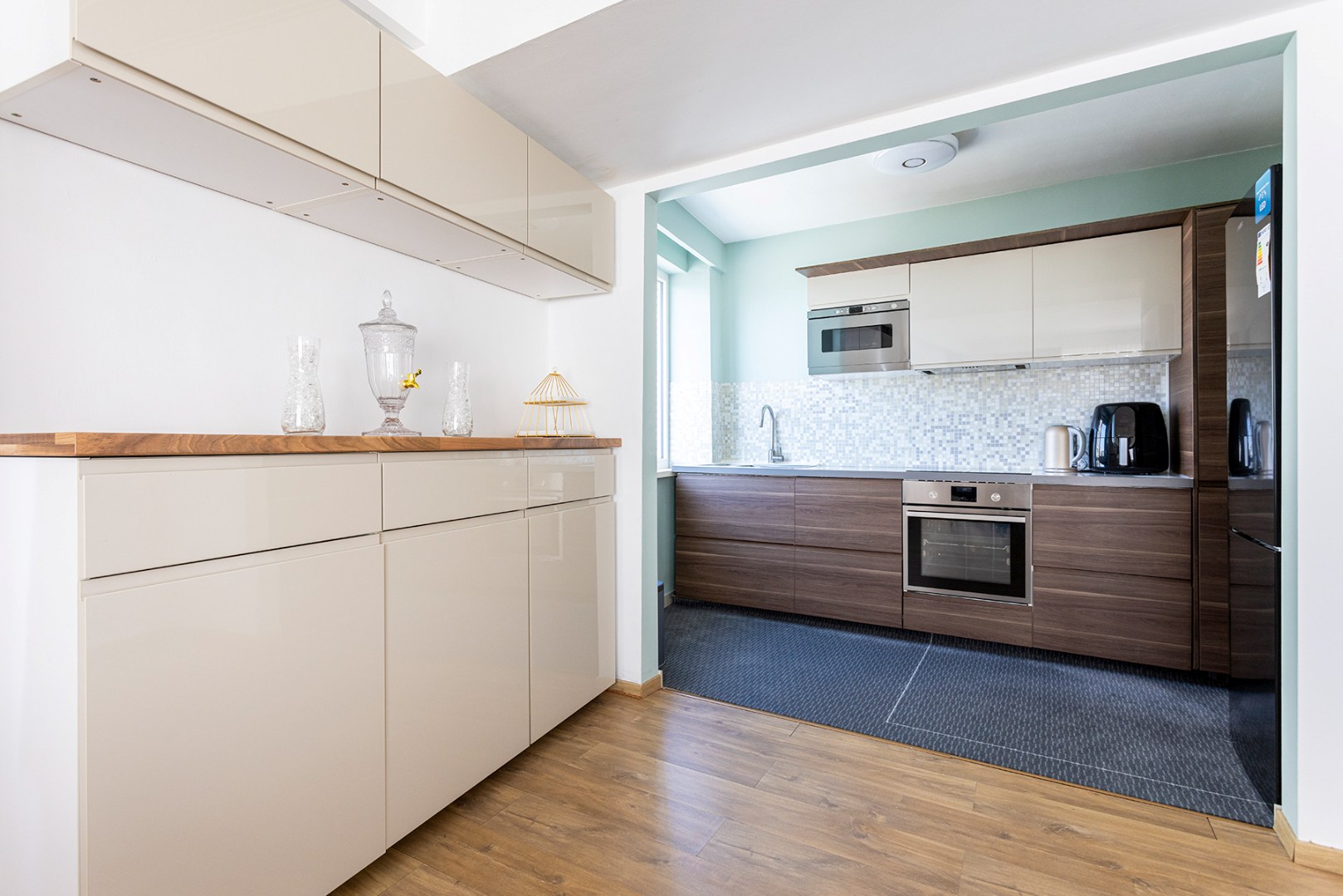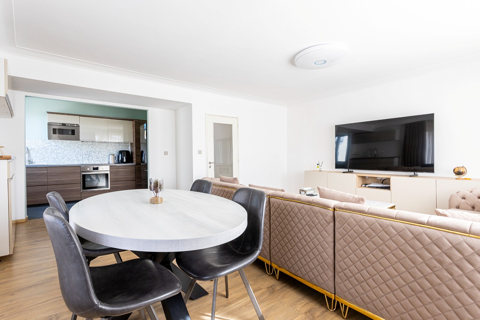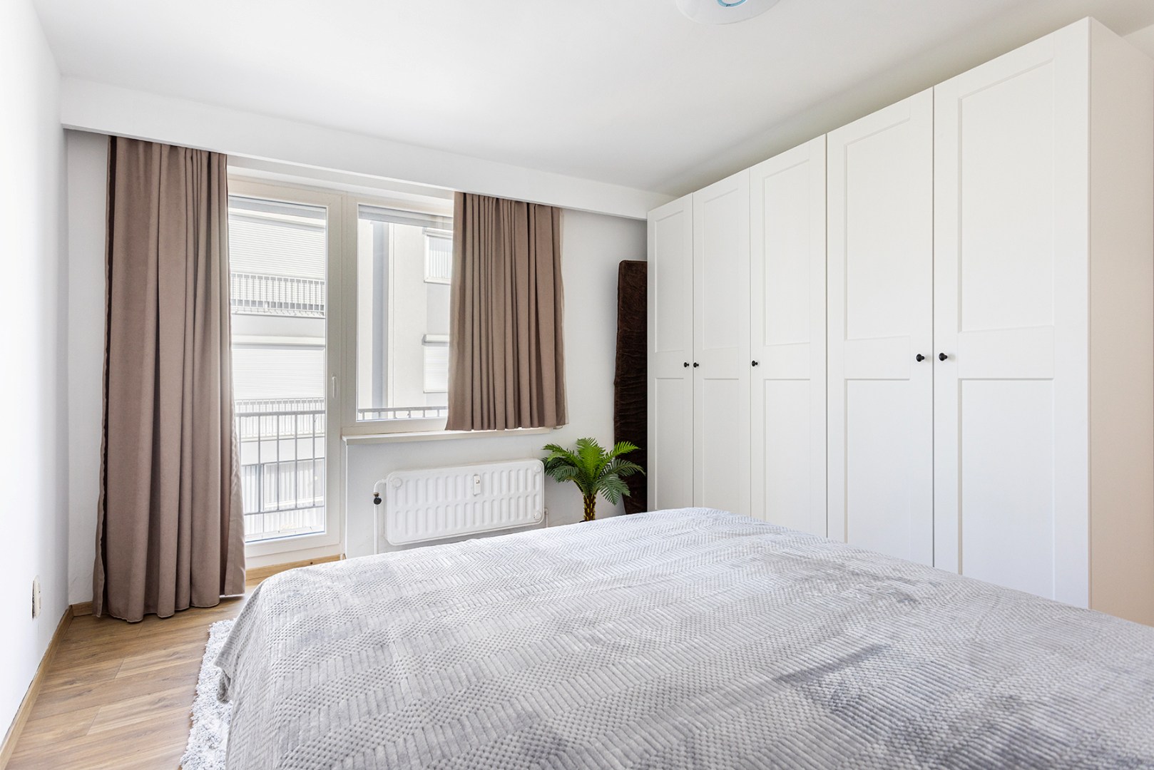 U komt binnen in de centrale hal die doorgang geeft aan de meeste ruimtes. Vooraan is er de woonkamer (33m²) met veel lichtinval, doordat het appartement gelegen is op een hoek. Aanpalend is er de gerenoveerde keuken (6m²) die voorzien is van een inductie kookplaat, dampkap, microgolfoven en enkele spoelbak. De badkamer (3,5m²) heeft een ligbad met douchefunctie, enkele lavabo en een toilet. Achteraan zijn er nog twee slaapkamers (15m² en 7m²), waarvan de grootste slaapkamer doorgang geeft aan het terras (3m²) met ingemaakte kast.