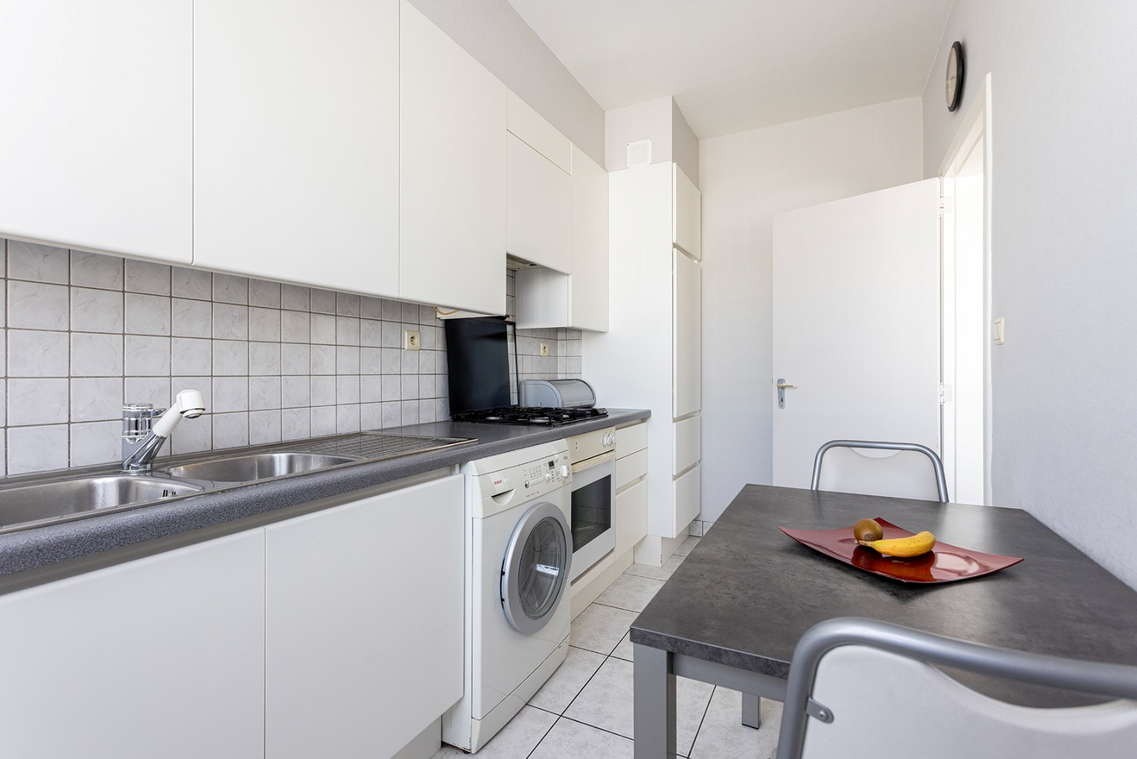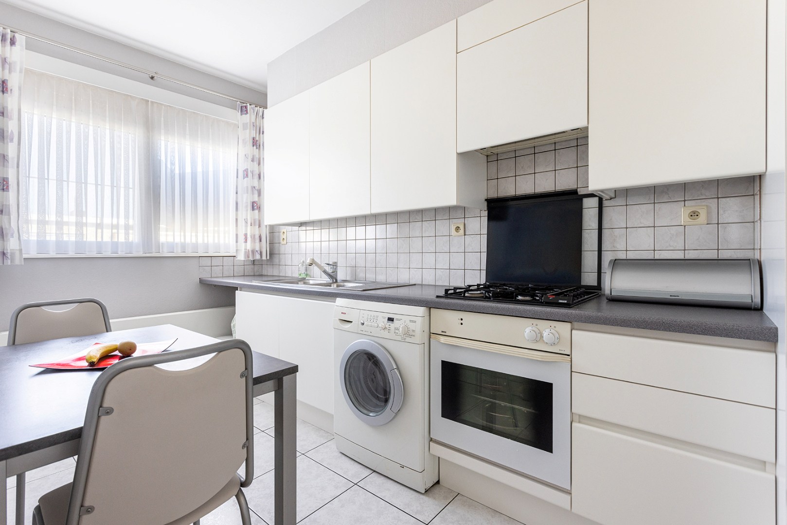 U betreedt het appartement via een centraal gelegen inkomhal, dewelke doorgang geeft aan de woonkamer, een badkamer met inloopdouche, een apart toilet, twee ruime slaapkamers, waarvan de tweede toegang verschaft aan het terras en een dressing/berging. De keuken, voorzien van een kookplaat op gas, dampkap, oven, dubbele spoelbak en de aansluiting voor de wasmachine, kan u via de woonkamer bereiken.