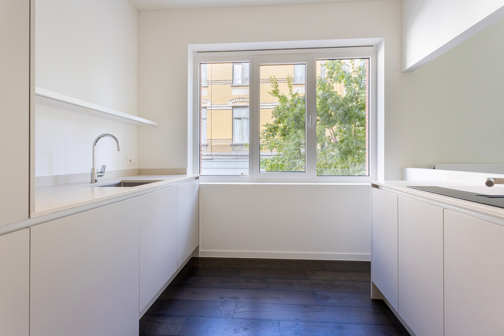 U betreedt het appartement via de inkomhal. Vooraan bevindt zich de lichtrijke woonkamer met open keuken, die uitkijkt op een aangenaam, groen zicht met bomen en die eveneens veel lichtinval heeft door zijn hoekligging. De keuken is grijs/beige van kleur en is greeploos met een composiet beige natuurstenen werkblad (gepolijst). Verder is er een inductiekookplaat met geïntegreerde dampkap, vaatwasser, oven, inox spoelbak en een ingebouwde koelkast met vriesvak.