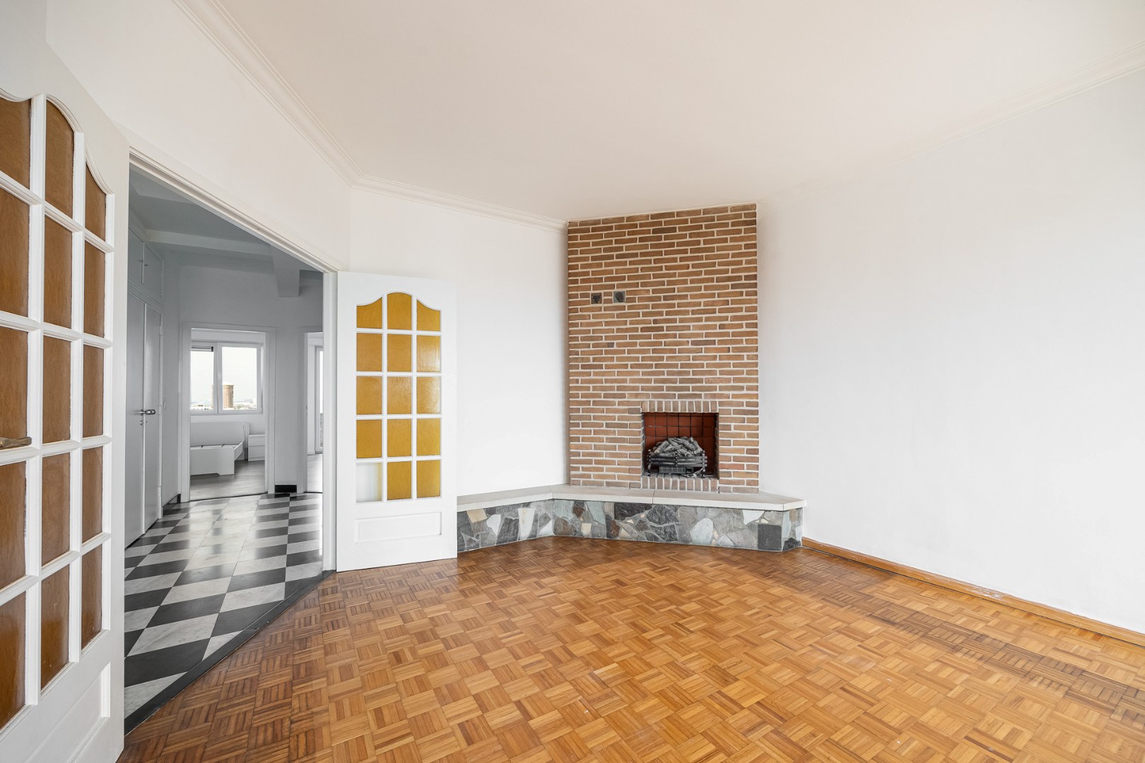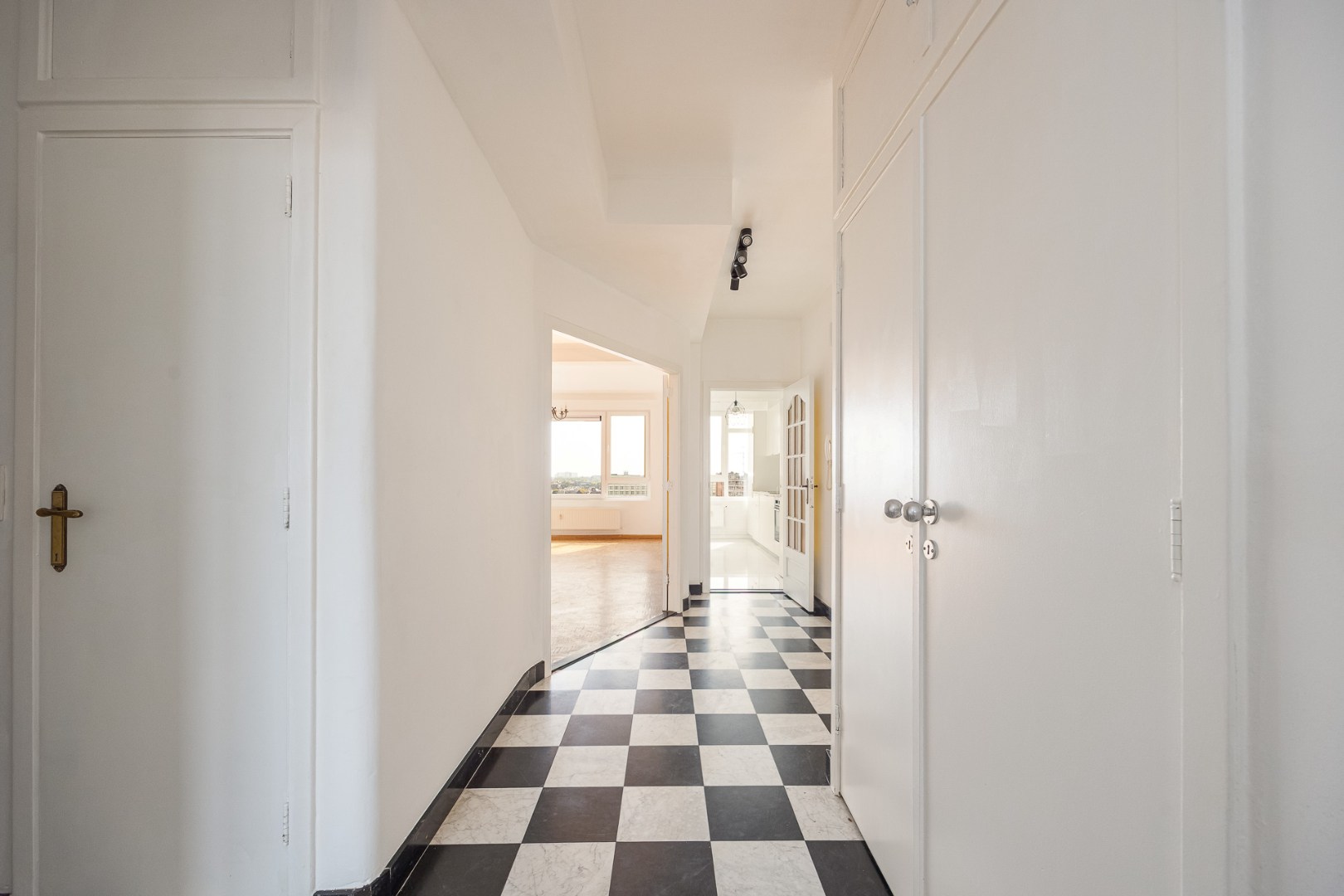 U komt binnen in een centraal gelegen inkomhal met ingemaakte vestiairekast, die doorgang geeft aan een ruime woonkamer met authentieke blokjesparket. Hierlangs bereikt u de vernieuwde keuken. Centraal in het appartement bevindt zich de badkamer met ligbad, aansluiting voor de wasmachine en daarnaast een apart toilet. De twee ruime slaapkamers, beide voorzien van laminaat, situeren zich achteraan het appartement, waarvan de grootste kamer doorgang geeft aan een ruim terras. Hier kan u genieten van een prachtig panoramisch zicht over de stad!