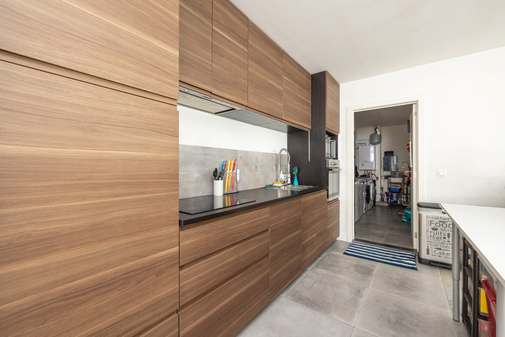 De hal geeft ook doorgang aan een toilet, de badkamer (7m²), twee slaapkamers (15m² en 7m²) en de inpandige garagebox van 16,m². De moderne badkamer heeft een inloopdouche en een dubbele lavabo verwerkt in een badkamermeubel.