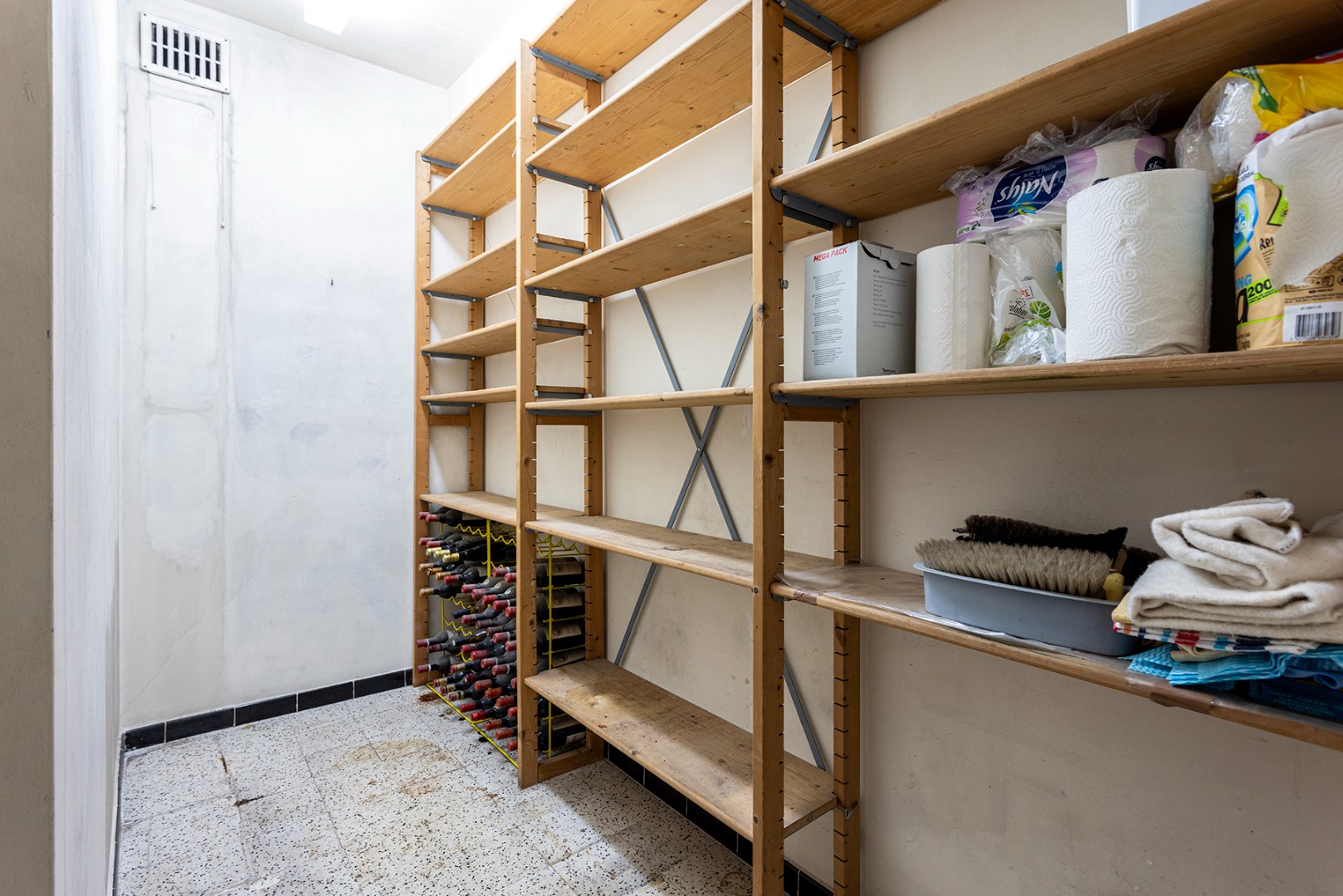U komt binnen in de inkomhal met aan de rechterzijde een apart gastentoilet en een vestiaire, aan de linkerzijde is er een grote berging (5m²) en een kleine berging. Verder is er de grote woonkamer (57m²) met veel lichtinval doordat er overal ramen aanwezig zijn. De woonkamer heeft nog een deur die toegang geeft naar de staanplaatsen achteraan. Aanpalend aan de woonkamer is er de eerste slaapkamer van 14m². Verder is er aan de andere zijde de keuken (7m²), een apart toilet, de tweede slaapkamer inclusief dressing (20,5m²) en badkamer (8m²). De keuken is voorzien van een dubbele spoelbak, oven, kookplaat en dampkap. De badkamer heeft een ligbad met douchefunctie, bidet en enkele lavabo.