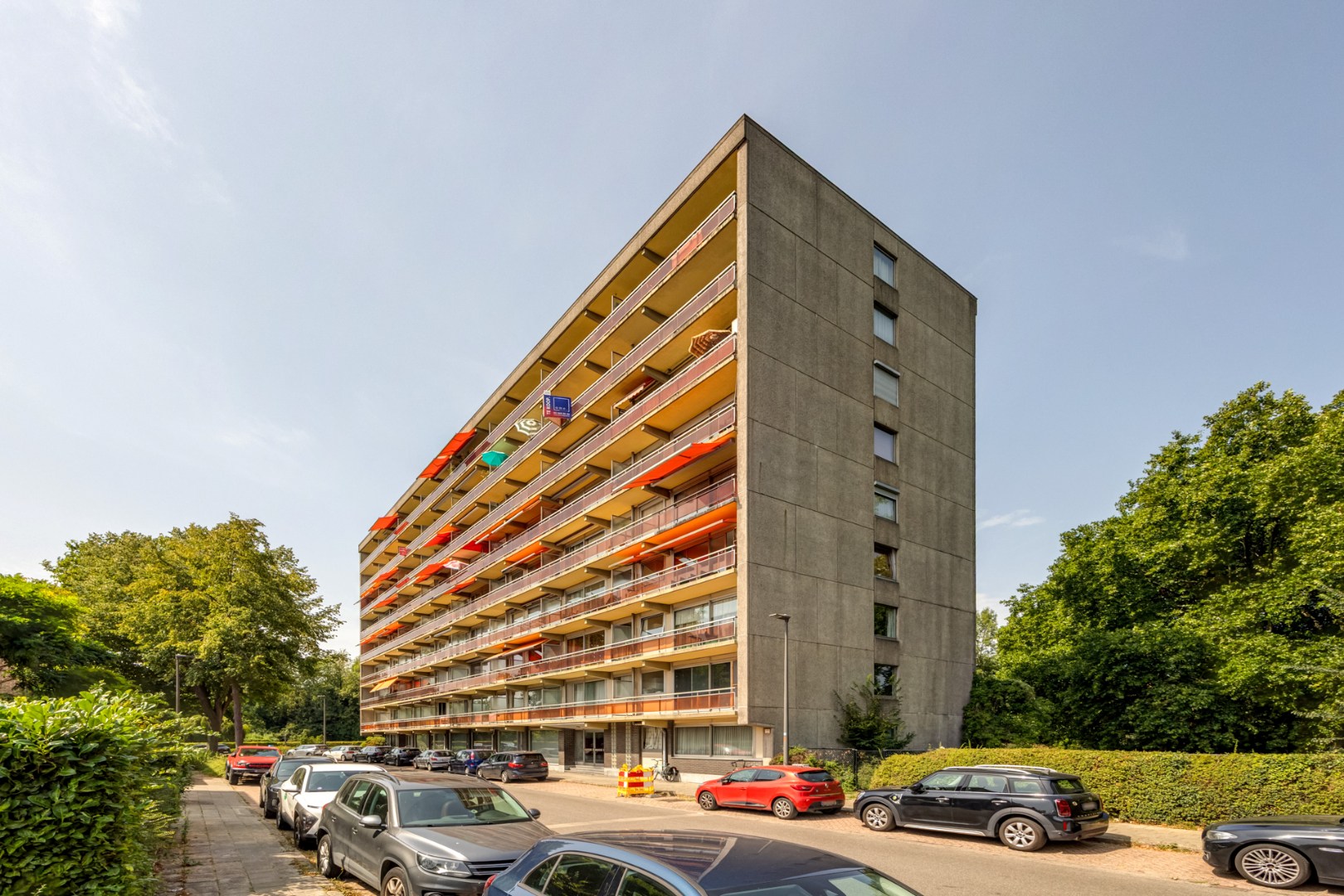 U betreedt het appartement via de centrale inkomhal die voorzien is van twee ingemaakte kasten. Vooraan is er de lichtrijke woonkamer (32m²) met aanpalend het eerste terras (7,5m²) over de ganse lengte. Naast de woonkamer is er de keuken (8m²) die voorzien is van een dampkap, dubbele spoelbak en een aansluiting voor een vaatwasser. Centraal is er de badkamer met enkele lavabo, ligbad met douchefunctie en een aansluiting voor een wasmachine. Er is een apart gastentoilet. Achteraan zijn er twee slaapkamers (13m² en 15m²) waarvan één slaapkamer doorgang geeft aan het terras (8m²) achteraan met zicht op groen.