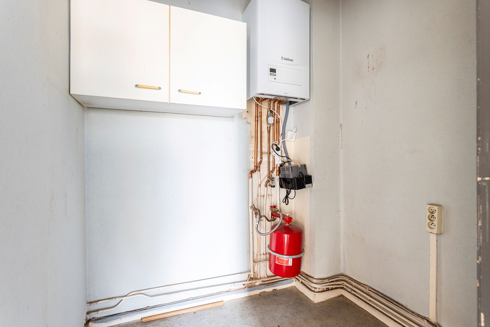 De inkomhal geeft toegang tot de meeste ruimtes in het appartement. Vooraan is er de woonkamer met daarnaast de keuken die doorgang geeft aan het terras vooraan. Tussen de gang en de keuken is er een extra kamer waar de ketel voorzien is.