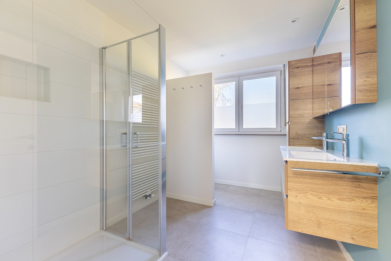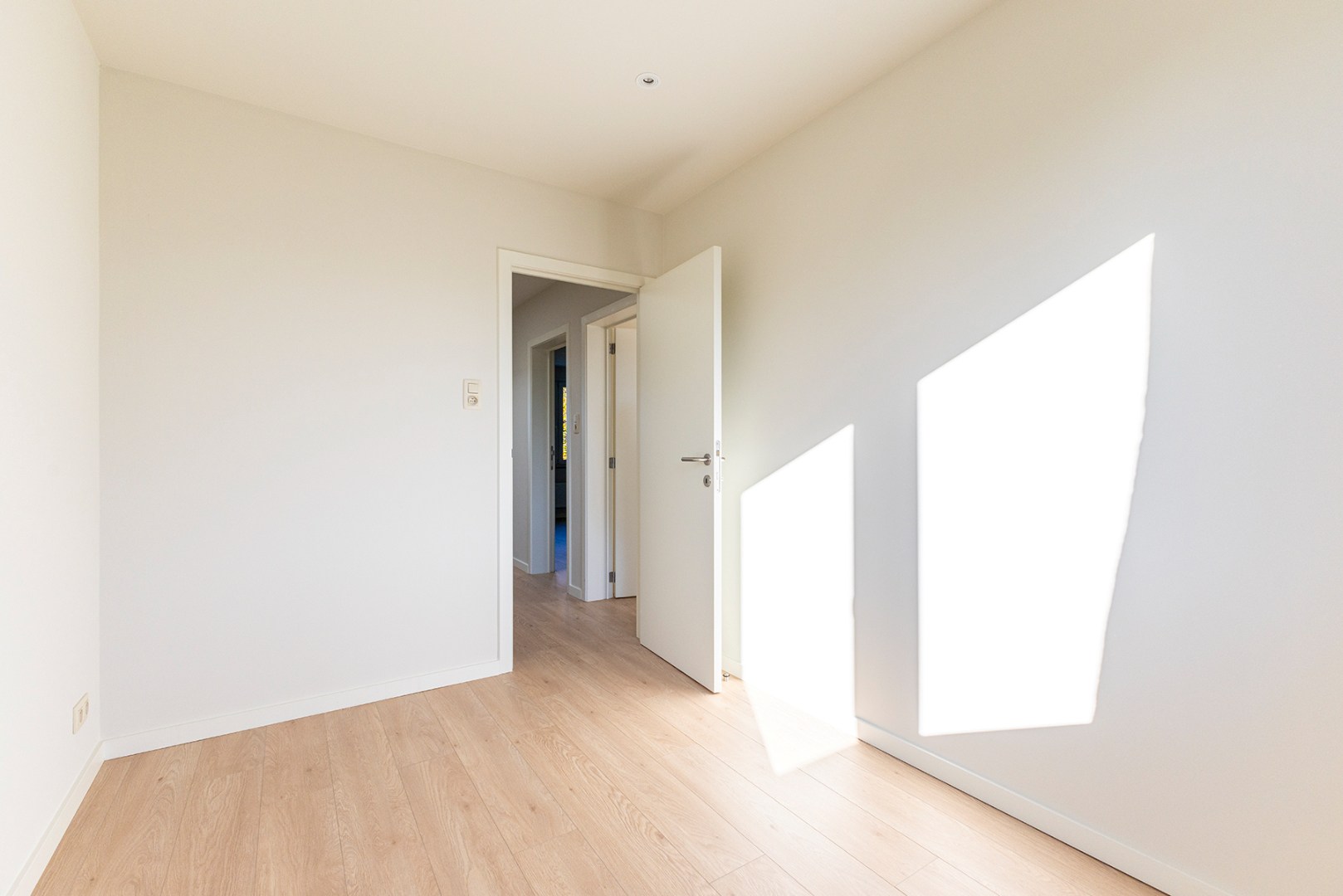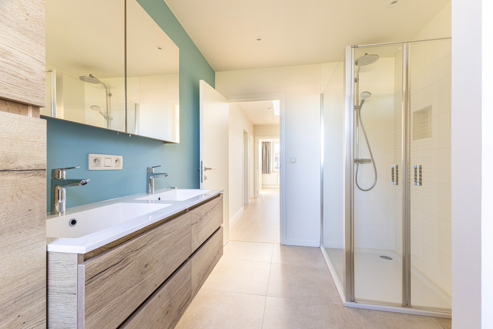 Op de tweede verdieping bevinden zich drie volwaardige slaapkamers, ideaal voor een gezin, home office of hobbyruimte. De badkamer omvat een douche, toilet, handdoekradiator en een dubbel lavabomeubel.