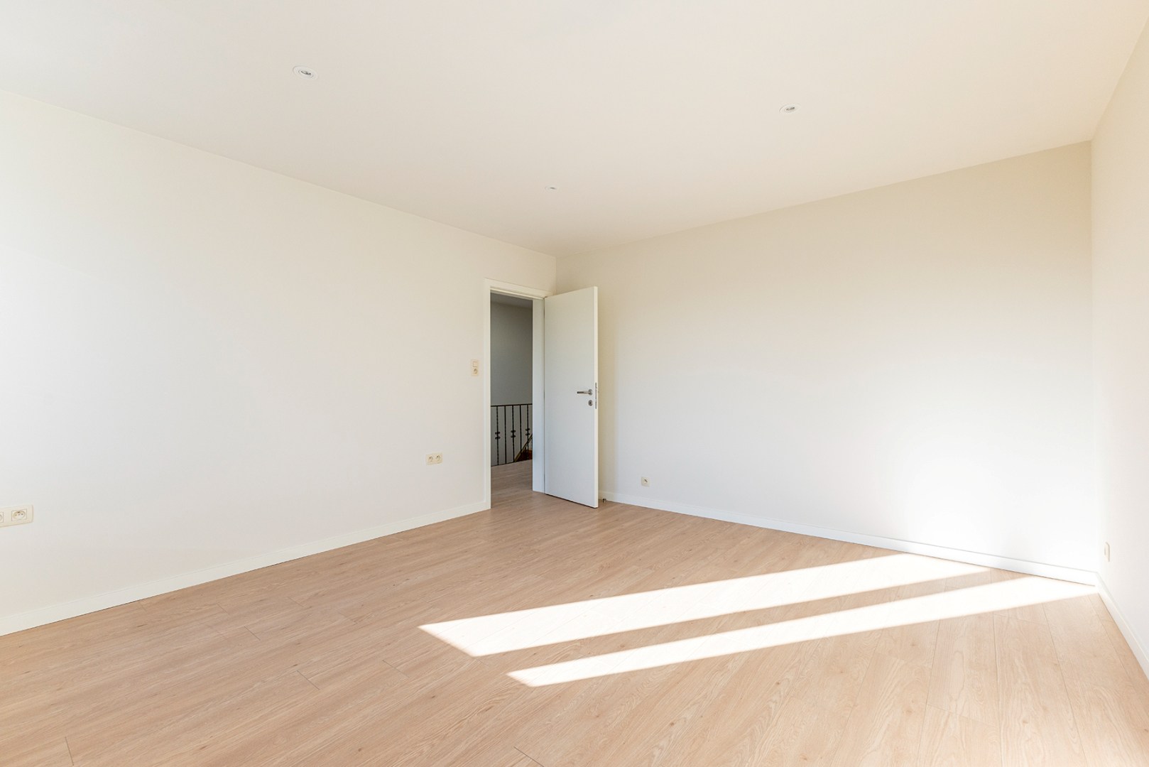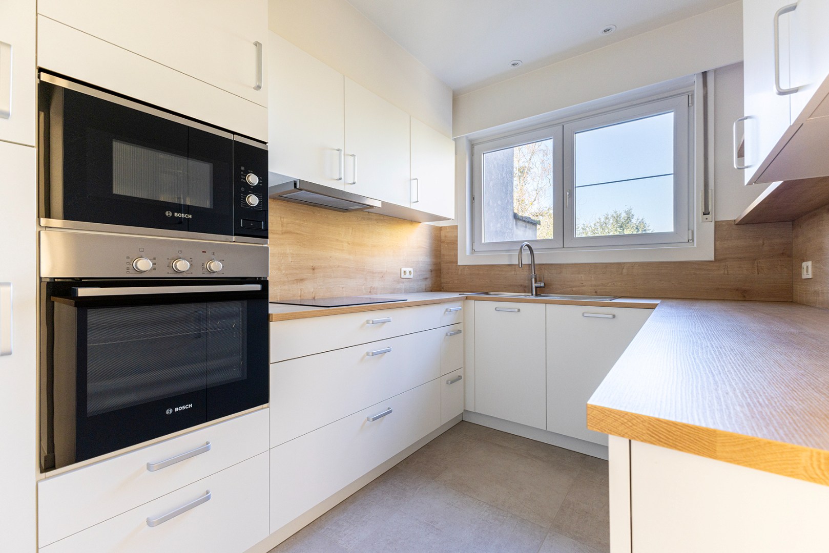De leefruimte op de eerste verdieping geniet van veel natuurlijke lichtinval en vormt samen met de aangrenzende eetplaats en veranda een uitnodigende plek om te ontspannen. De keuken is praktisch ingericht en heeft alle nodige toestellen. Bovendien is er ook een Quooker kraan aanwezig.