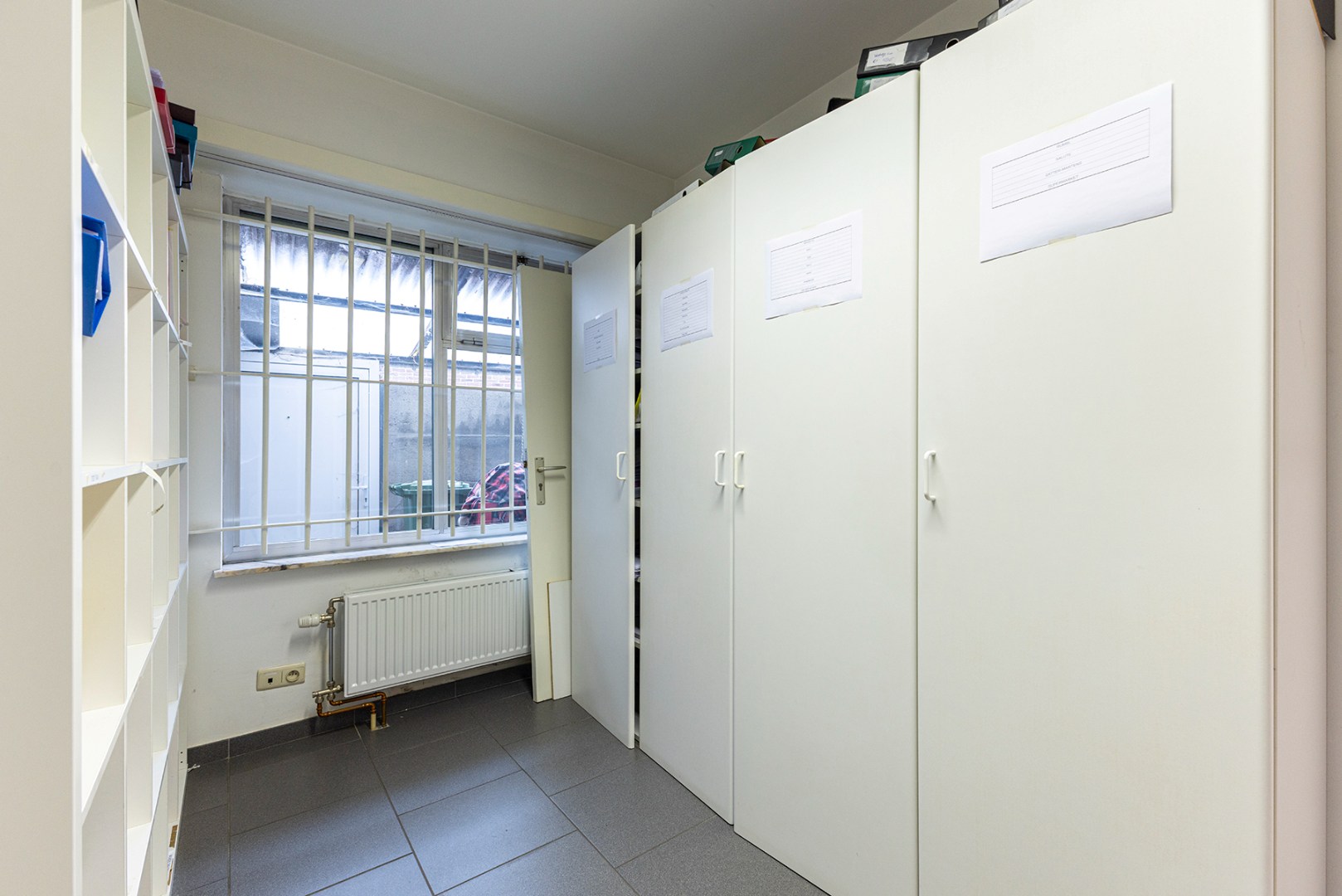U komt via de zijkant van het hoofdgebouw binnen met een aparte inkomdeur. U betreedt direct de ontvangstruimte/bureaukamer (40m²). Aan de linkzijde zijn er twee aparte bureaukamers (beiden 10m²), waarvan één voorzien is van ingebouwde kasten. Aan de rechterzijde is er een momenteel een voorraadkamer/dossierkamer van 12,5m² (voormalige kluis met kluisdeur). Centraal is er een keuken (9m²) die voorzien is van een spoelbak, kookplaat, dampkap, oven en microgolfoven. Verder zijn er twee toiletten en een kleine bureaukamer (9,5m²) aan de rechterzijde. Er is ook een deels overdekte koer die te bereiken is via de buitenkant.