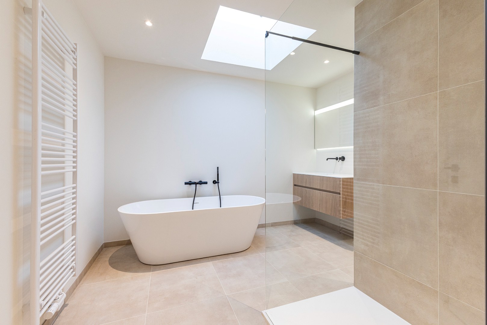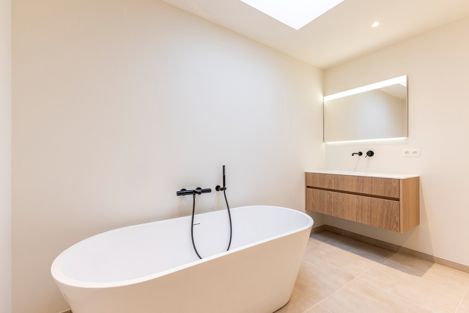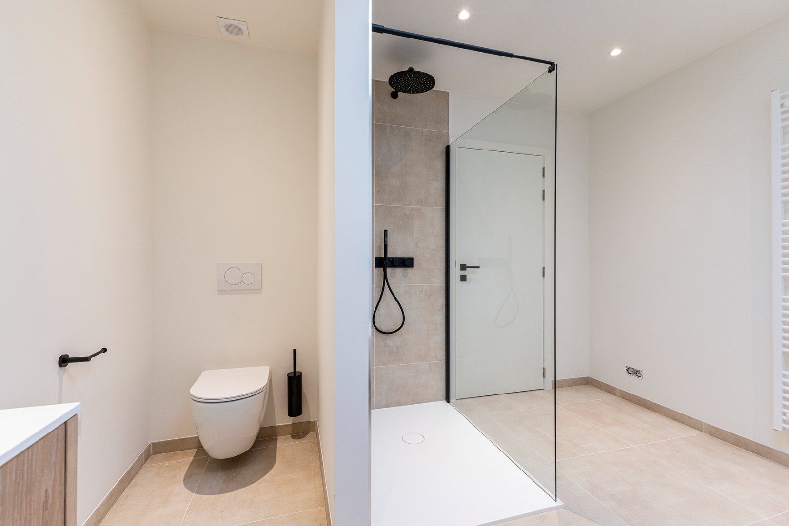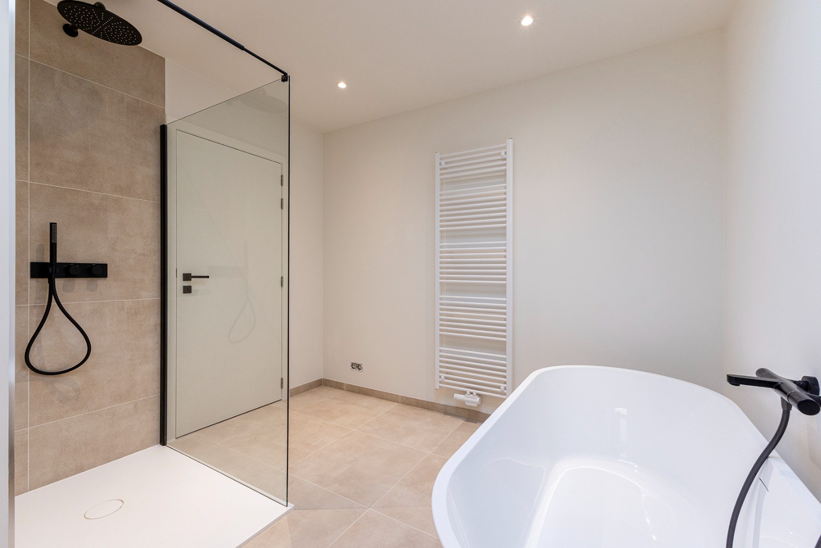 Indeling: de inkomhal geeft toegang tot het gastentoilet en de inpandige garage (12m²) die dienst doet als technische ruimte. Vervolgens komen we in de ruime woonkamer (45m²) met lichtkoepel en hoge plafonds. Aansluitend is er de ingerichte open keuken (18m²) met zicht en toegang naar de zuidwest gerichte tuin. Verder is er beneden een slaapkamer (16m²) met toegang tot het terras en de ruime badkamer (10m²) met ligbad, inloopdouche, toilet en wastafel enkel in meubel. Op de 2de verdieping zijn er nog 2 ruime slaapkamers (22+15m²).