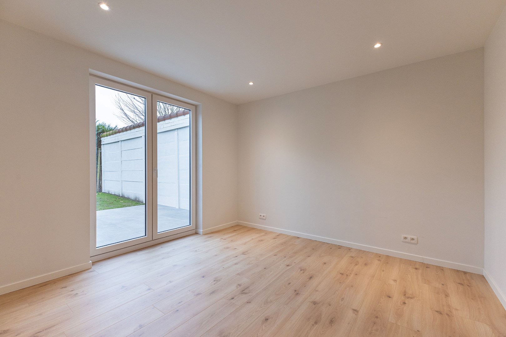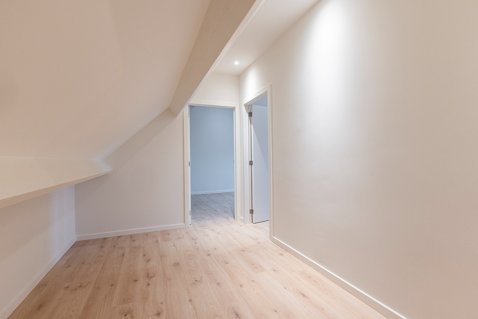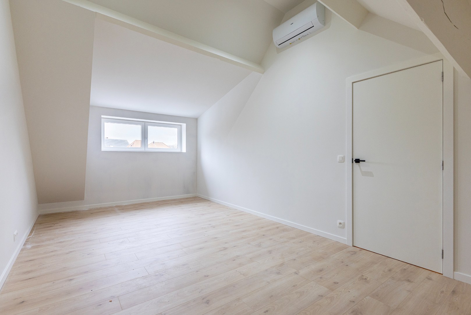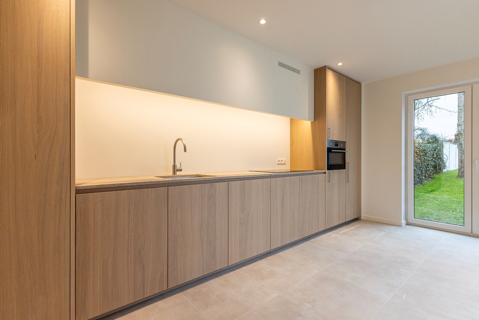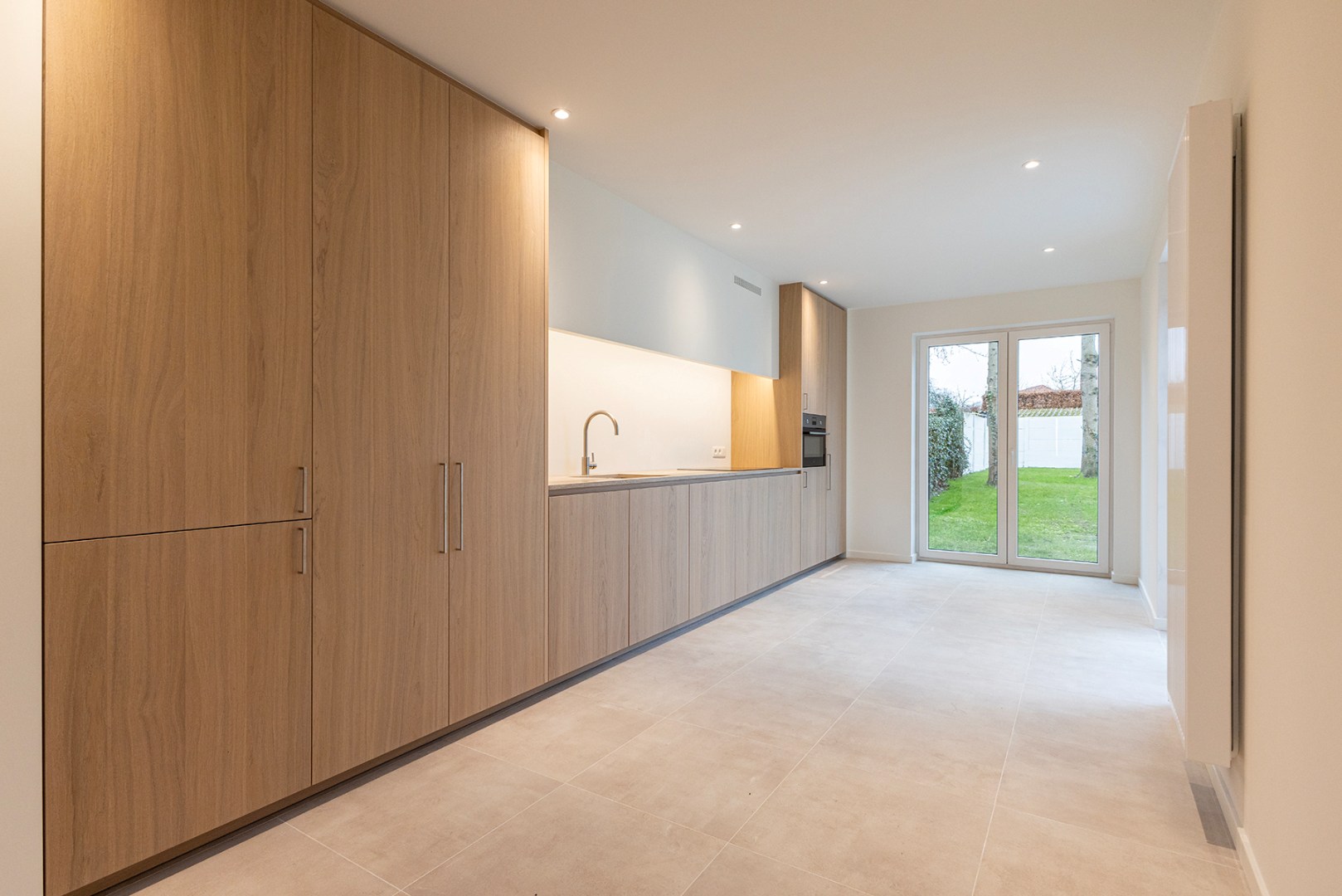 Indeling: de inkomhal geeft toegang tot het gastentoilet en de inpandige garage (12m²) die dienst doet als technische ruimte. Vervolgens komen we in de ruime woonkamer (45m²) met lichtkoepel en hoge plafonds. Aansluitend is er de ingerichte open keuken (18m²) met zicht en toegang naar de zuidwest gerichte tuin. Verder is er beneden een slaapkamer (16m²) met toegang tot het terras en de ruime badkamer (10m²) met ligbad, inloopdouche, toilet en wastafel enkel in meubel. Op de 2de verdieping zijn er nog 2 ruime slaapkamers (22+15m²).