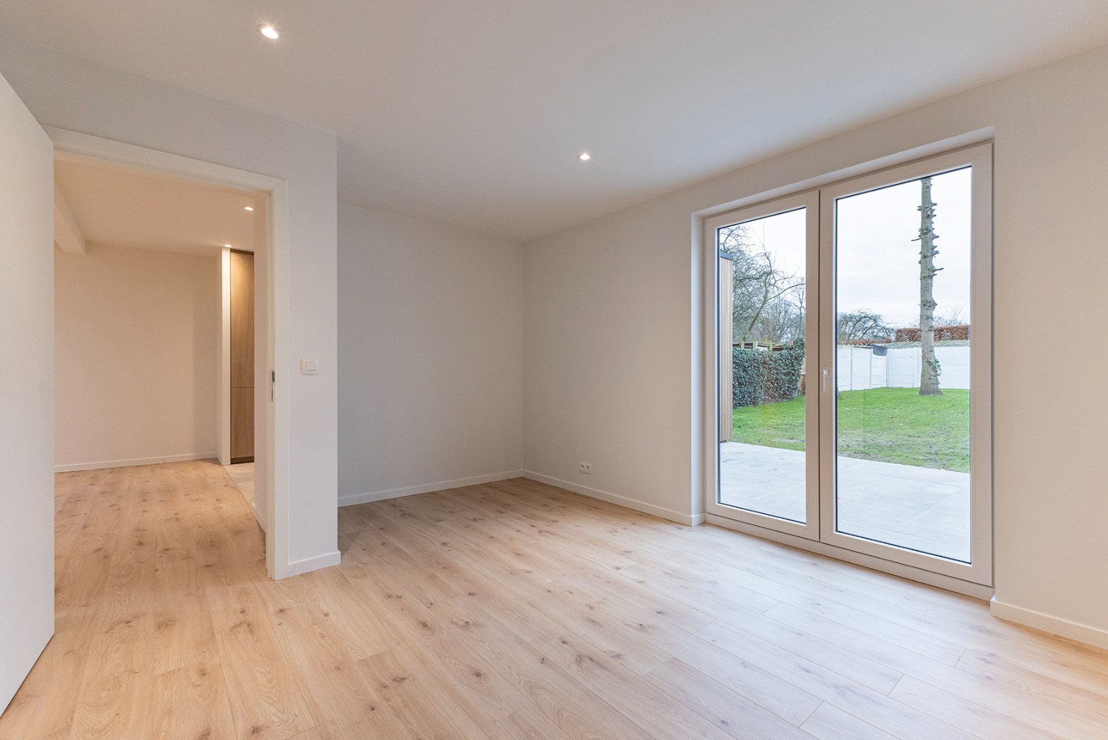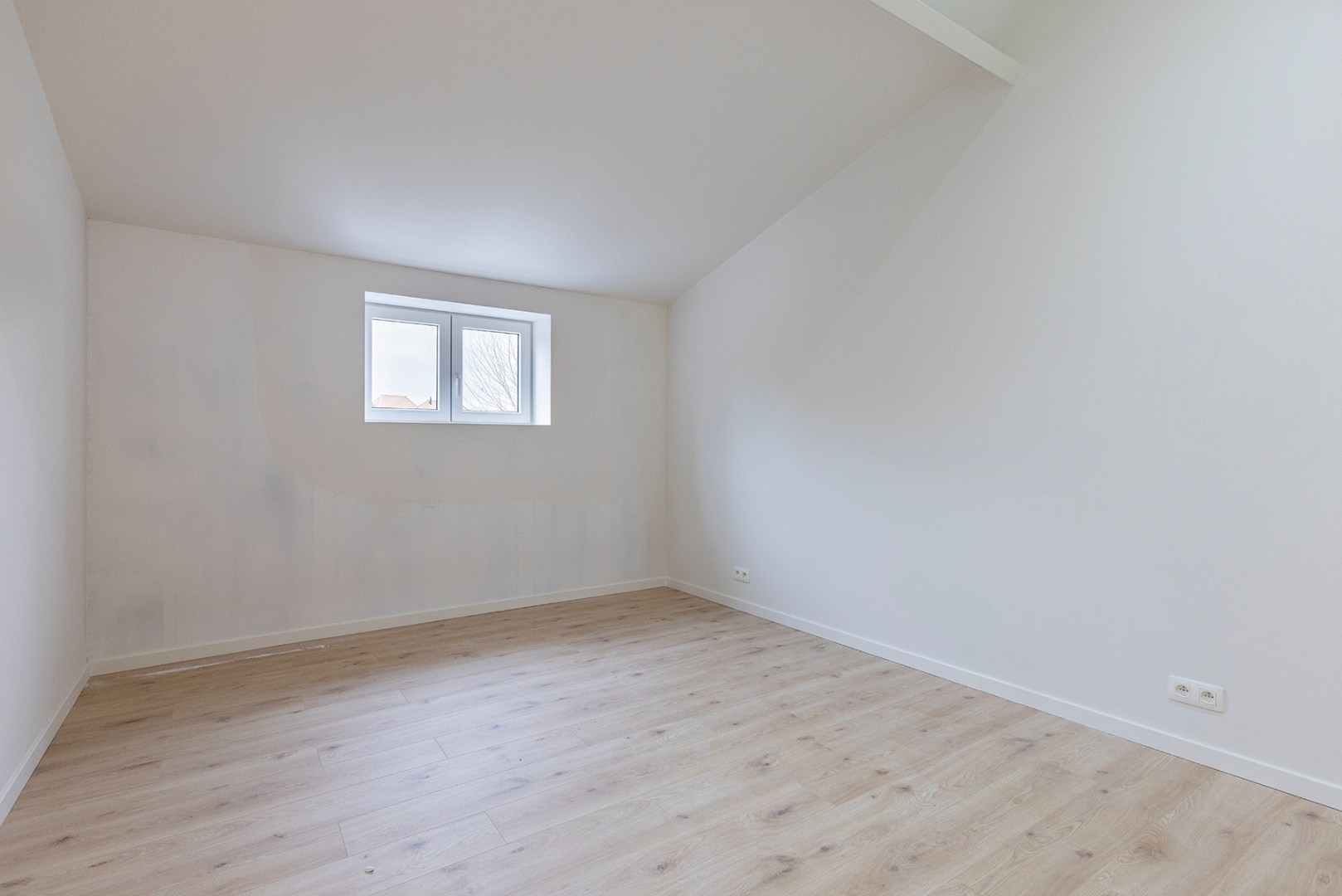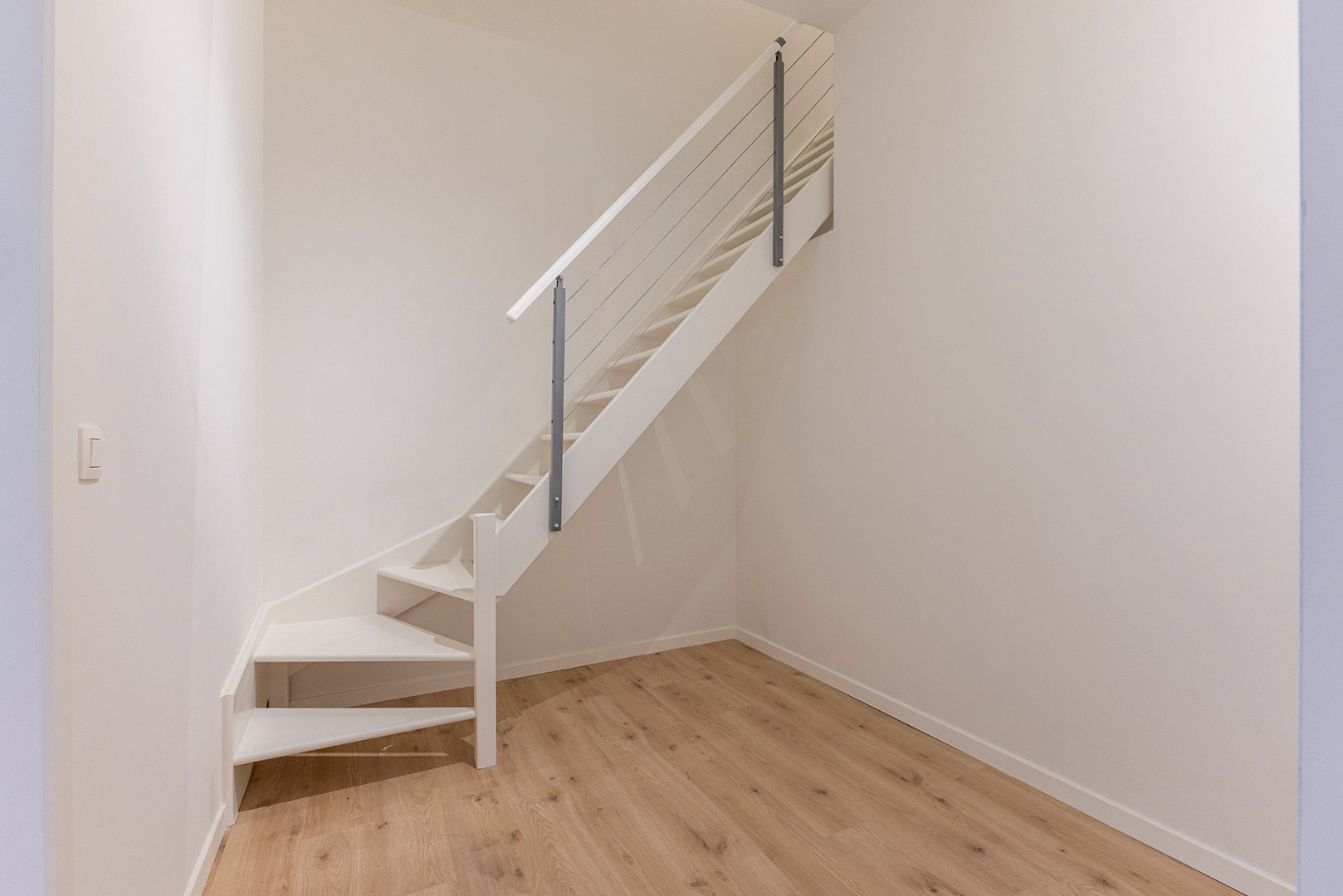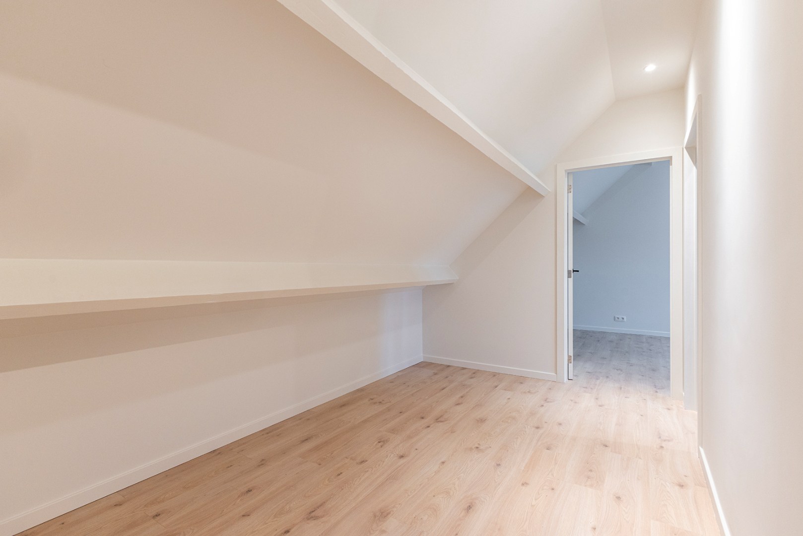 Indeling: de inkomhal geeft toegang tot het gastentoilet en de inpandige garage (12m²) die dienst doet als technische ruimte. Vervolgens komen we in de ruime woonkamer (45m²) met lichtkoepel en hoge plafonds. Aansluitend is er de ingerichte open keuken (18m²) met zicht en toegang naar de zuidwest gerichte tuin. Verder is er beneden een slaapkamer (16m²) met toegang tot het terras en de ruime badkamer (10m²) met ligbad, inloopdouche, toilet en wastafel enkel in meubel. Op de 2de verdieping zijn er nog 2 ruime slaapkamers (22+15m²).